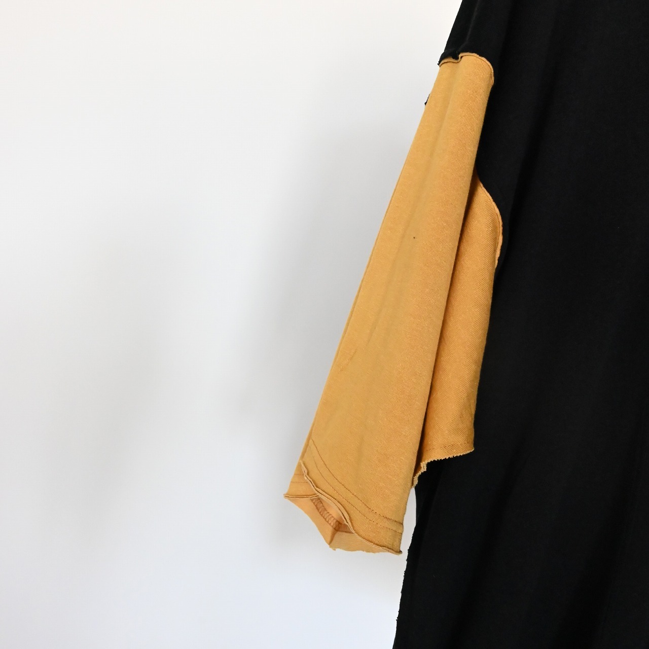 襟元の違和感、袖とポケットの切り替え配色、深めにとったサイドスリット、裾と袖の断ち切り仕様が特徴的な、コットンレーヨンのTシャツ。