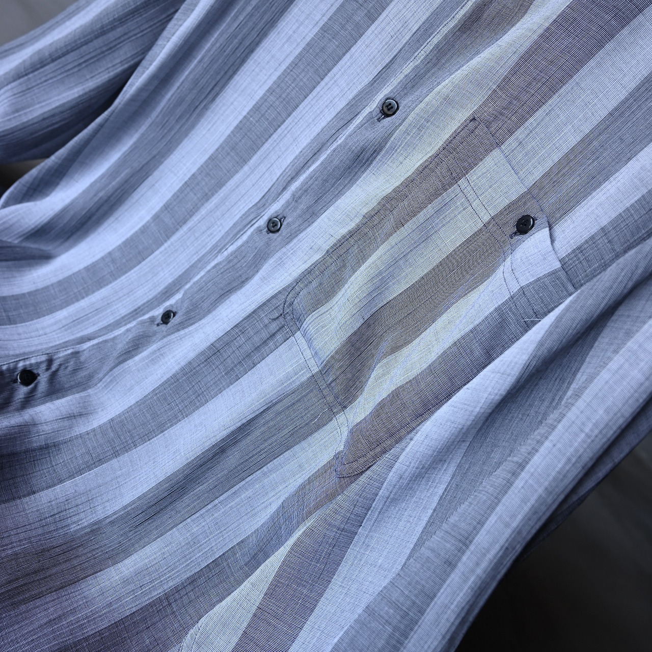 こちらはシルク×リネンの混紡生地を採用したシャツ。淡いブルーとベージュのストライプが、さりげない個性を引き立てます。