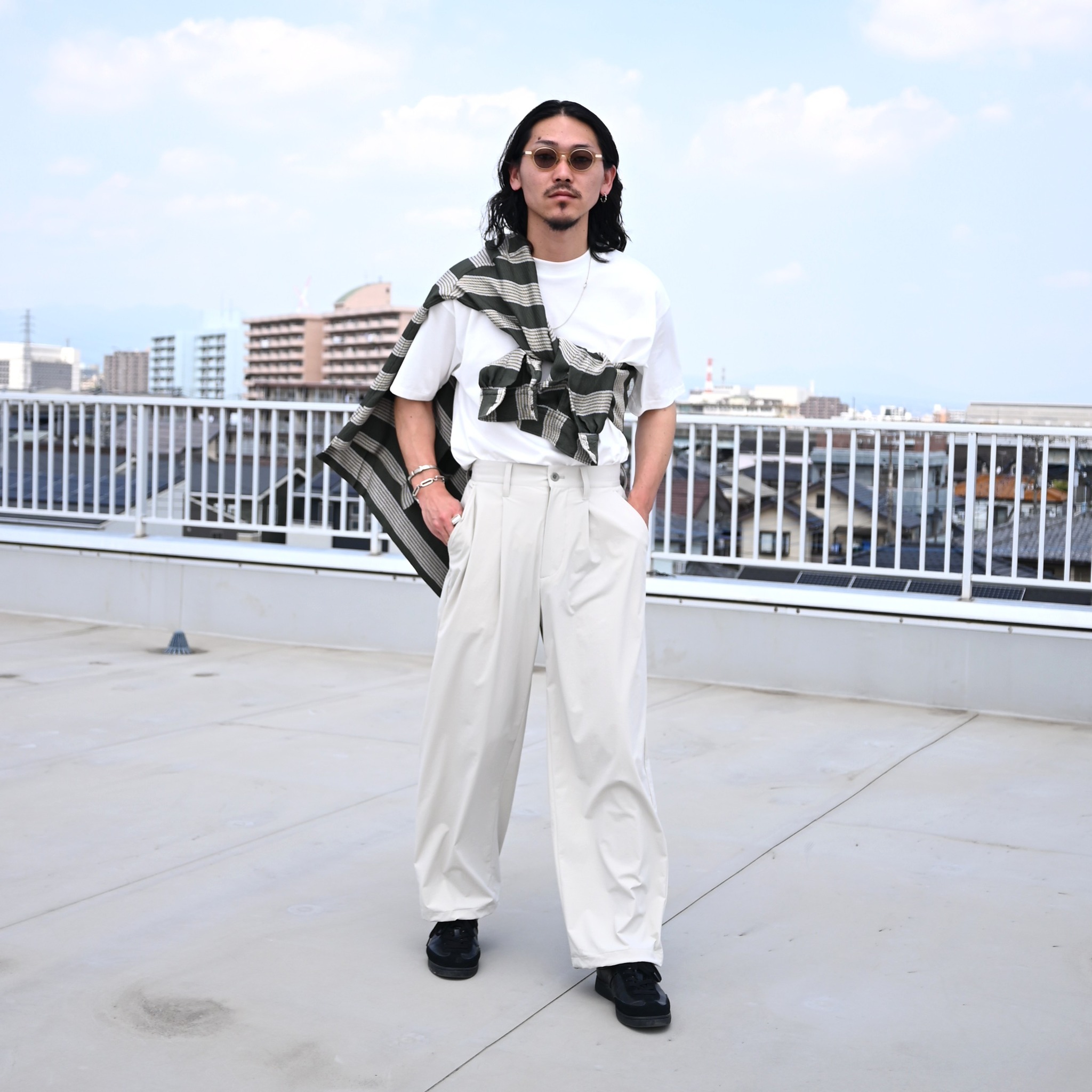 着用してるsayatomoの4wayストレッチスラックスは私も持っていますが、この気温で都内を歩き回ってもサラッとした履き心地でストレスがないです。