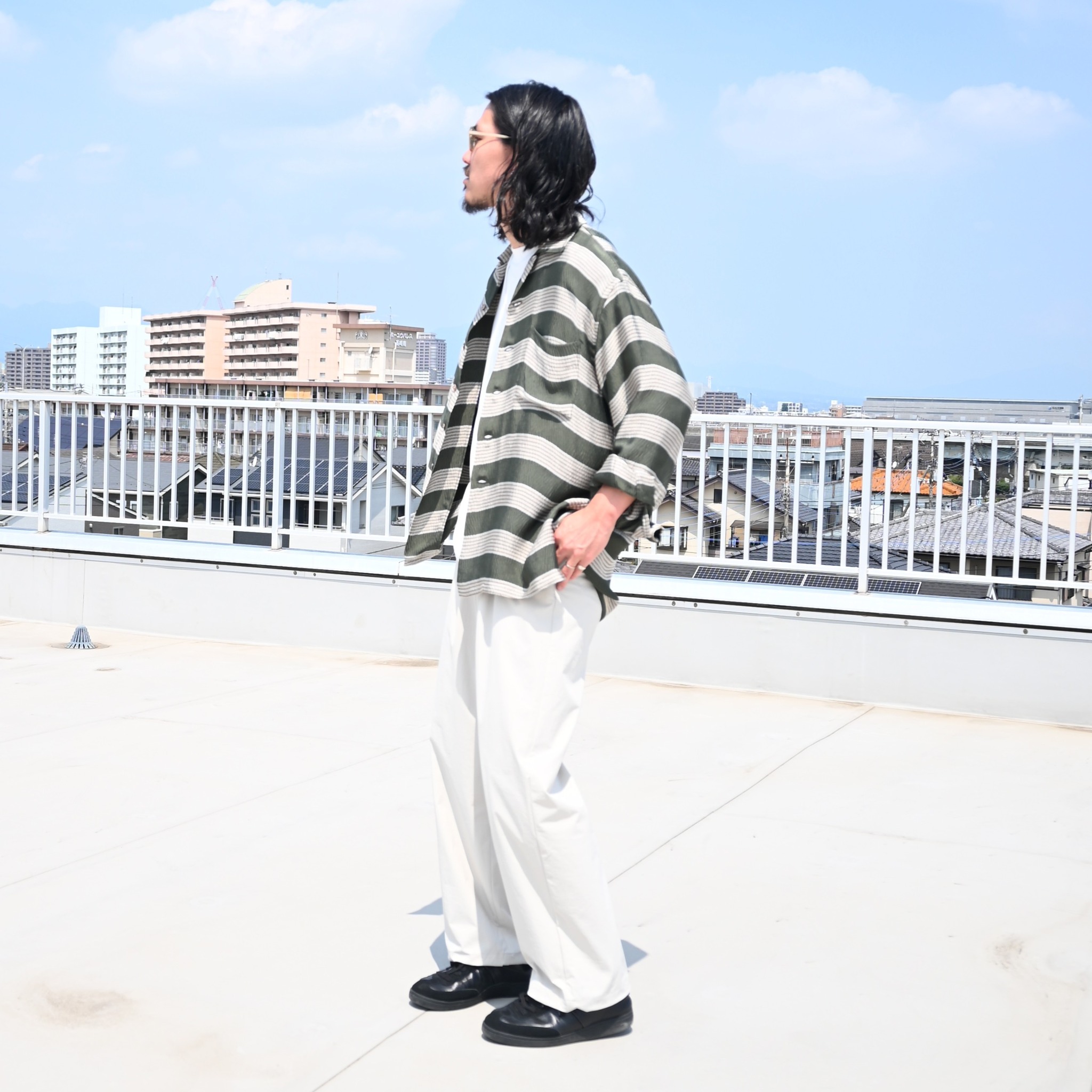 The INTÉRIM HYPER BIG RAYON LINEN SHIRTS JACKET takes center stage here, layered over the COTTON HEMP BORDER TEE.