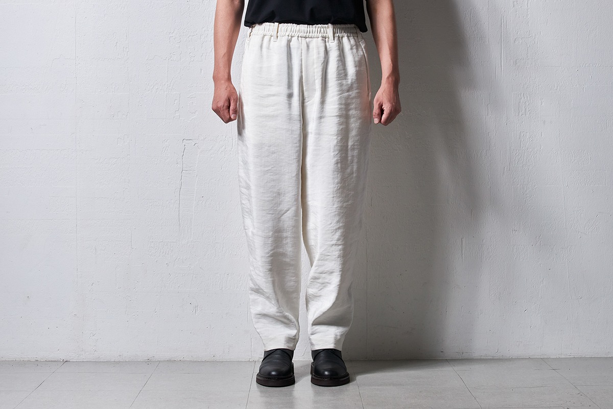後ろ身頃の中心でのみ接ぎを入れ、ワンカットで構築されたイージーパンツ。