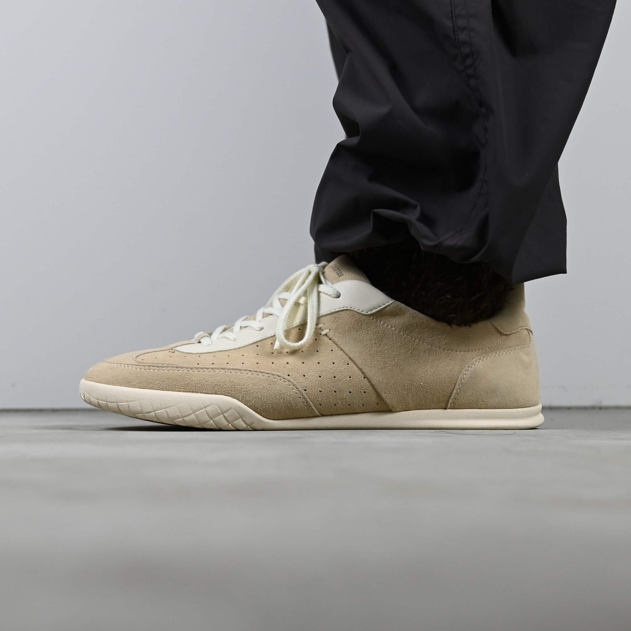 最大の特徴は、着用時にかかとの安定性を高めてくれるスクエアタイプのヒール。クラシックなドイツトレーナーの流れを汲みつつ、足元にさりげない個性を加えています。