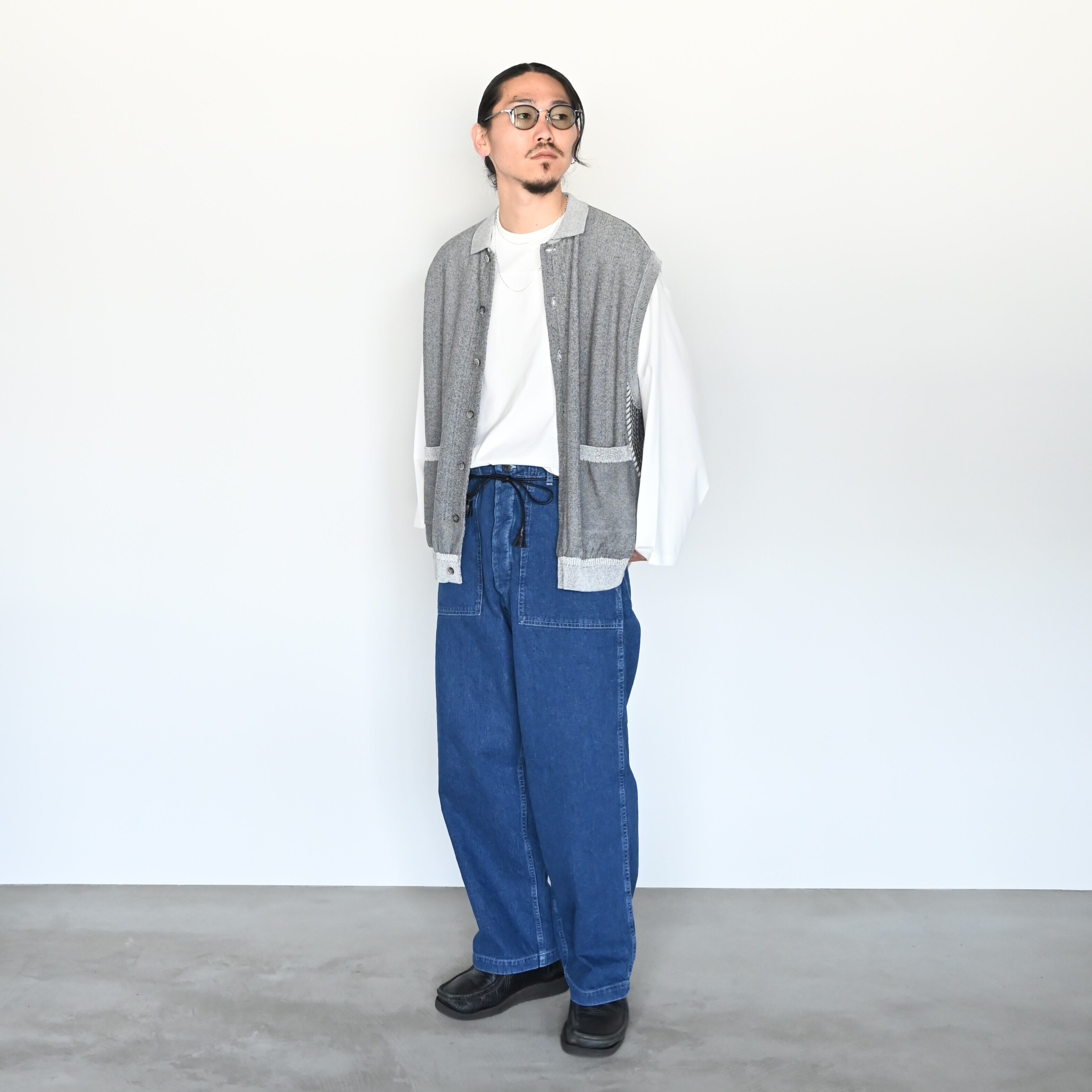 INTÉRIM(インテリム) 新作のユーズドデニムベイカーパンツをメインにスタイリング。今回はYASHIKI(ヤシキ)の Kinkai Collar Vestと同じく新作の HYPER BIG HIGH GAUGE SUVIN JERSEY L/S FOOTBALL TEE を合わせて春夏らしい、爽やかなスタイルに。ロンTEE一枚だとシンプルになりすぎなため、ニットベストを合わせて他とは違うスタイリングにいたしました。