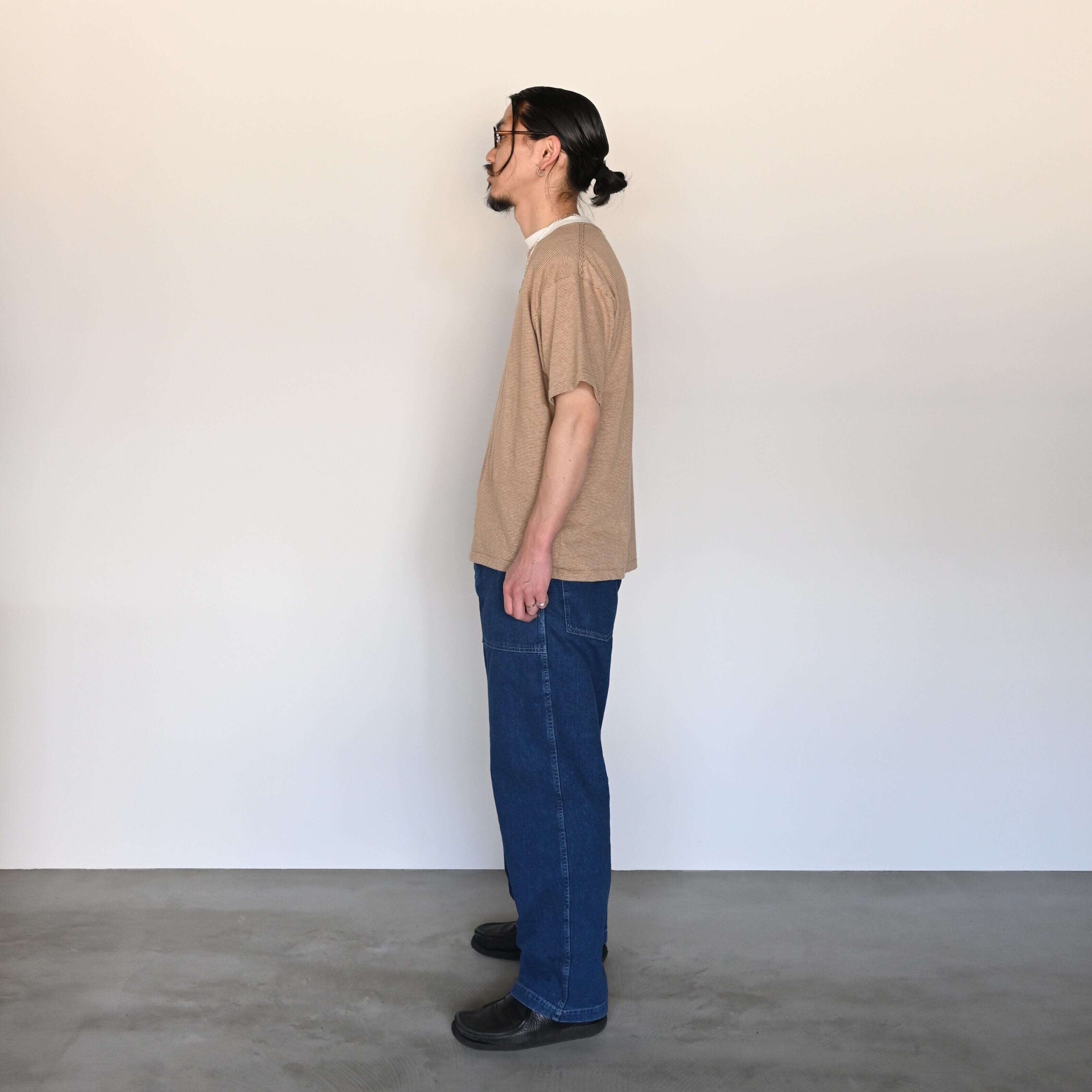 YASHIKI(ヤシキ) のRakki Collar Cardiganをメイン着用。インナーにINTÉRIM(インテリム)のCOTTON HEMP BORDER TEEを合わせて、9.5ozのミドルオンスデニムベイカーパンツを合わせて春夏らしいコーディネートに。タスコシルバーも合わせることで、小物も意識して使用。