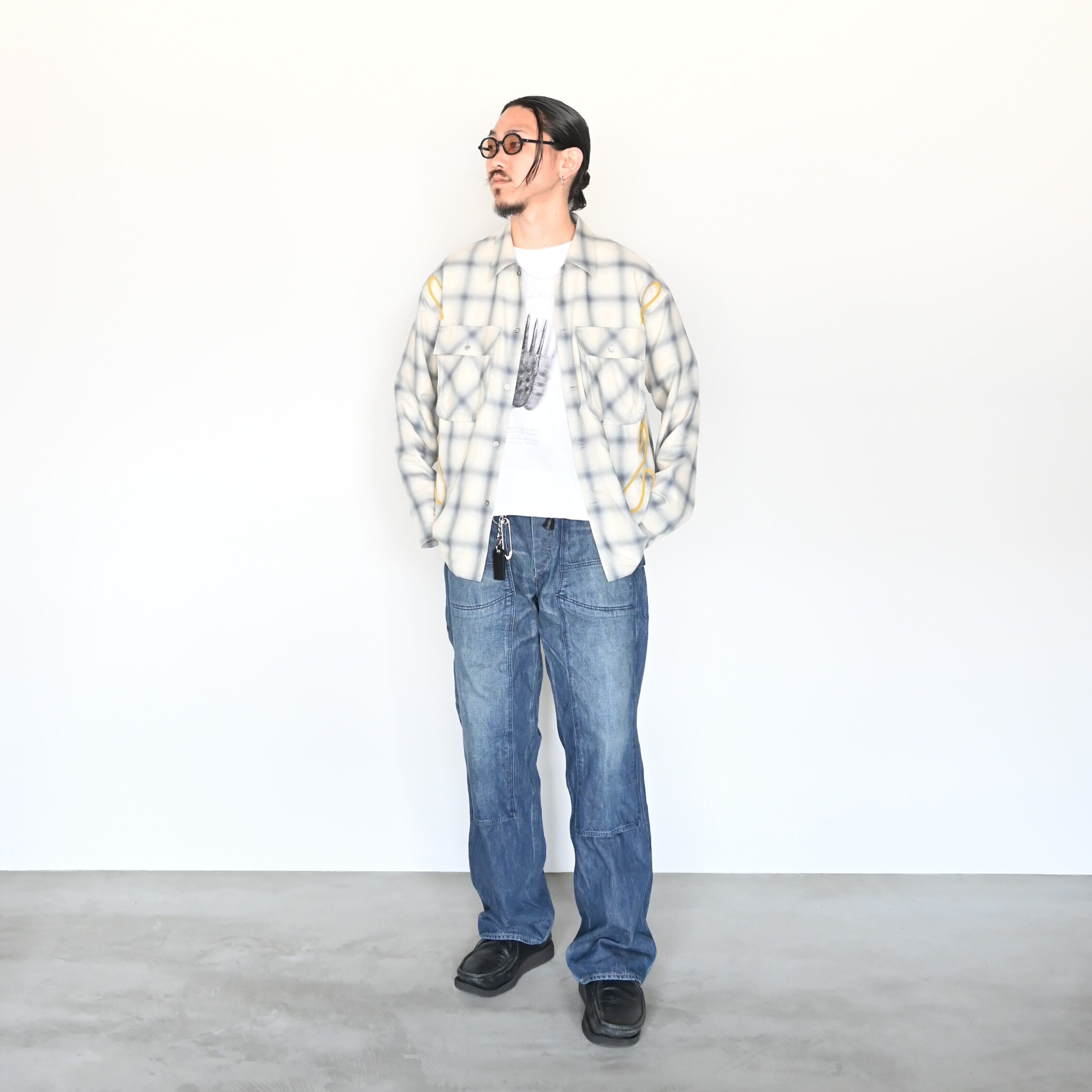 本日の出勤服を撮影してみました。Leh(レー)の Embroidery Check Shirtsをメインに、インナーにはデザイナーのコレクション仮面をモチーフにしたTシャツ。バックには手刺繡による×が施されており、後ろからみてもオシャレなTシャツ。パンツはOLDJOE(オールドジョー)のDOUBLE CLOTH SNUGGER TROUSERで元から加工されてますが、洗濯を10回以上していて、いい感じの色落ち具合になってきました。