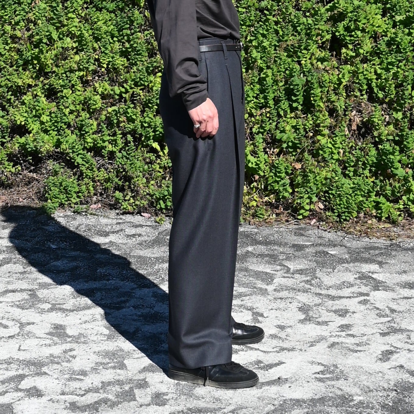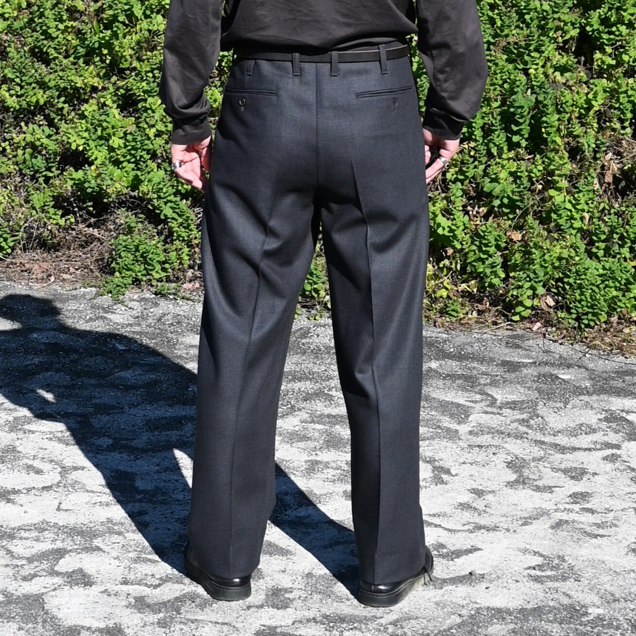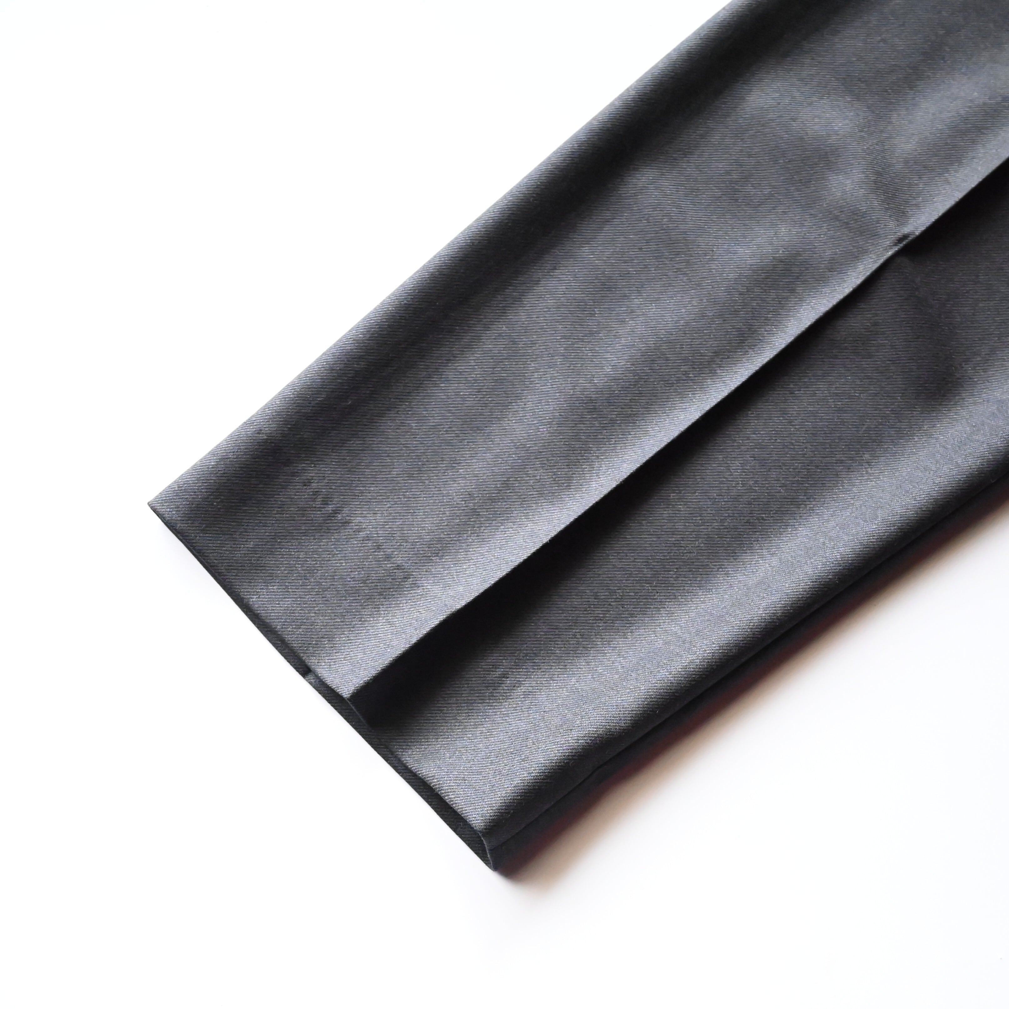・かなり太くとったタックとクリースの繋がりや、パターン上タテの地の目に合わずクリースが湾曲しているデザインが、ウールの美しい落ち感で、より一層シルエットを際立たせている