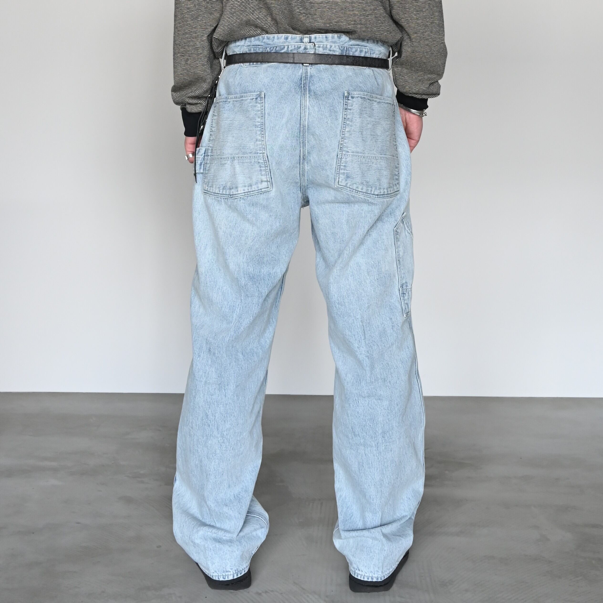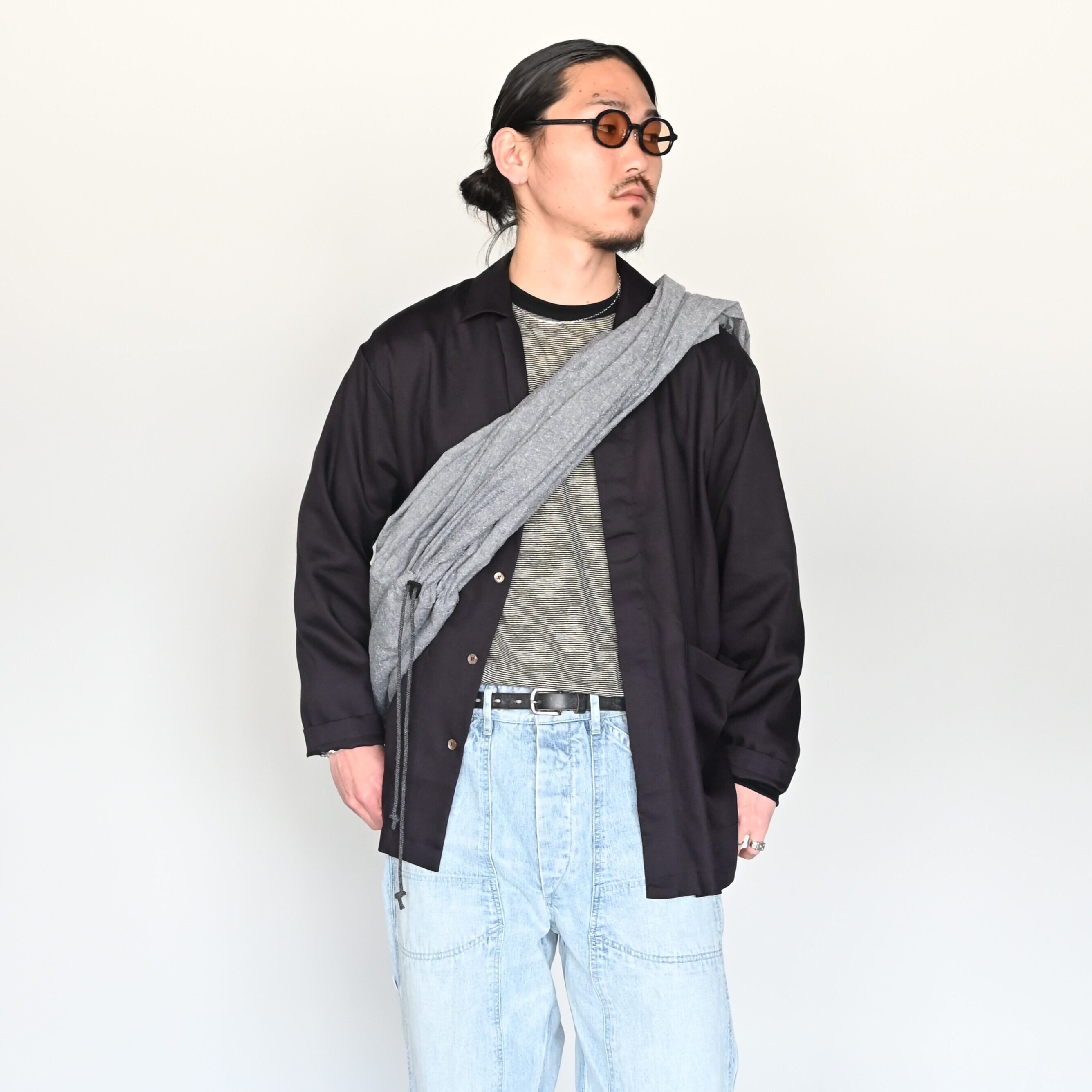 INTÉRIM /(インテリム)レーヨンリネンオックス生地を使用したパープルネイビーのシャツジャケットをメインにインナーにコットンヘンプボーダーのロングスリーブシャツを合わせ、OLDJOE(オールドジョー)のDOUBLE CLOTH SNUGGER TROUSERライトインディゴを合わせました。パンツを明るいカラーにすることで春夏らしいスタイリングに。