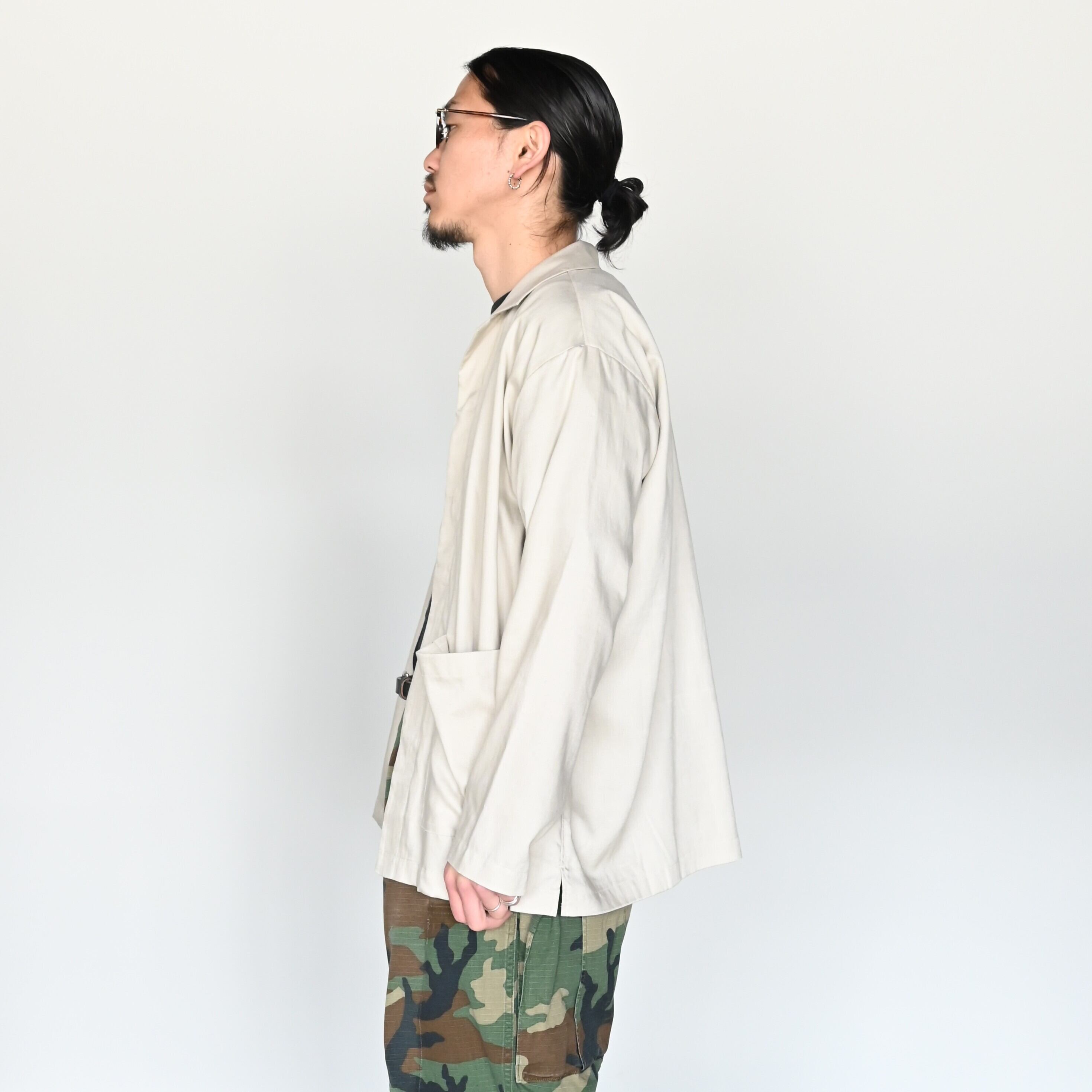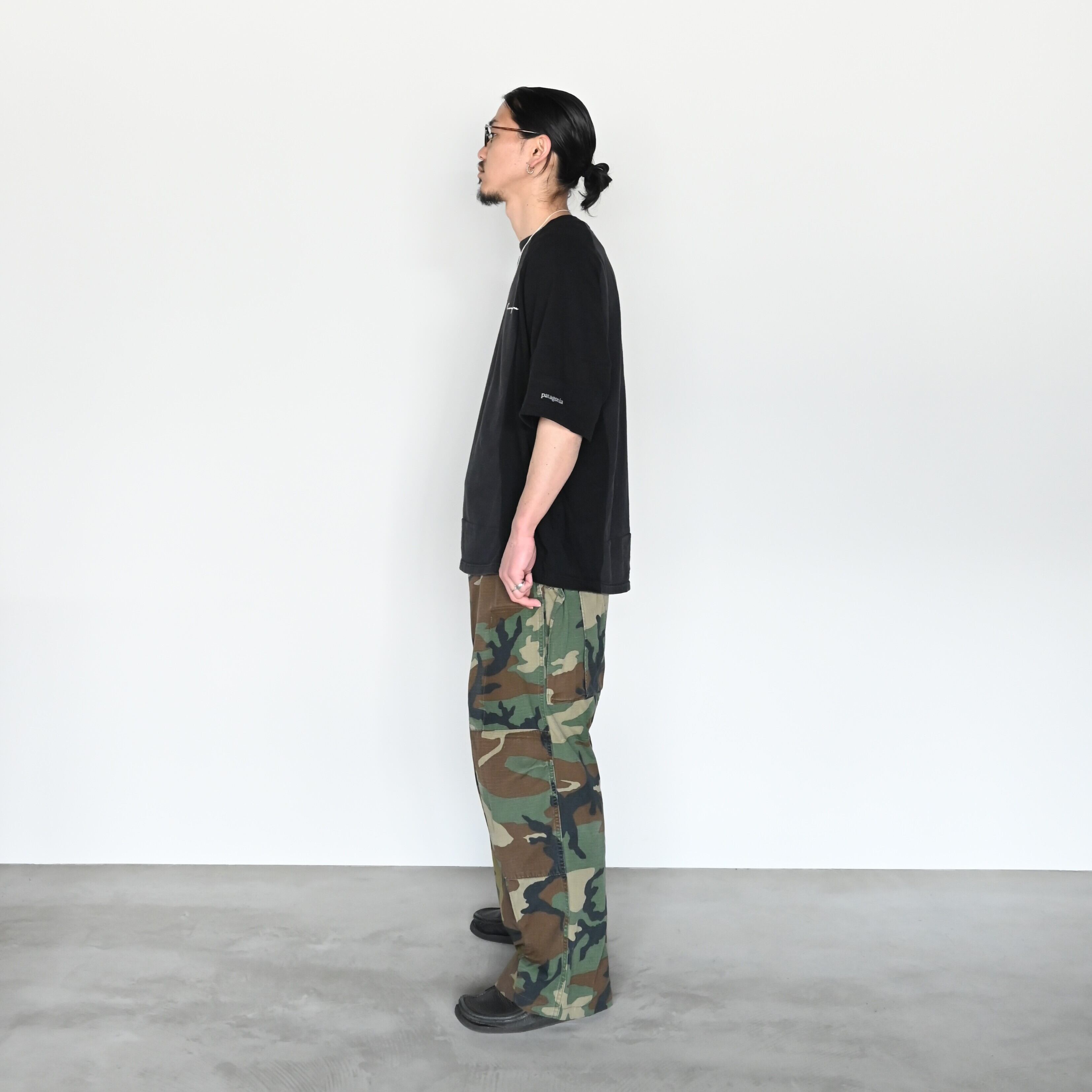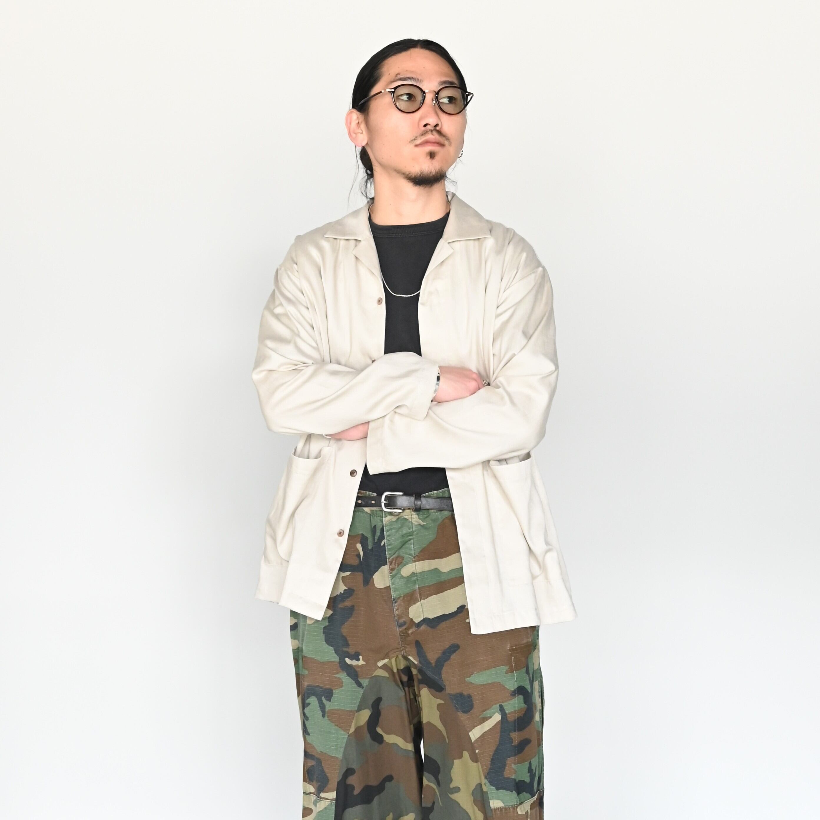 CHANGES(チェンジーズ)のREMAKE CARGO PANTSベージュをベースとしてスタイリング。インナーも同じくチェンジーズのRAGLAN SLEEVES POCKET TEE MULTI champion。このTシャツがかなりおもしろく、Patagoniaとchampionを共存させたありえない一着です。着るとバランスがとてもよく、かっこいいです。スタイリングをしめるために、INTÉRIM(インテリム)のHYPER BIG RAYON LINEN SHIRTS JACKET、上からヴィンテージのグーチギンガムチェックロングスリーブシャツデッドストックを合わせました。