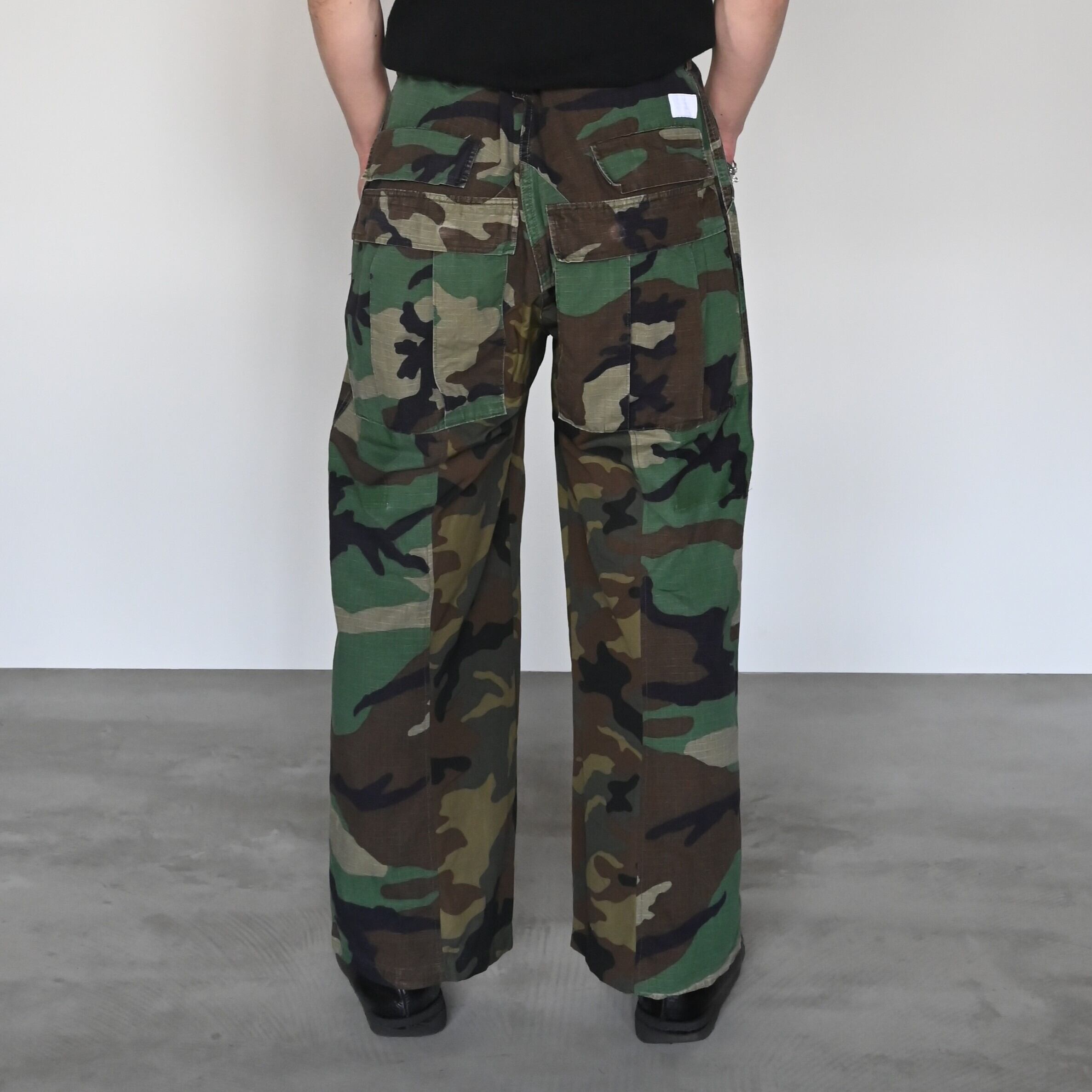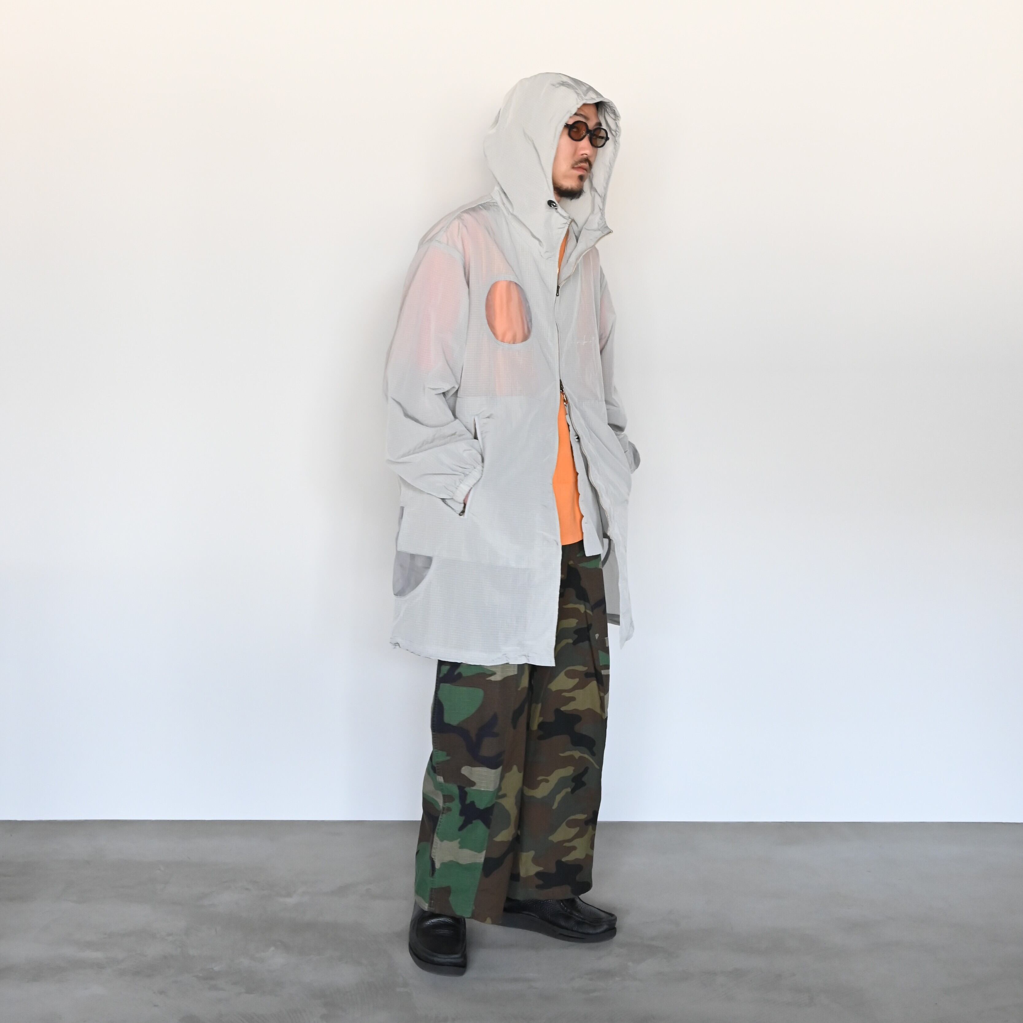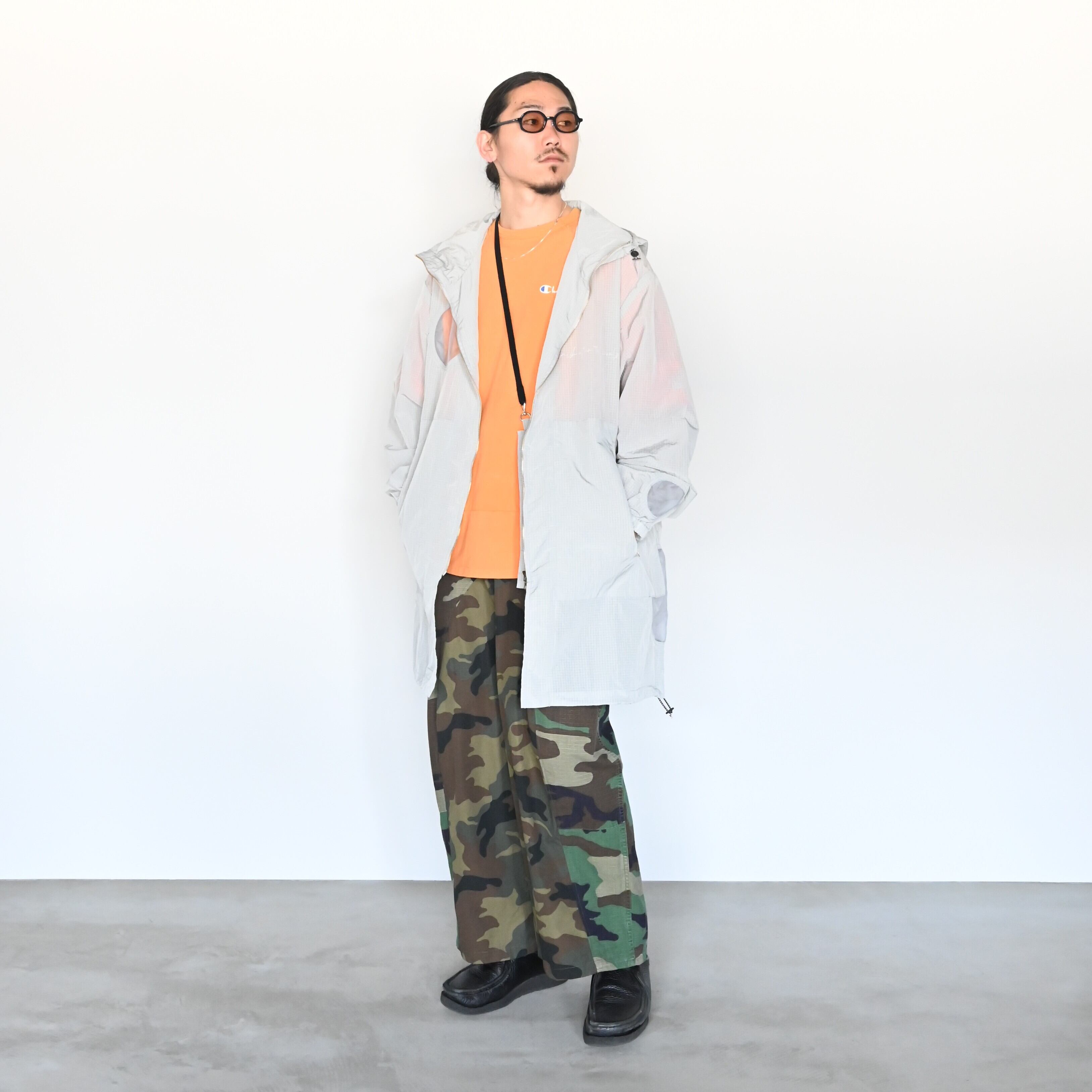Leh(レー)のRain Hood Coatをメイン着用。インナーにCHANGES(チェンジーズ)のRAGLAN SLEEVES POCKET TEE MULTI championを合わせ、REMAKE CARGO PANTS(3)を着用。グレー、オレンジ、カーキの異色スタイルです。