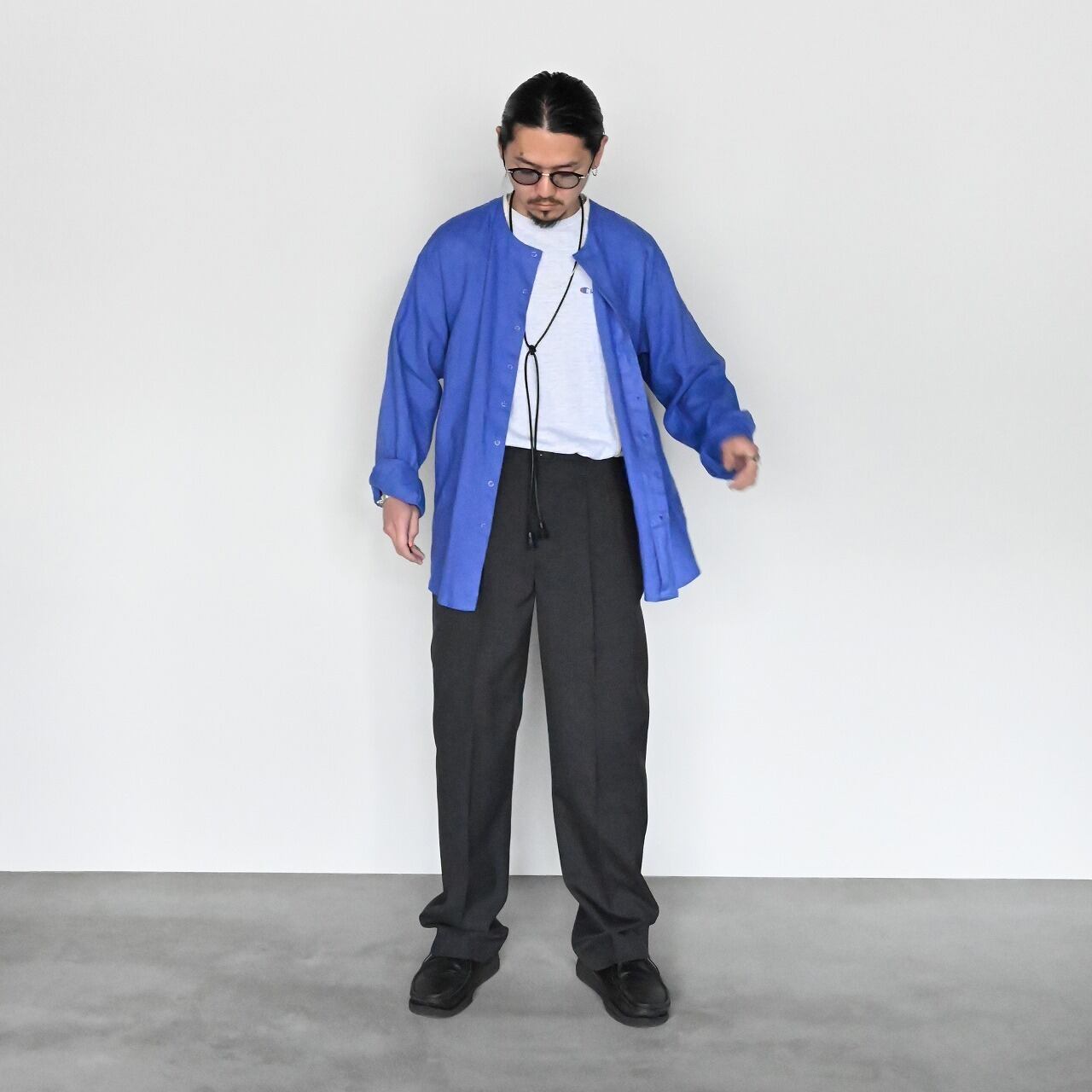 (グーチロングスリーブシャツデッドストック)リネン100%、ブルーカラーが鮮やかな長袖シャツをメイン着用。OLD JOE(オールドジョー)のHIDDEN LOOP BUDDY TROUSERを合わせてきれい目にしつつ、インナーははずしでCHANGES / RAGLAN SLEEVES POCKET TEE MULTI championを合わせました。