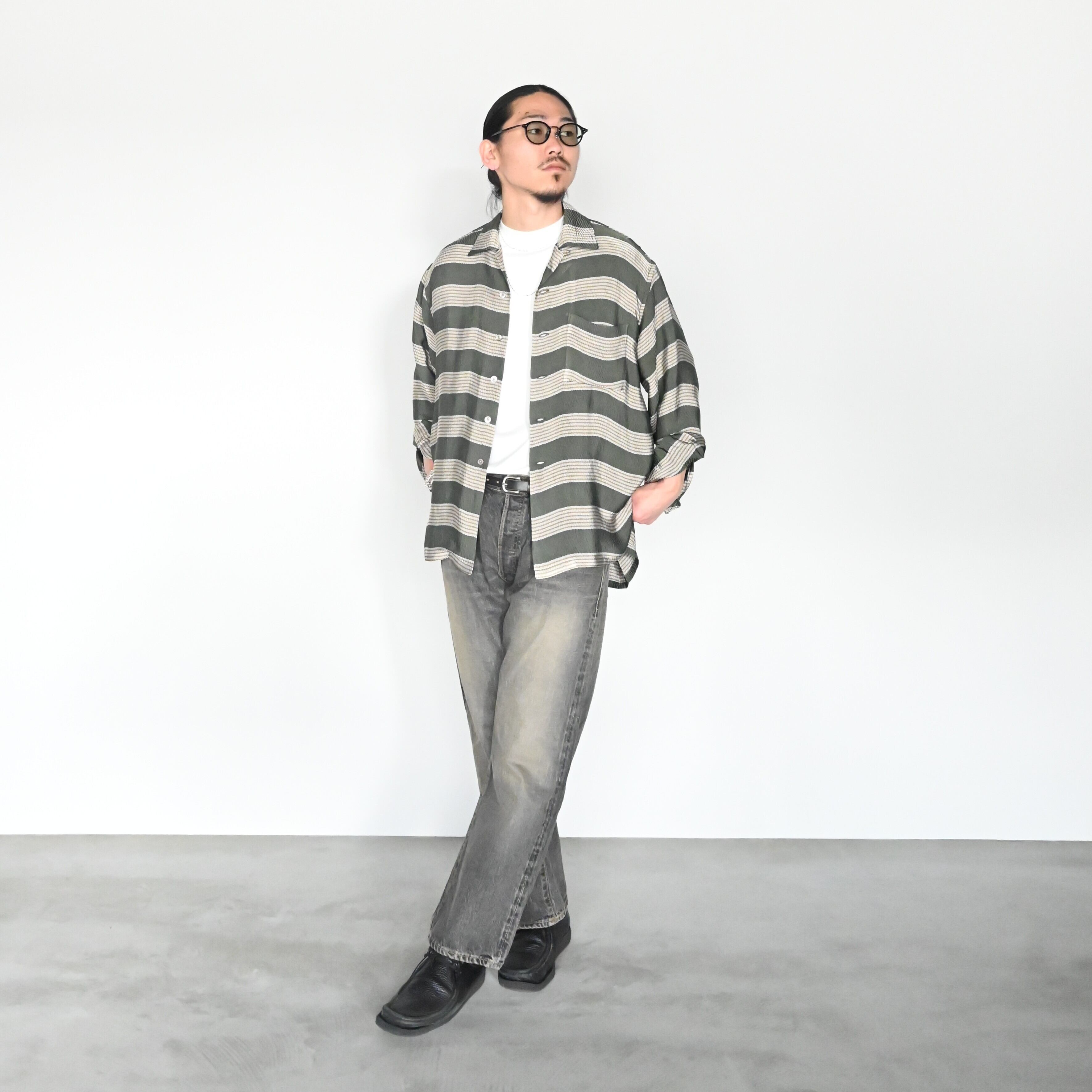 INTÉRIM(インテリム)のHYPER BIG VISCOSE STRIPE 60s OPEN COLLAR SHIRTをメイン着用。全身インテリムのスタイリングでインナーにはHIGH GAUGE SUVIN JERSEY S/S TEE、デニムはSHABBY VINTAGE "1947XX" SHUTTLE DENIMを合わせました。上品なシャツにデニムを合わせることでカジュアルダウンさせたスタイル。
