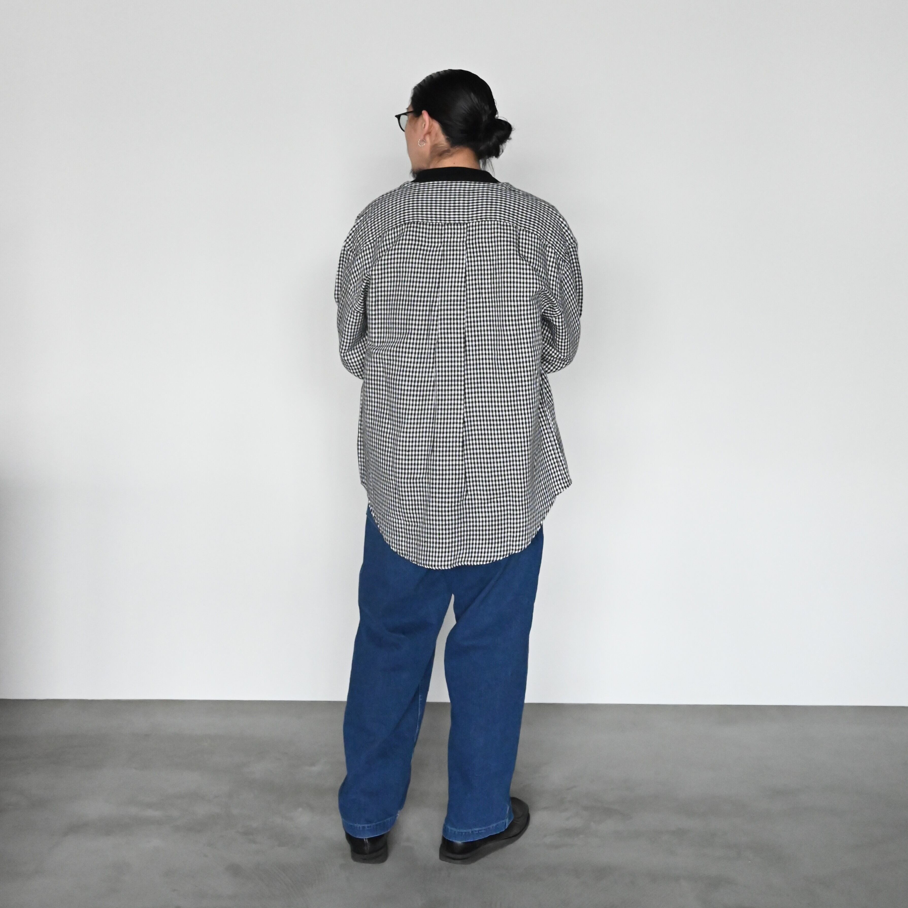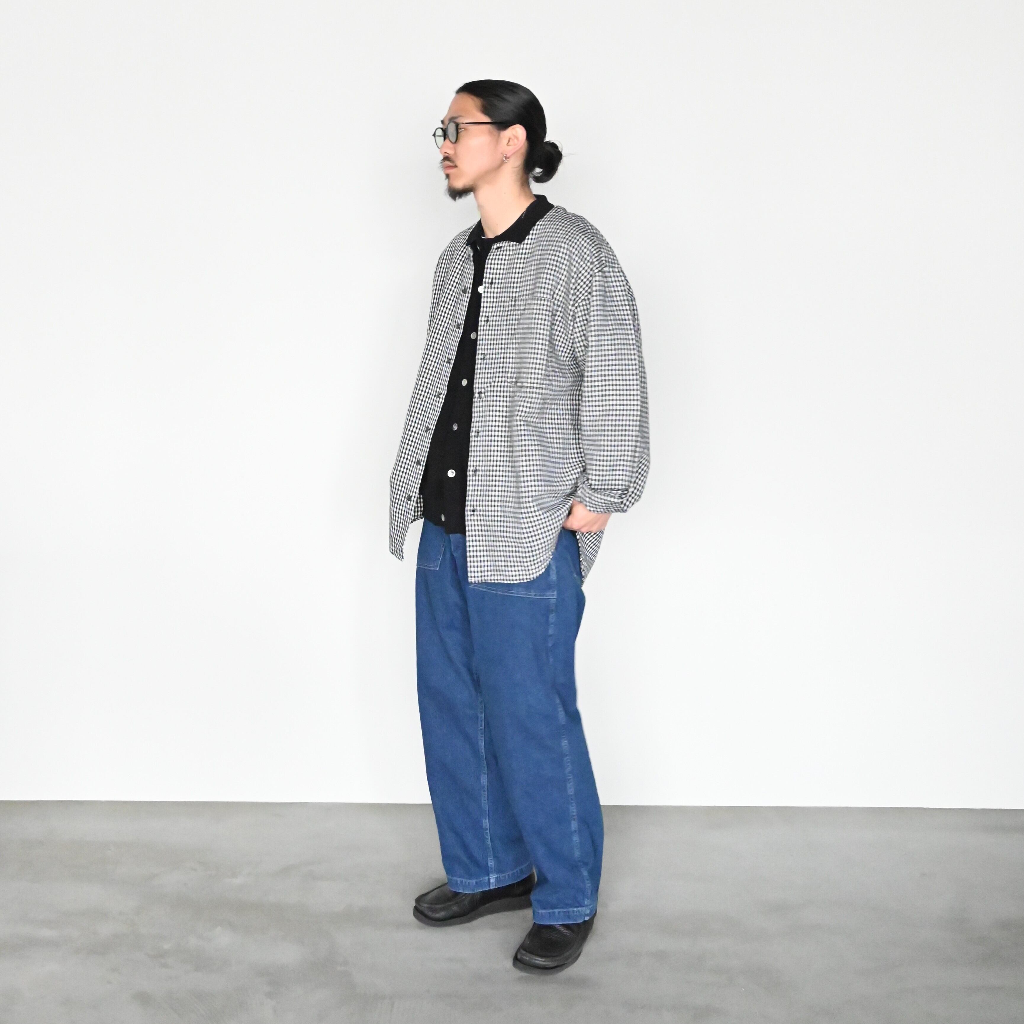 (グーチギンガムチェックロングスリーブシャツデッドストック)をメイン着用。インナーにYASHIKI(ヤシキ)のKinkai Collar Vest、KUON(クオン)のBoro Patched Teeを合わせ、INTÉRIM(インテリム)のUSED SLUB YARN DENIM BAKER PANTSを着用。カジュアルスタイル。