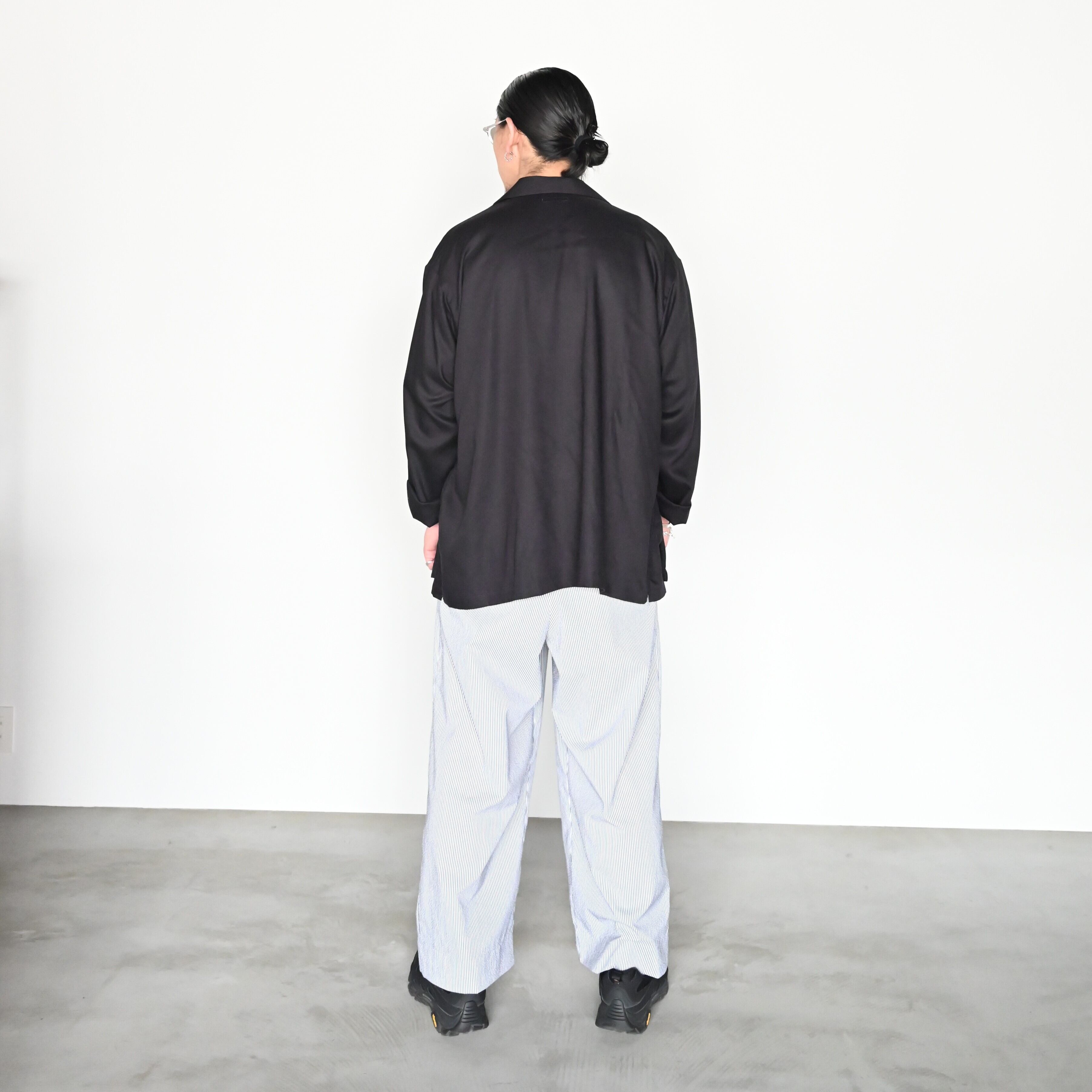 The slacks feature an innovative design that allows you to change the silhouette with the two front buttons. For this look, we styled them with the front button fastened to create pleats, incorporating a subtle touch of traditional Japanese aesthetic.