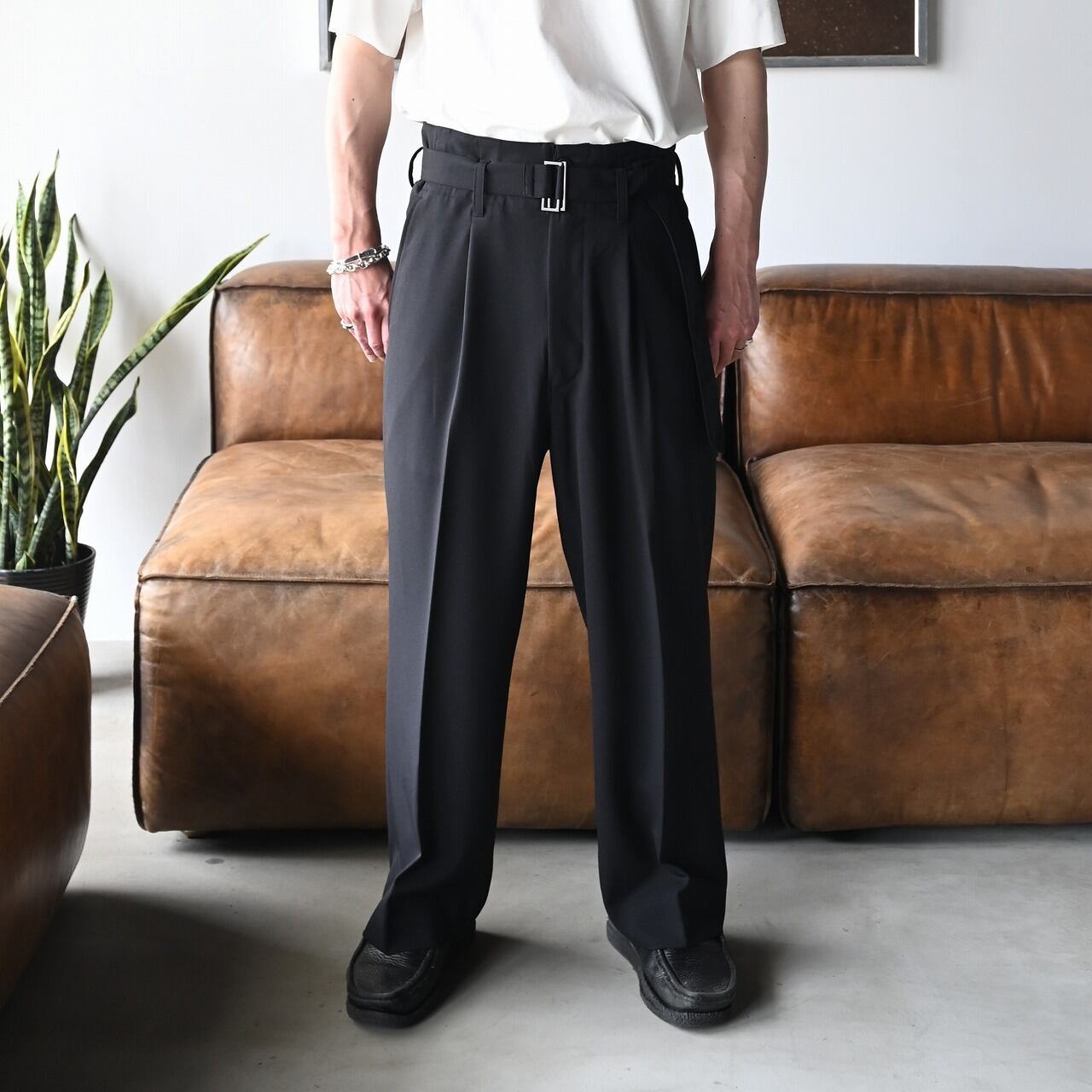 KUON(クオン)の Arimatsu Shibori Camp Collar Shirtをメイン着用。インナーに山内(ヤマウチ)の強撚フリーカットポンチ・ショートスリーブTシャツを合わせ、スラックスはKUON(クオン)のポリエステル100%のベルト付きスラックスを着用いたしました。