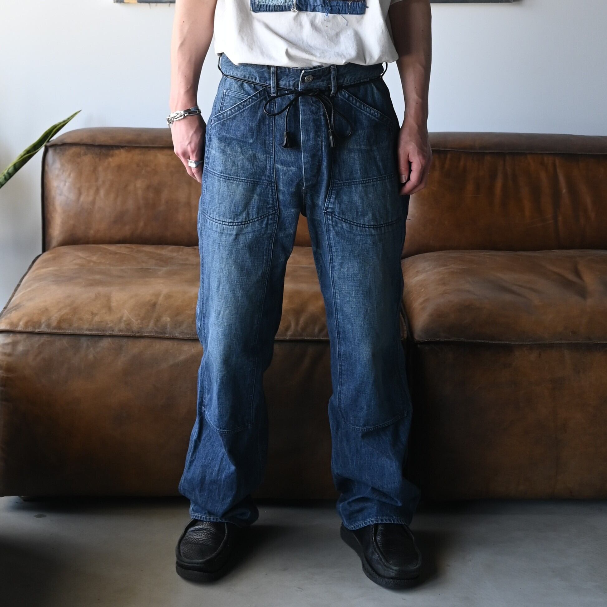 INTÉRIM(インテリム)のHYPER BIG RAYON LINEN SHIRTS JACKETをメインにインナーにKUON(クオン)の Boro Patched Teeを合わせ、OLDJOE(オールドジョー)のDOUBLE CLOTH SNUGGER TROUSERを着用。