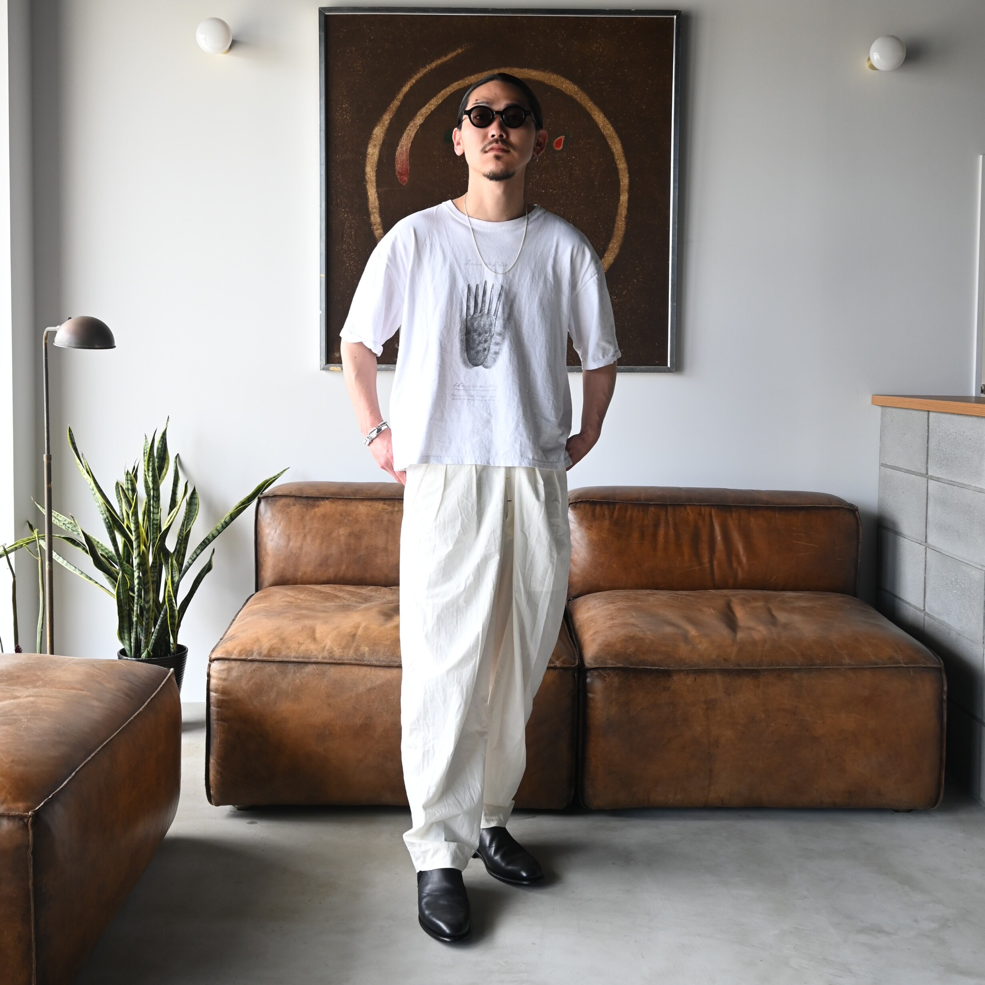 私物のLEH(レー)で全身をまとめたコーディネート。春夏は自然と明るめの色をきたくなりますが、バッグとシューズ、サングラスはブラックでまとめてスタイルを引き締めました。全身LHEはかっこいいですね。ちなみにレザーシューズはオールドジョー新作のスリッポンです。
