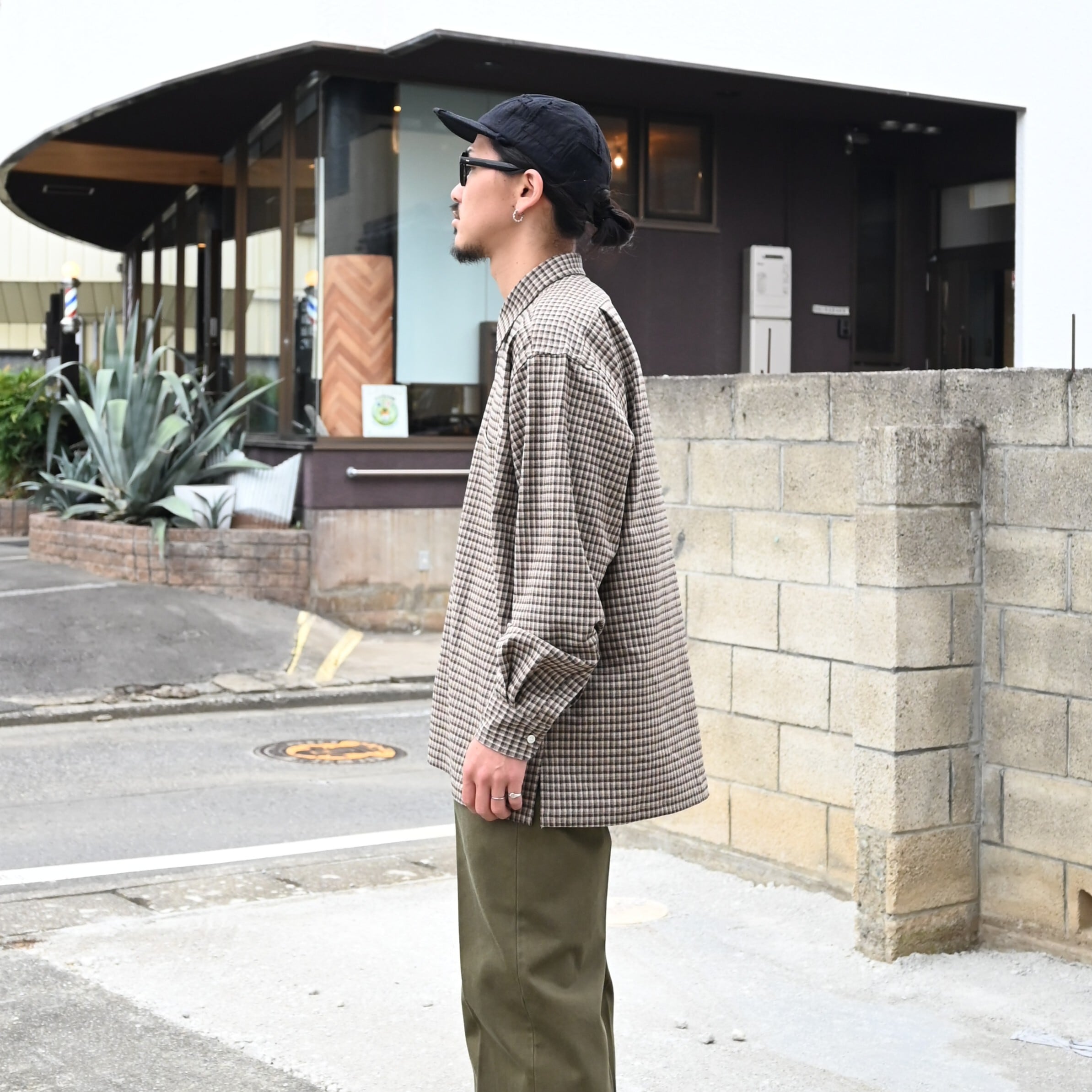 ・ゆとりのあるサイジングながらサイドスリットを⼊れ、収まりよく仕上げている