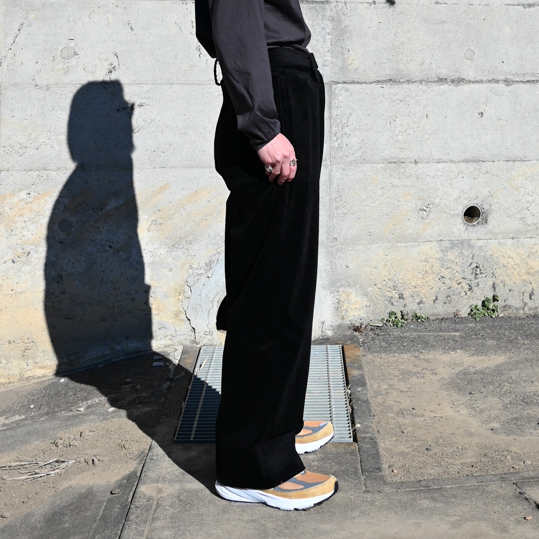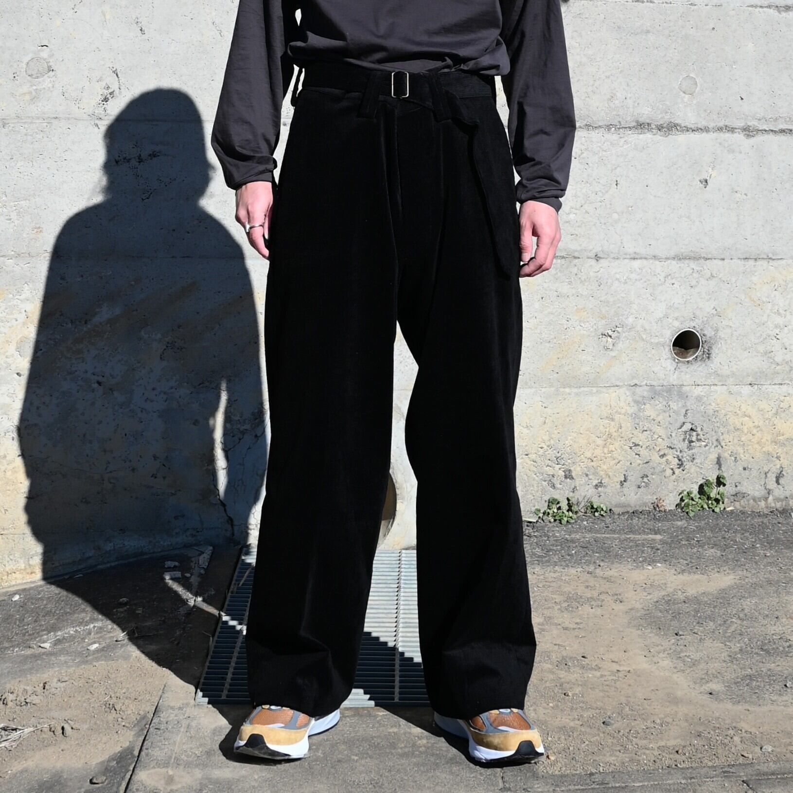 ・たっぷりとしたシルエットと⼗分な⻑さのレングスで、⽣地の魅⼒を存分に味わってもらいたいパンツ