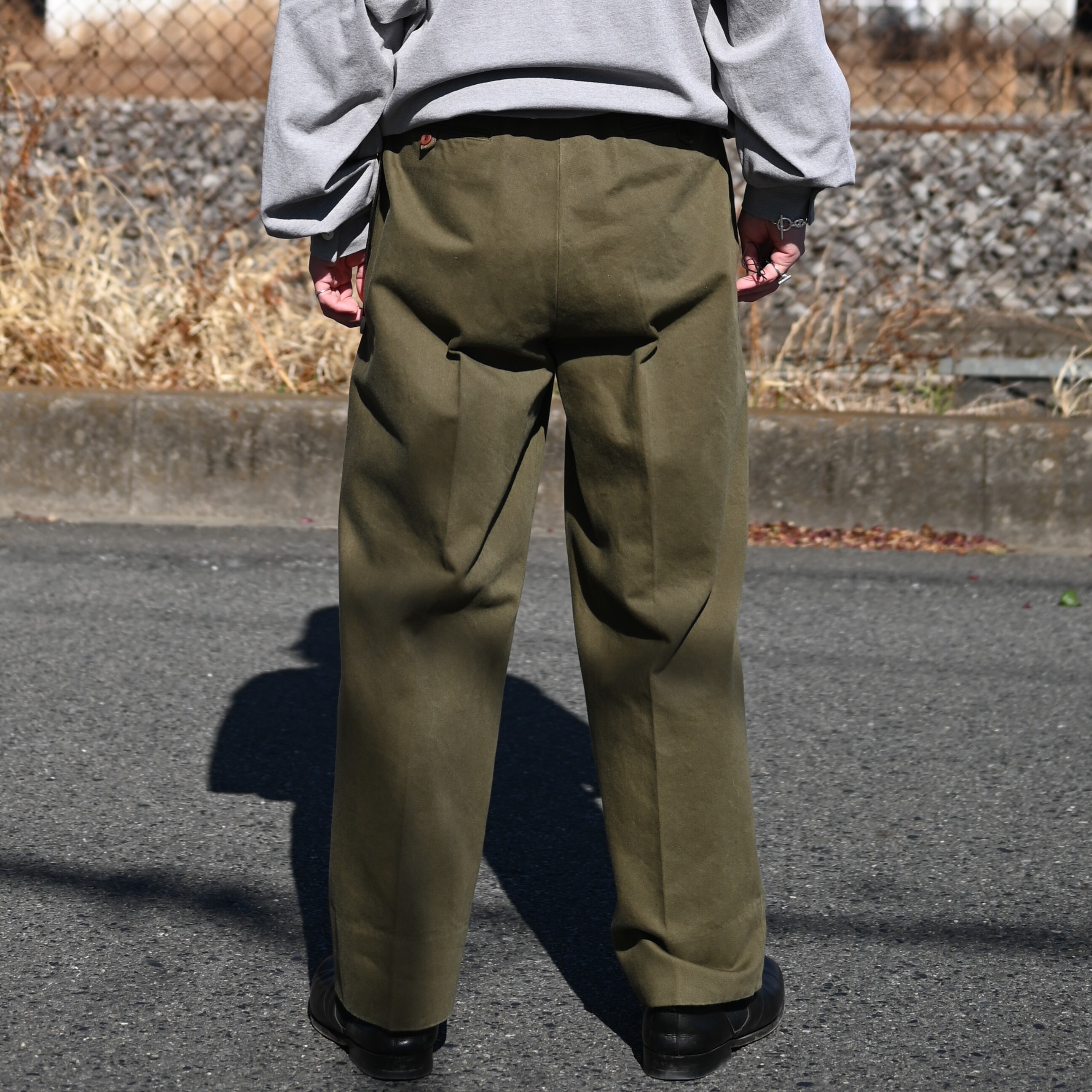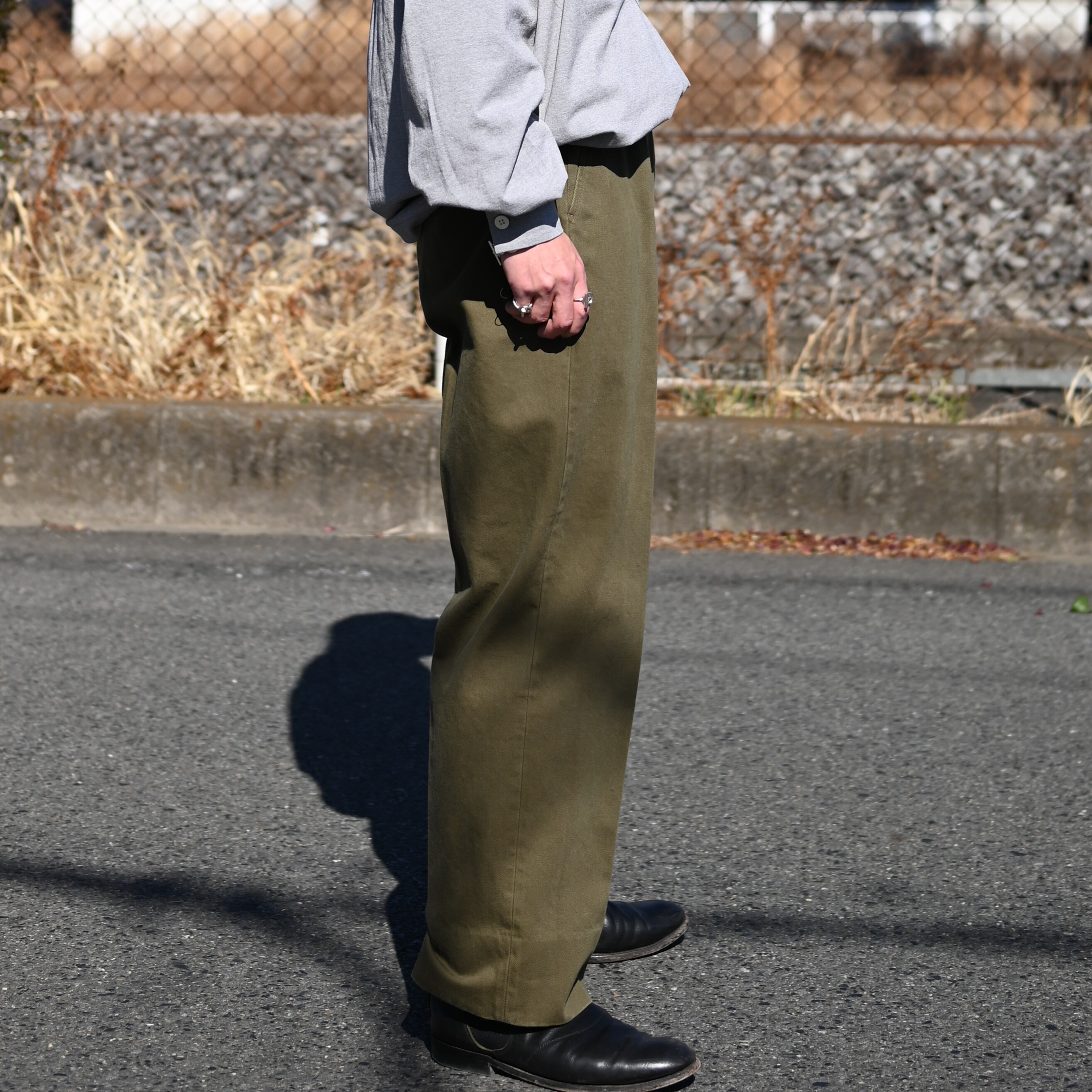 ・50年代フランス軍の名作のパターンにならい、股上とわたり、ヒップまわりのボリュームをやや⼤ きめにとり、すそにかけてゆるやかにテーパードする1タックトラウザーズ