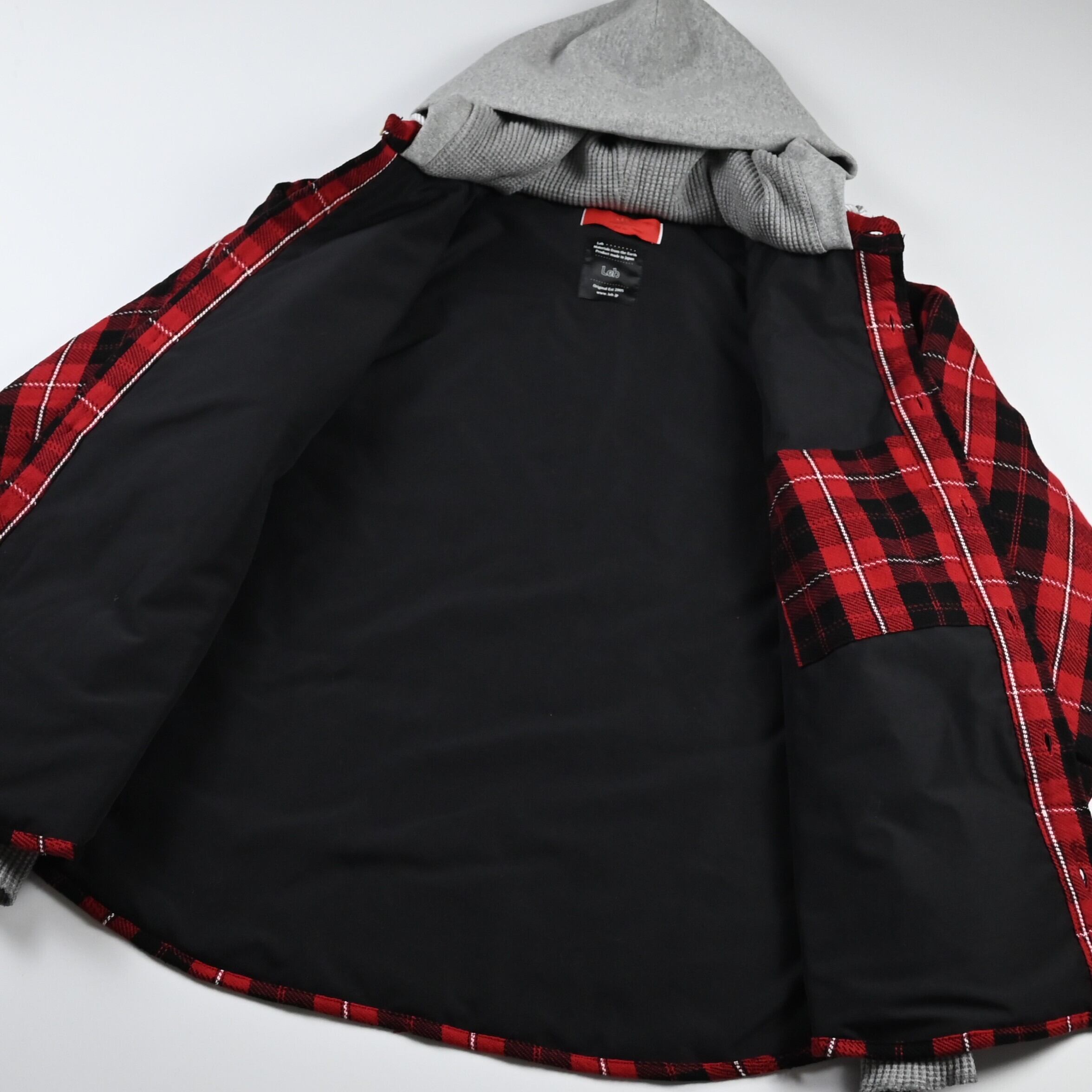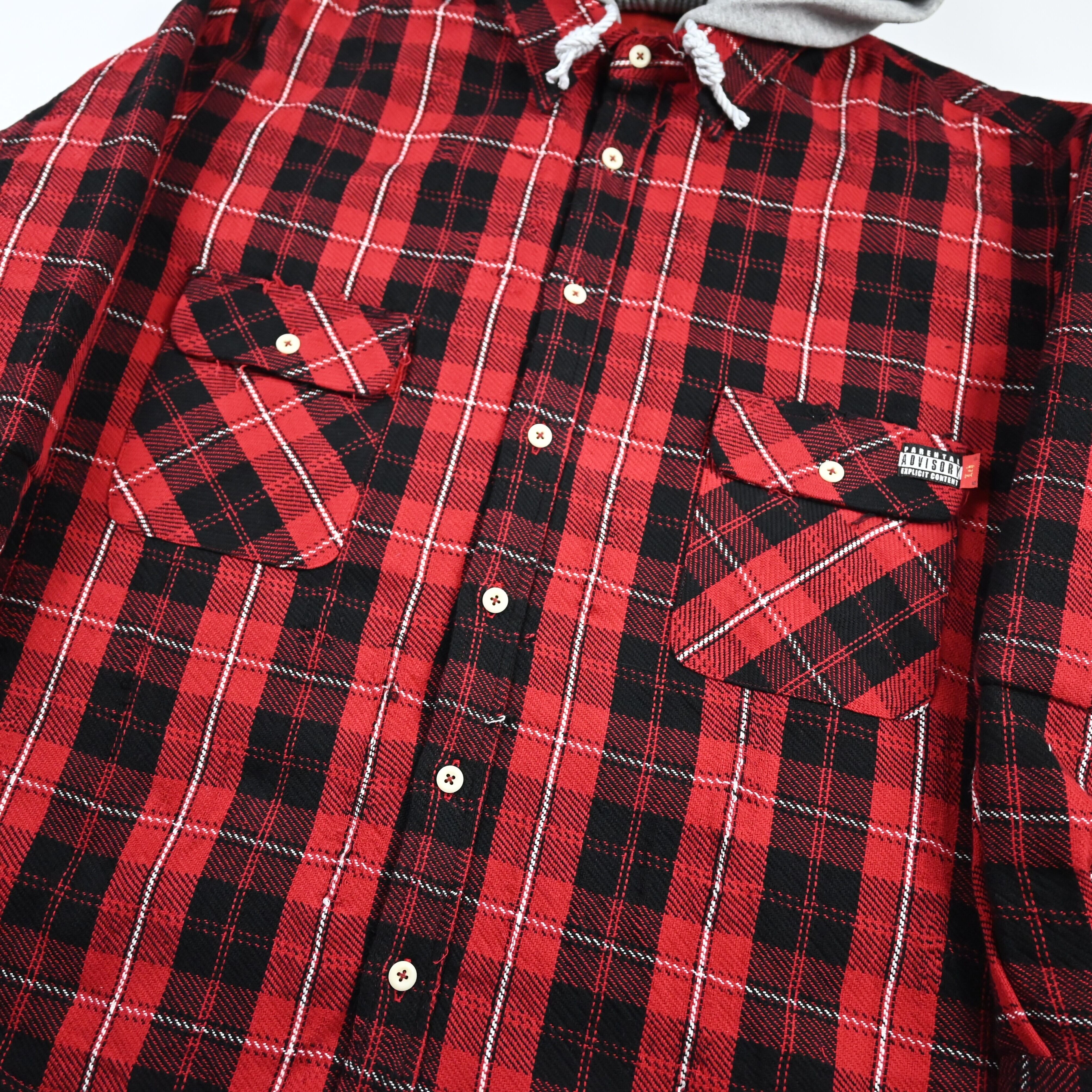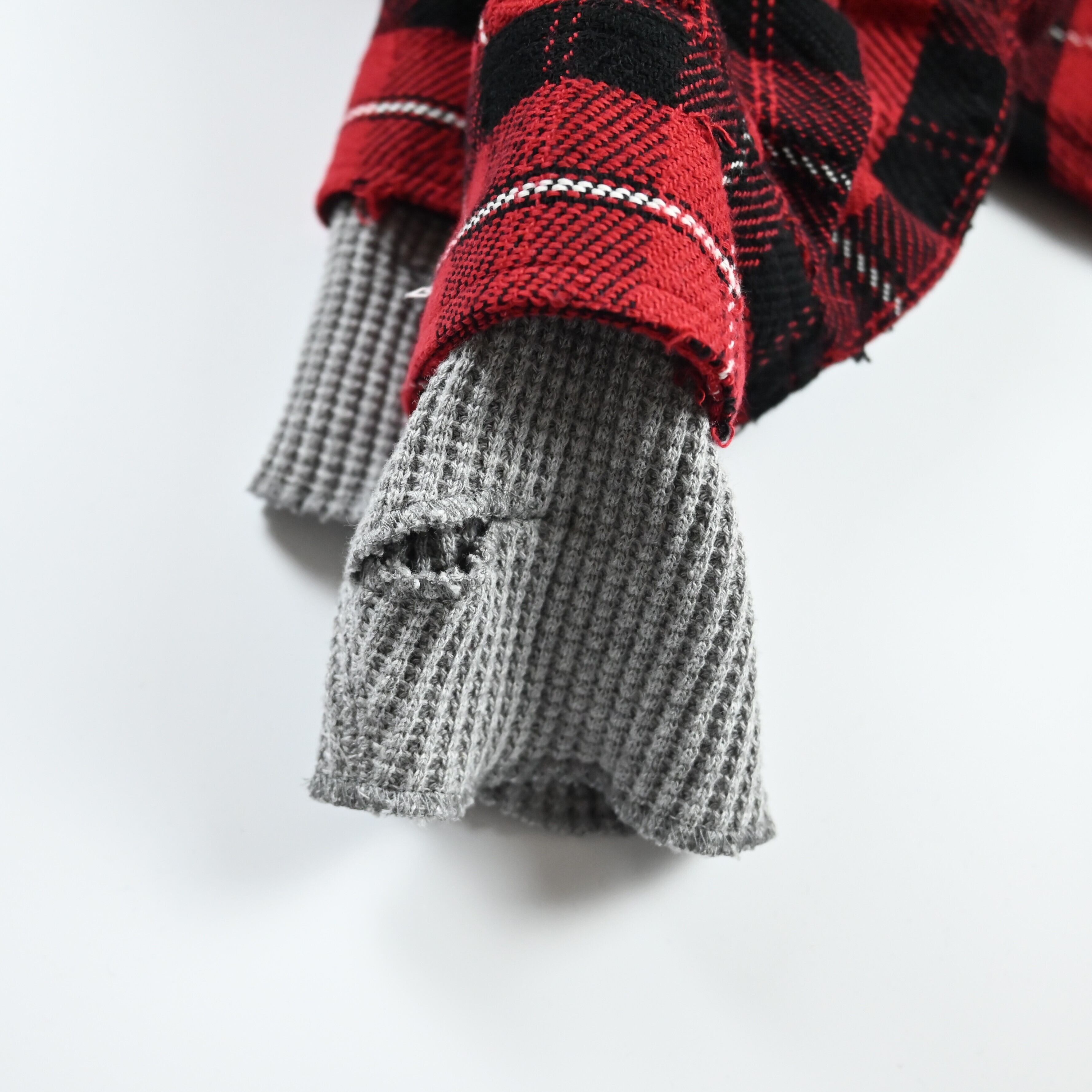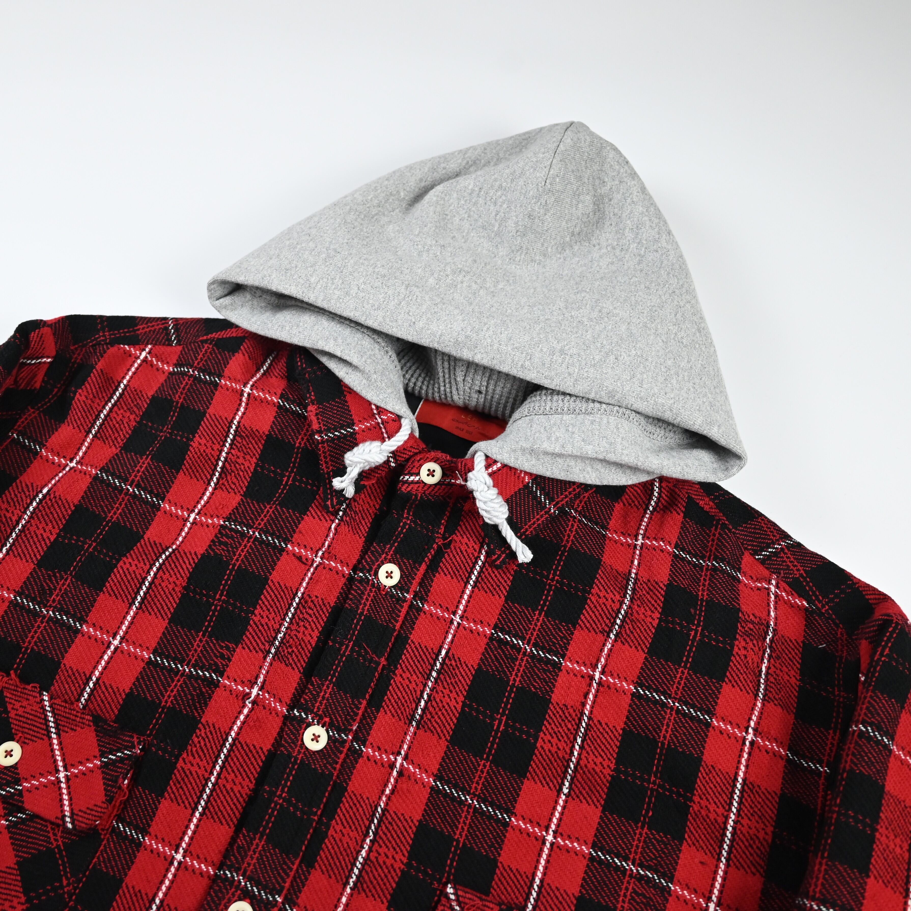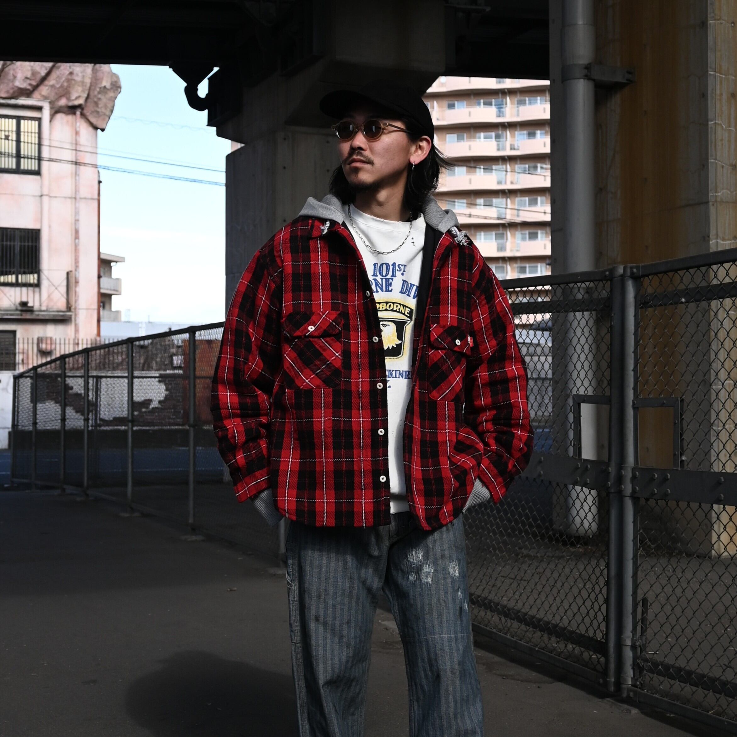 A hooded layered shirt featuring vintage-inspired damage processing.