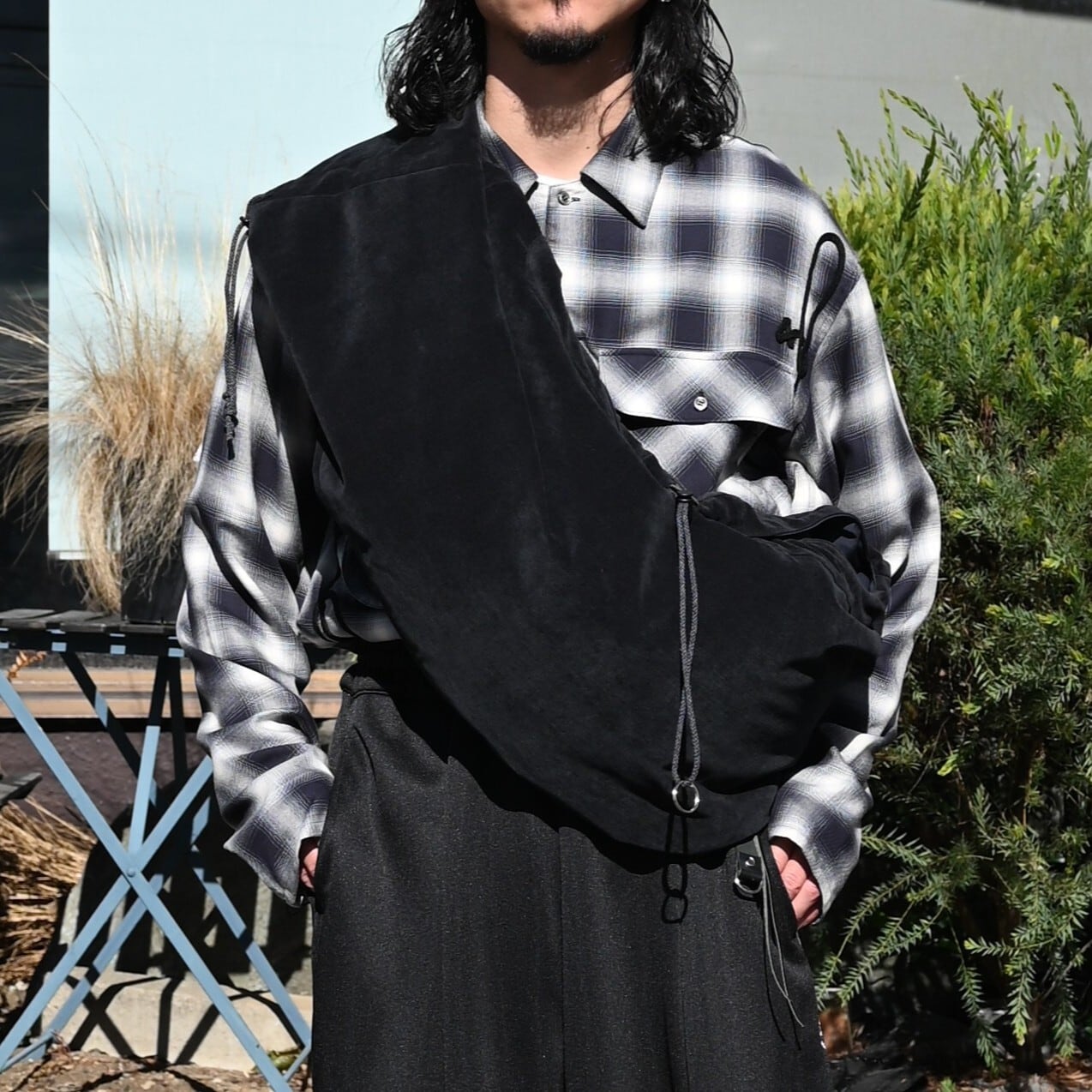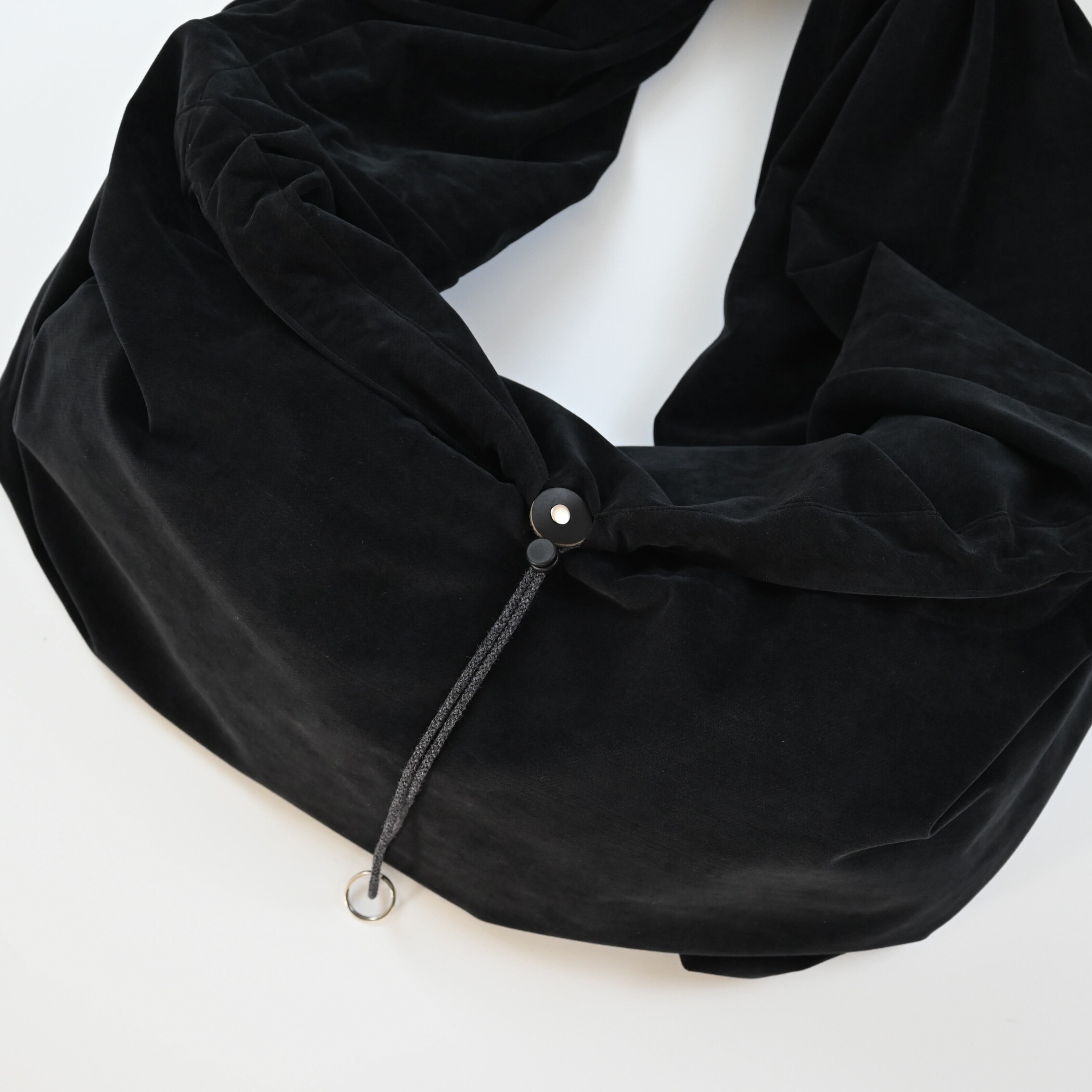 ・ボディー中央箇所には同じくドローコードとLEHアトリエにてオリジナルで作成した25mmレザーボタンがカシメ止めされ、ストッパーで開閉が可能