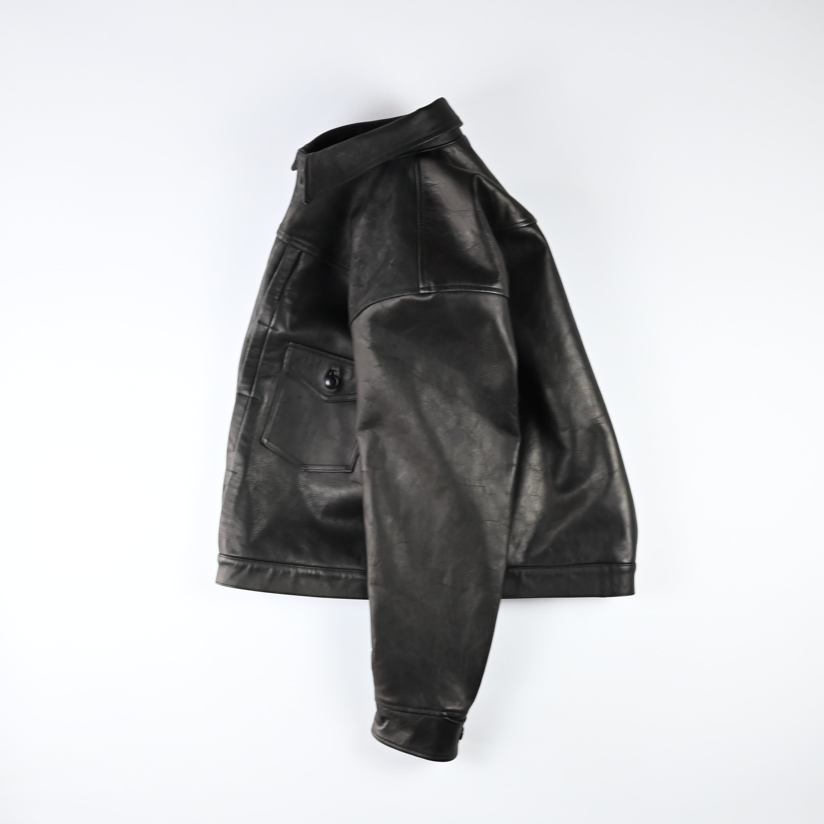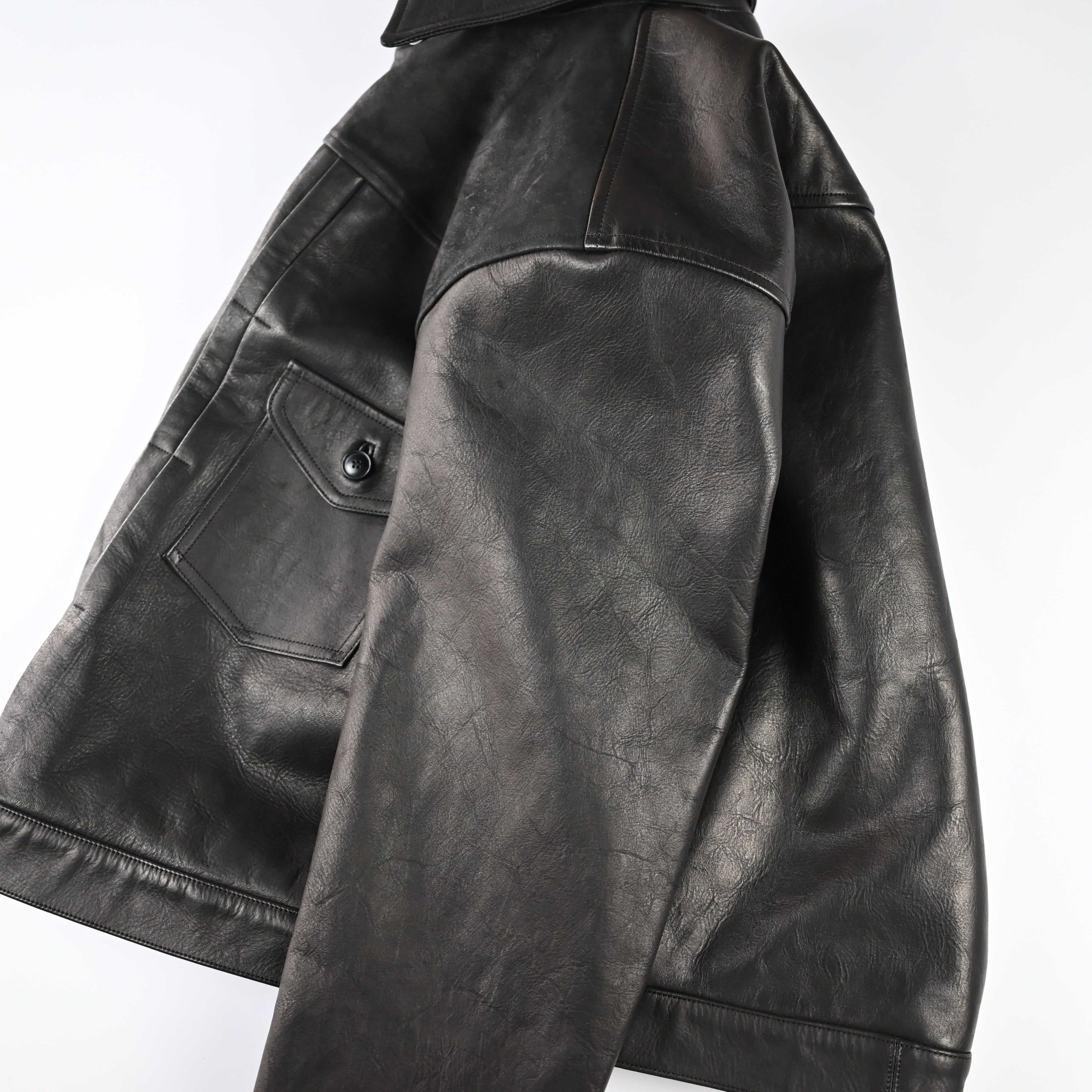 A leather jacket designed with inspiration from 1930s jean jacket–style silhouettes.