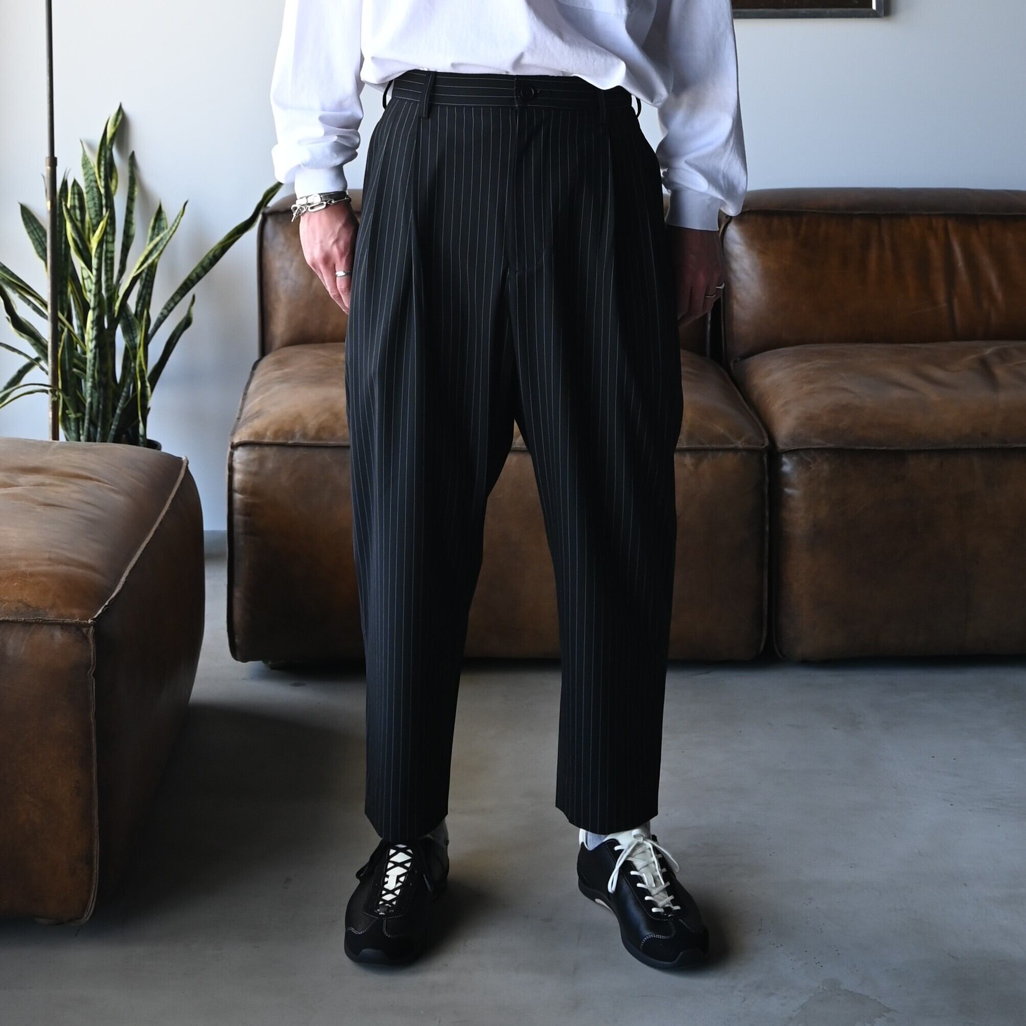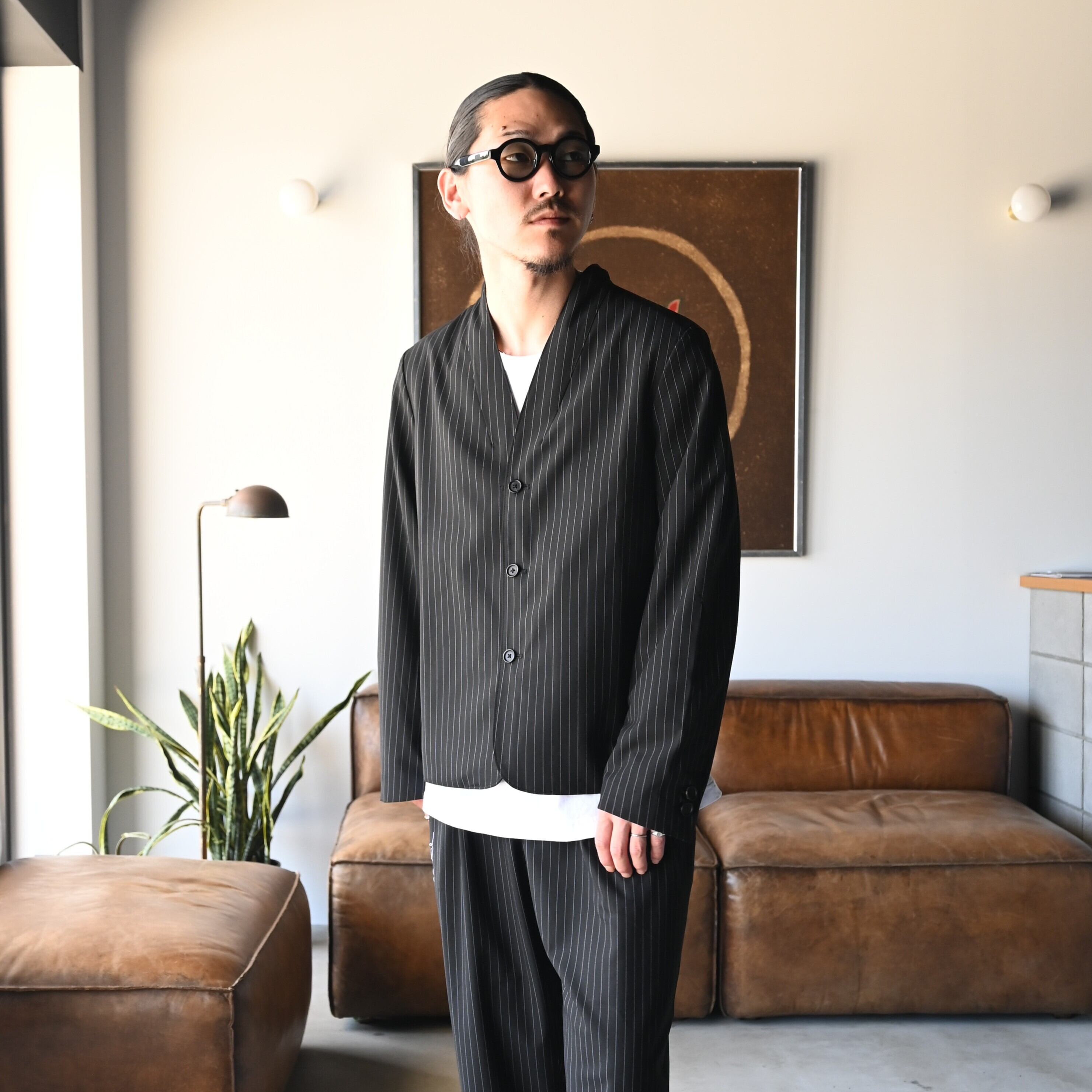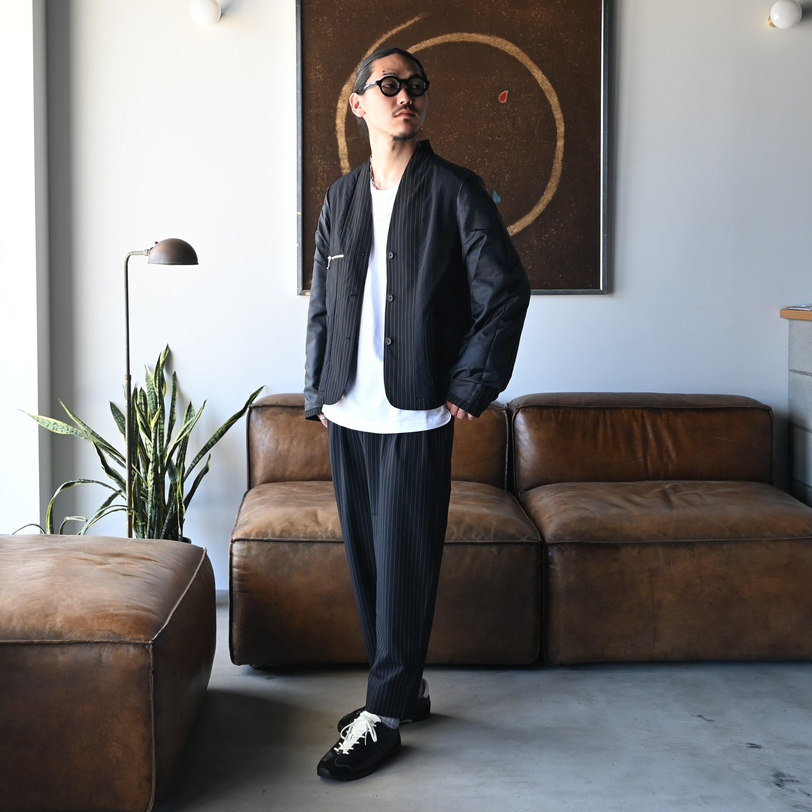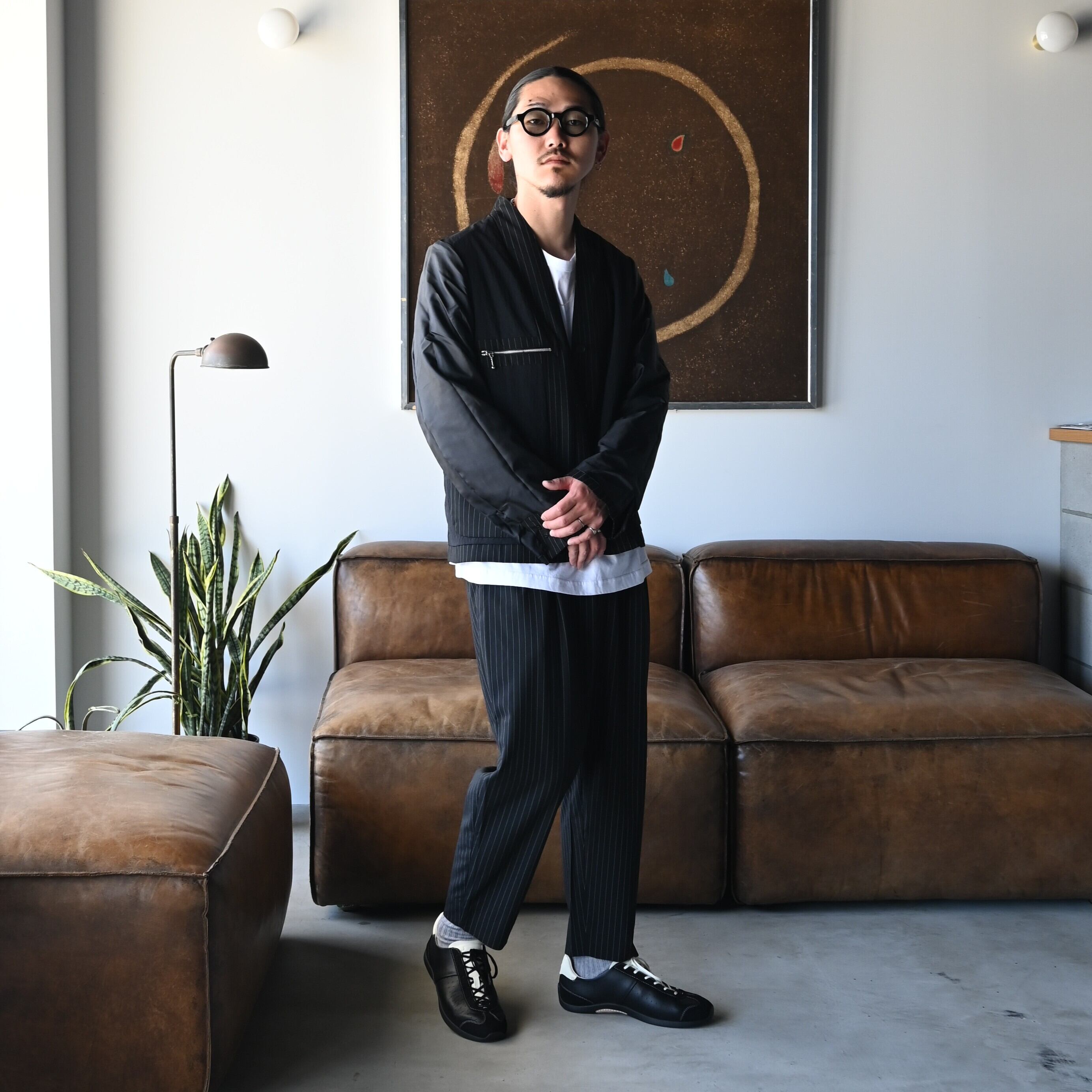 KUON(クオン)25年秋冬新作のReversible Kimono Collar Blazer、2 Tuck Trousersをセットアップ着用。インナーにSashiko L/S Teeを合わせました。足元はFOOT INDUSTRY / BALLET GATを合わせてカジュアルに。