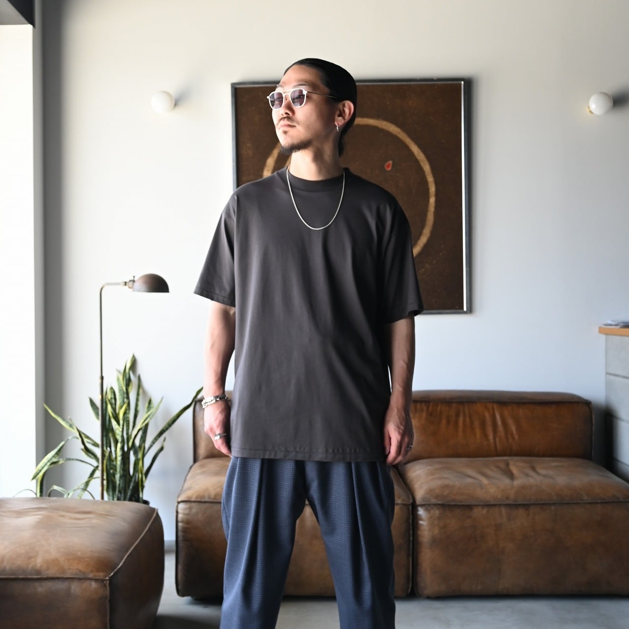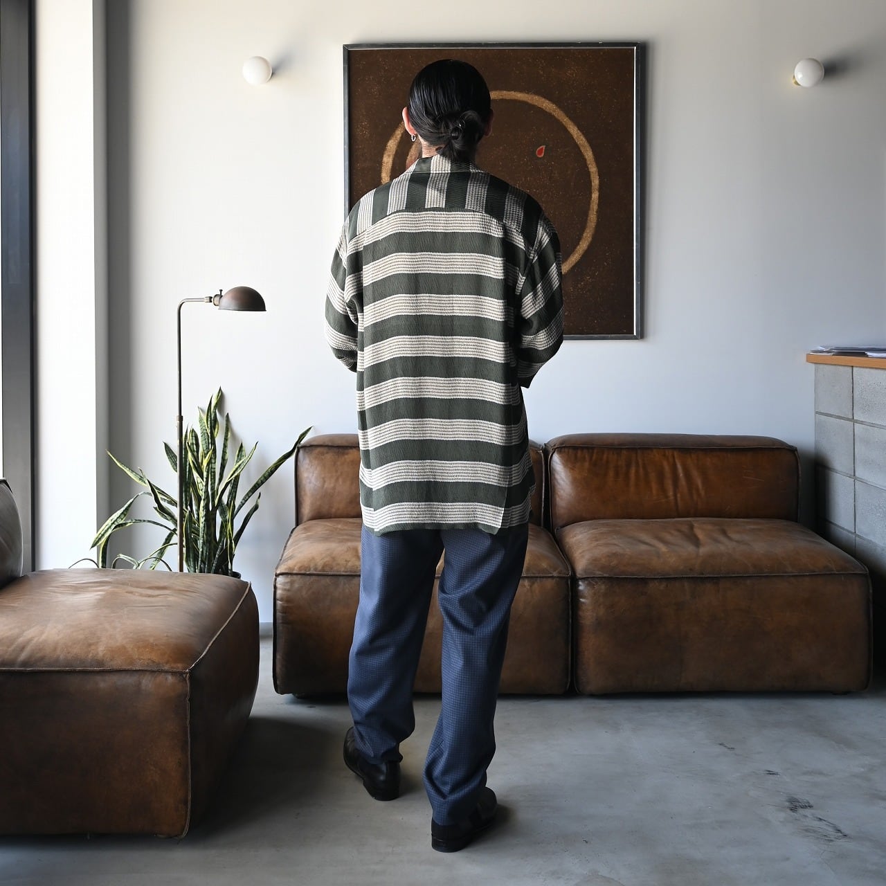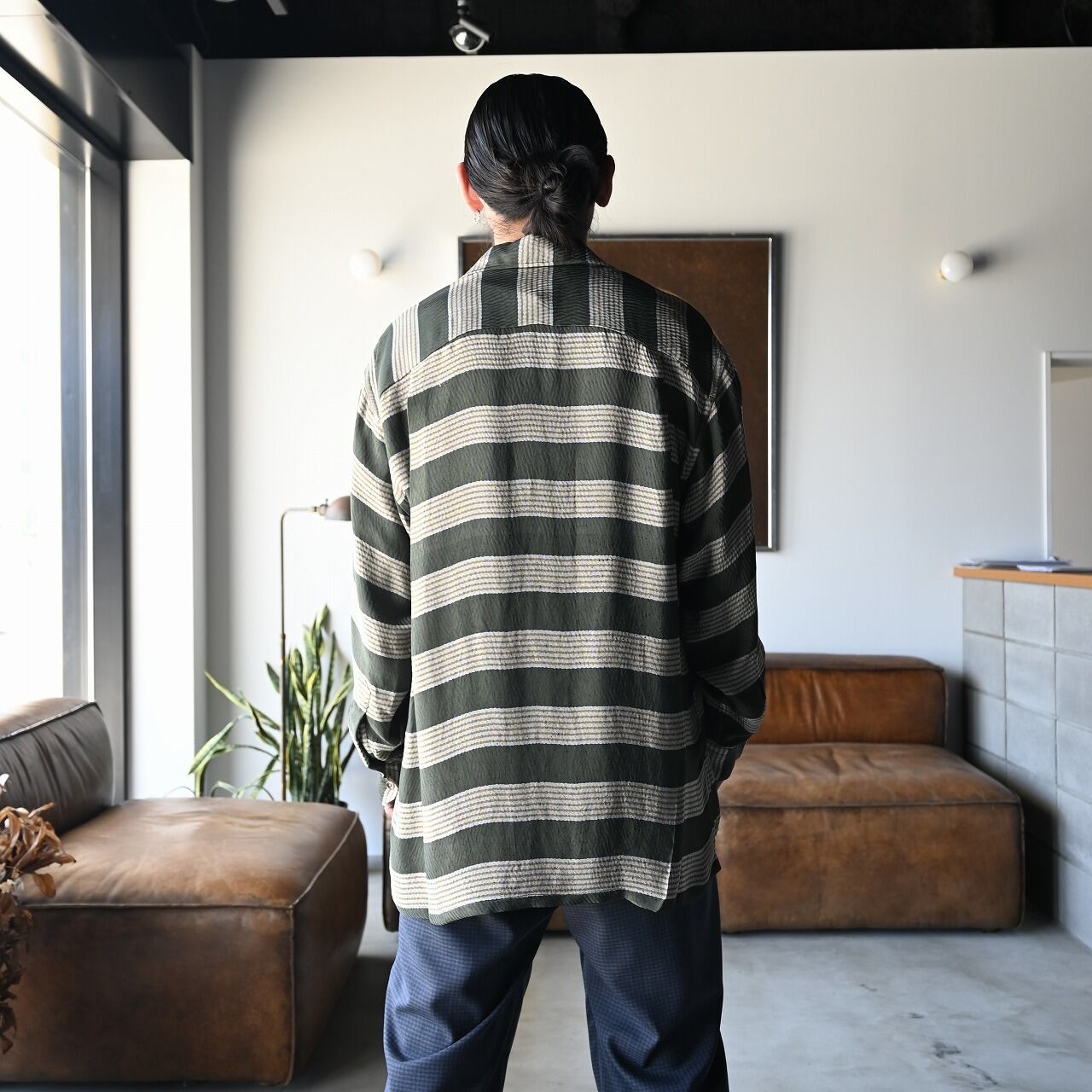 THE DAY(ザデイ)MOLESKIN DOUBLE BREASTED JACKETをメイン着用。インナーにINTÉRIM (インテリム)のHYPER BIG VISCOSE STRIPE 60s OPEN COLLAR SHIRTを合わせ、HIGH GAUGE SUVIN JERSEY S/S TEE、tangenet (タンジェネット)のWool tropical Billyを着用。