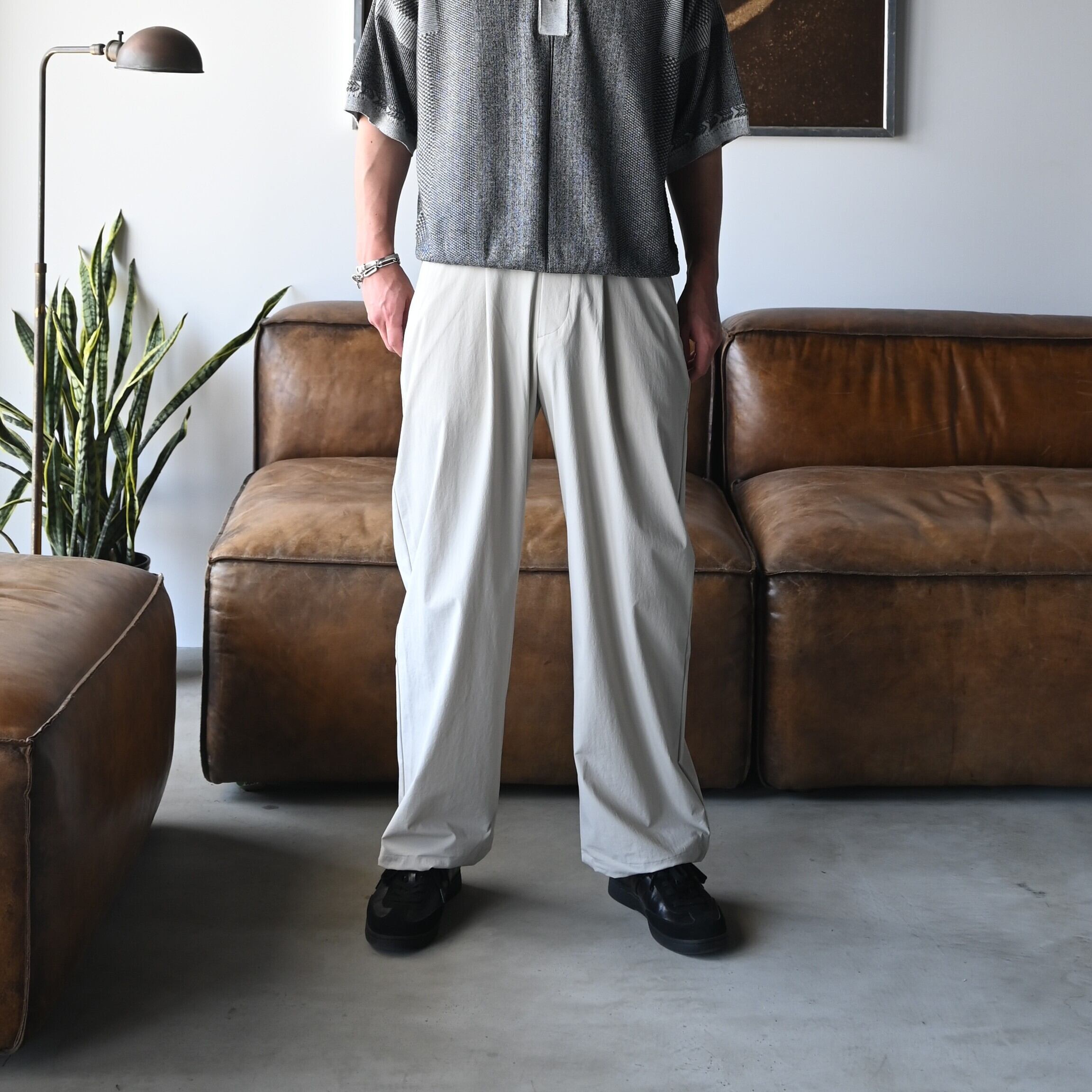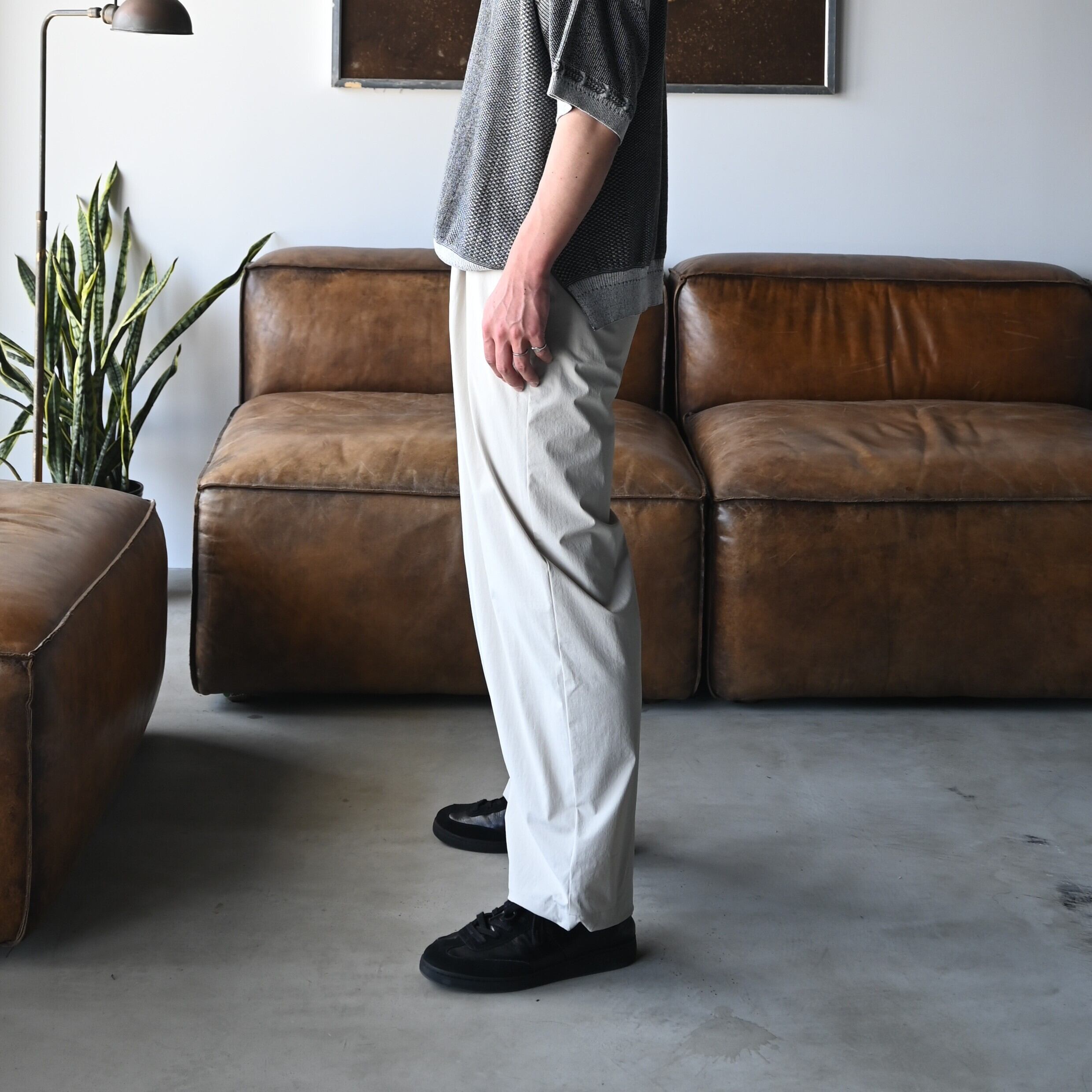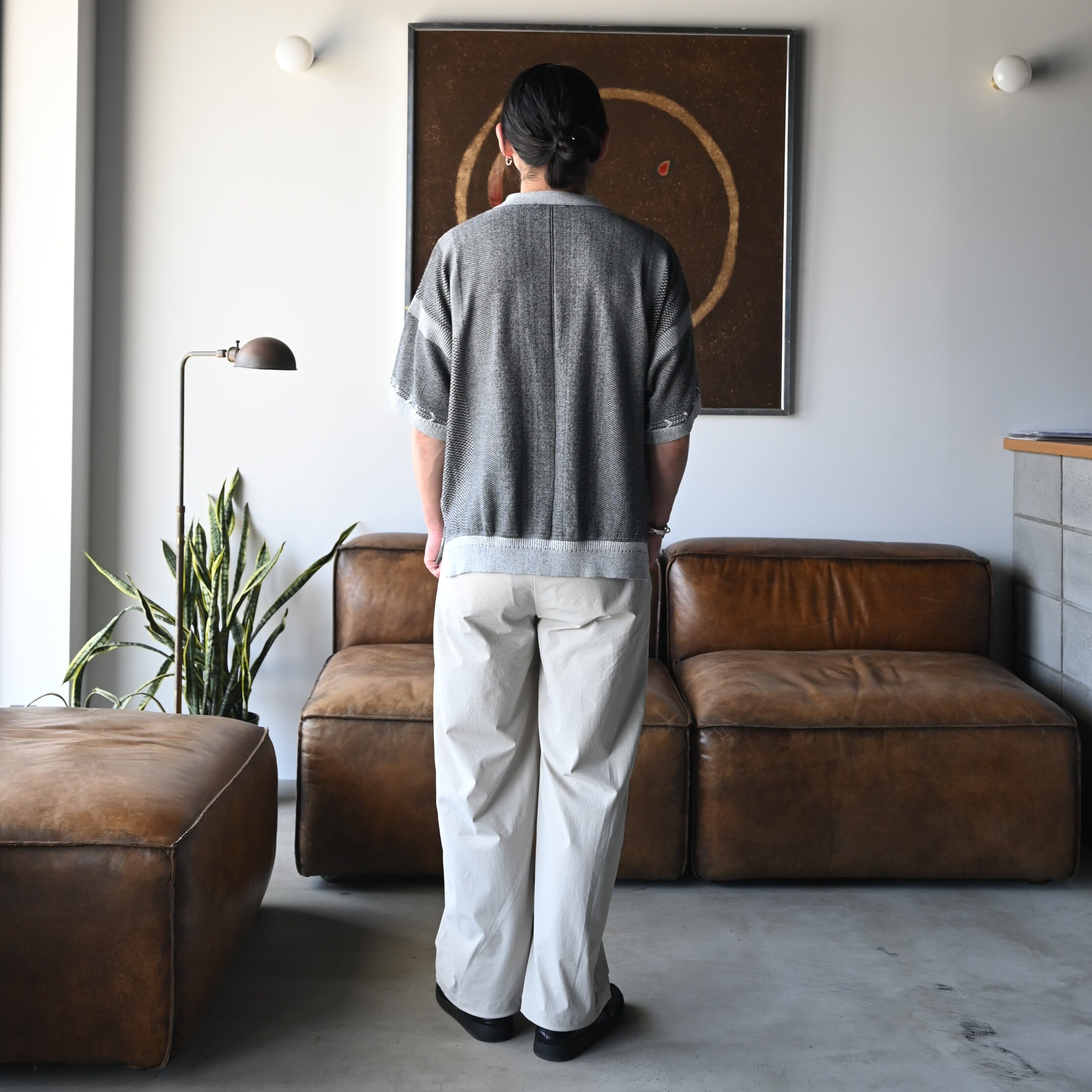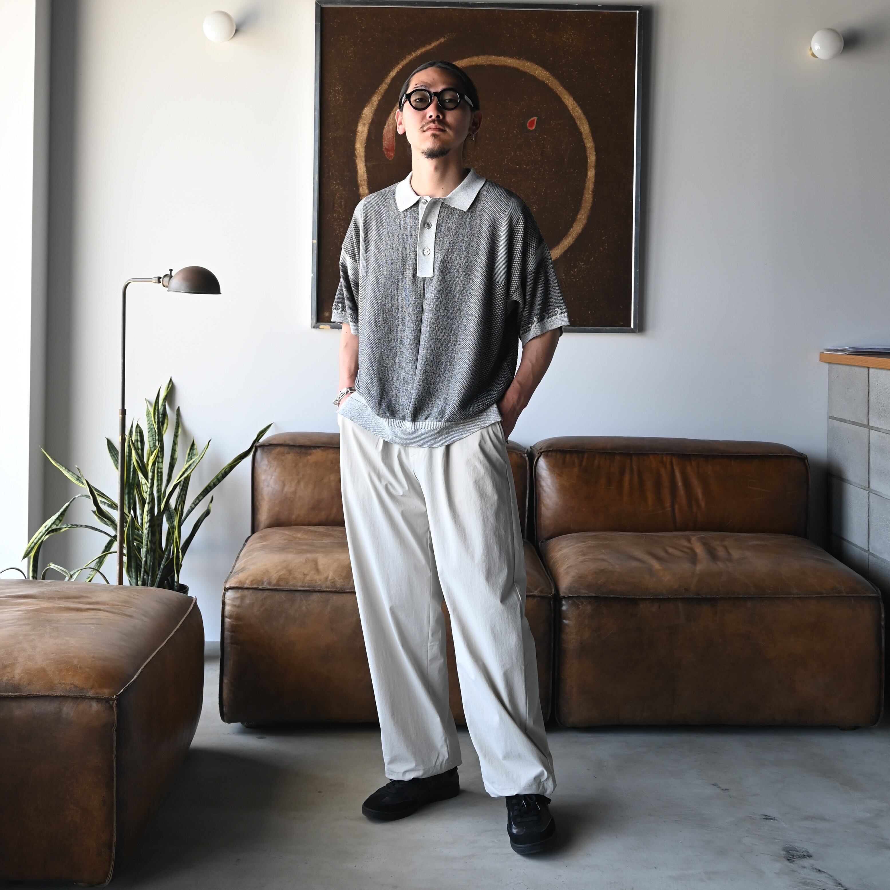 KUON(クオン) Reversible Kimono Collar Blazerをメイン着用。インナーにYASHIKI(ヤシキ)のニットポロ、SAYATOMO(サヤトモ)のスラックスを合わせました。ブラックとライトベージュの色バランスがいい感じです。