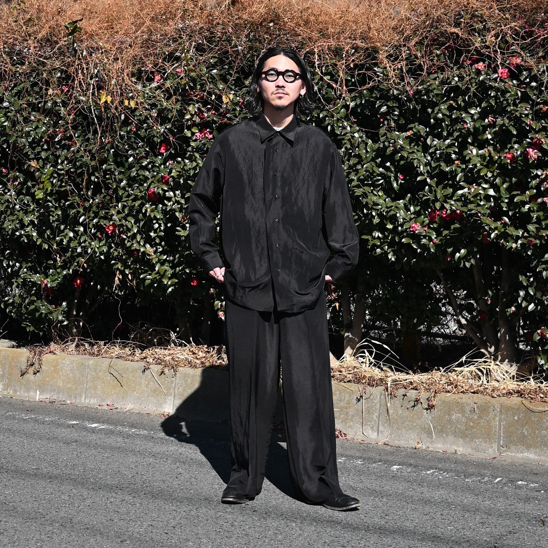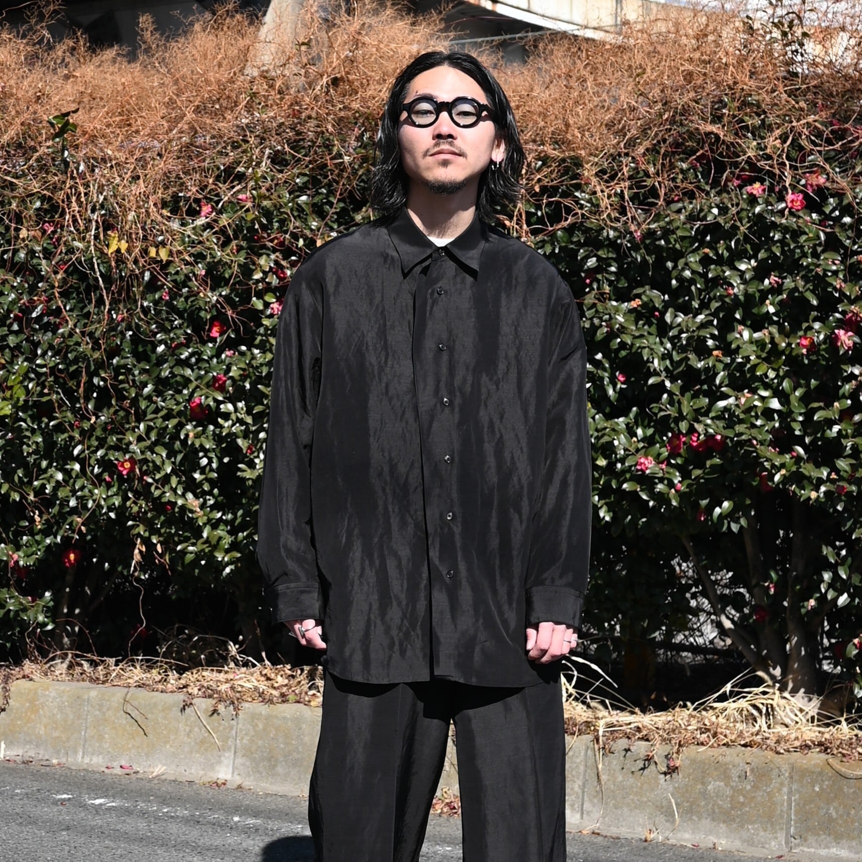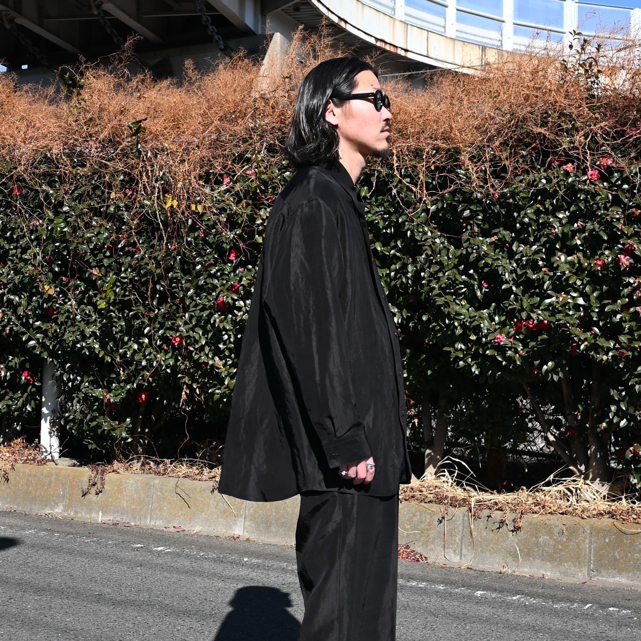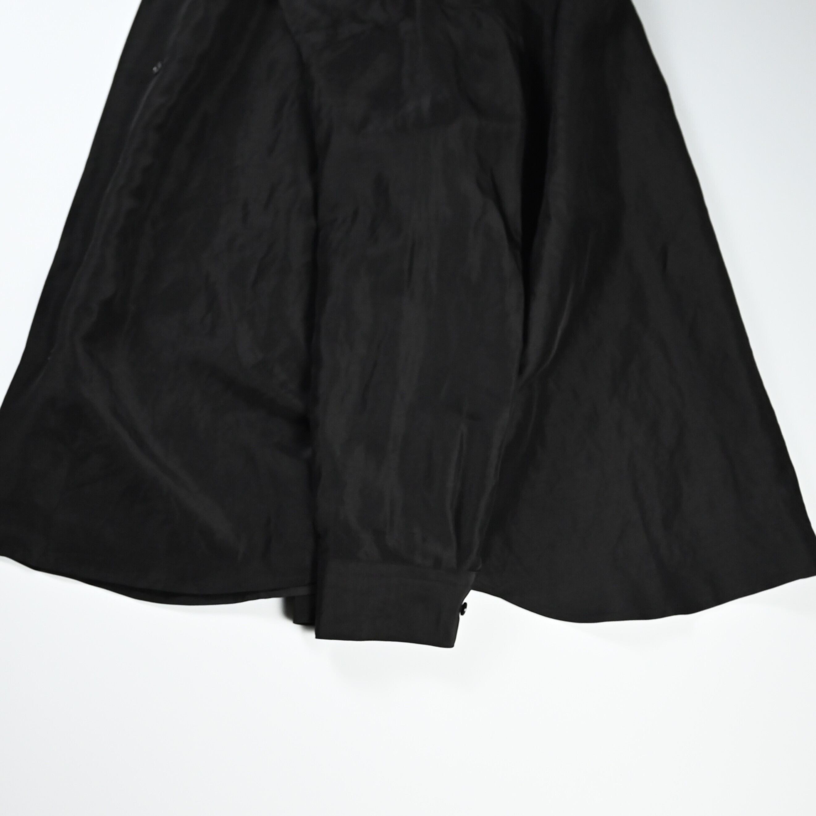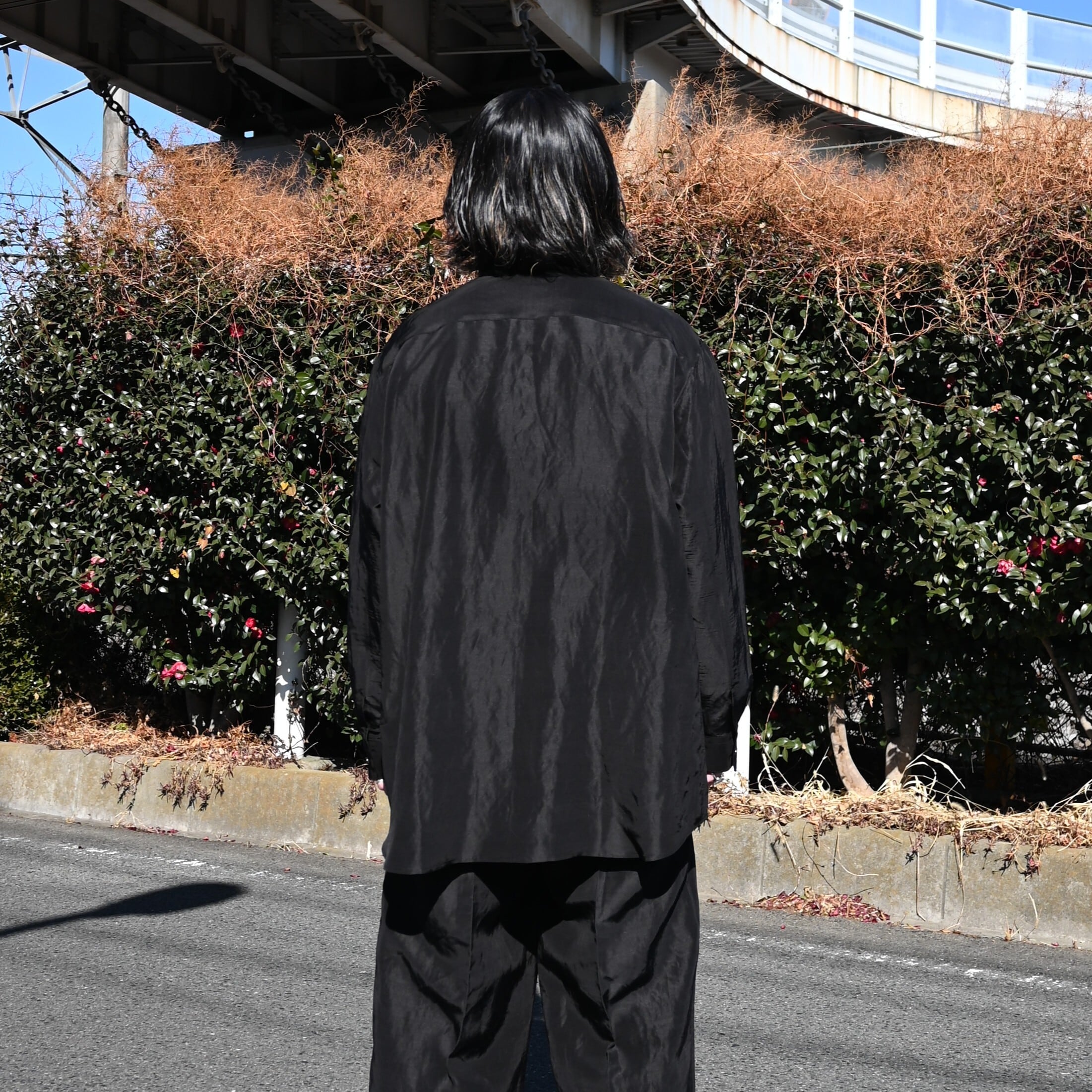 To fully enjoy the inherent quality of the fabric in its purest and chicest form, the fabric is dyed in solid black without uneven dyeing, allowing for a silk-like refined nuance.