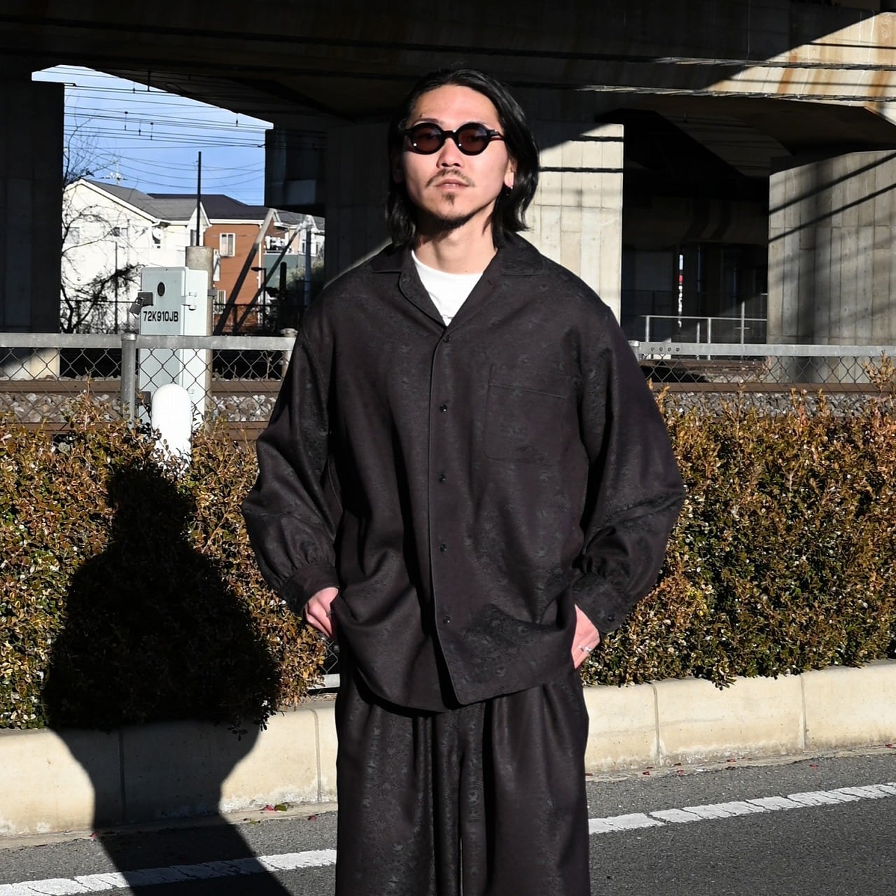 This item can be worn as a setup with the 2-Tuck Draw Cord Wide Trousers.