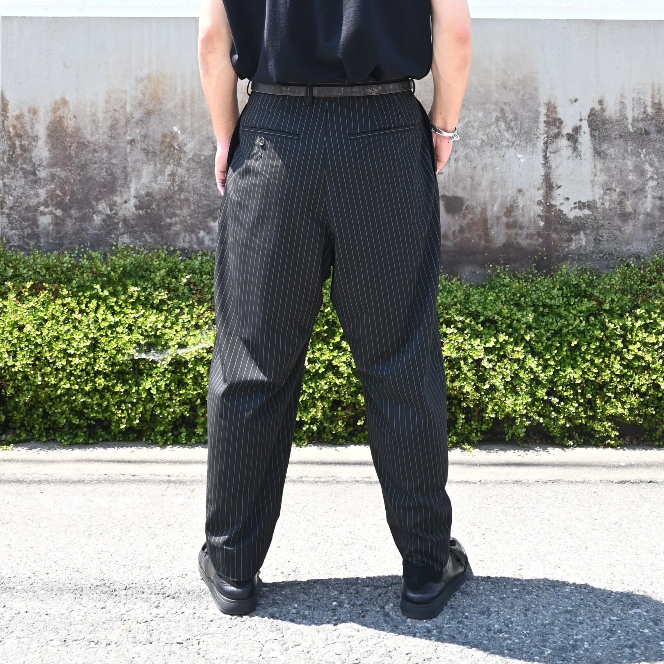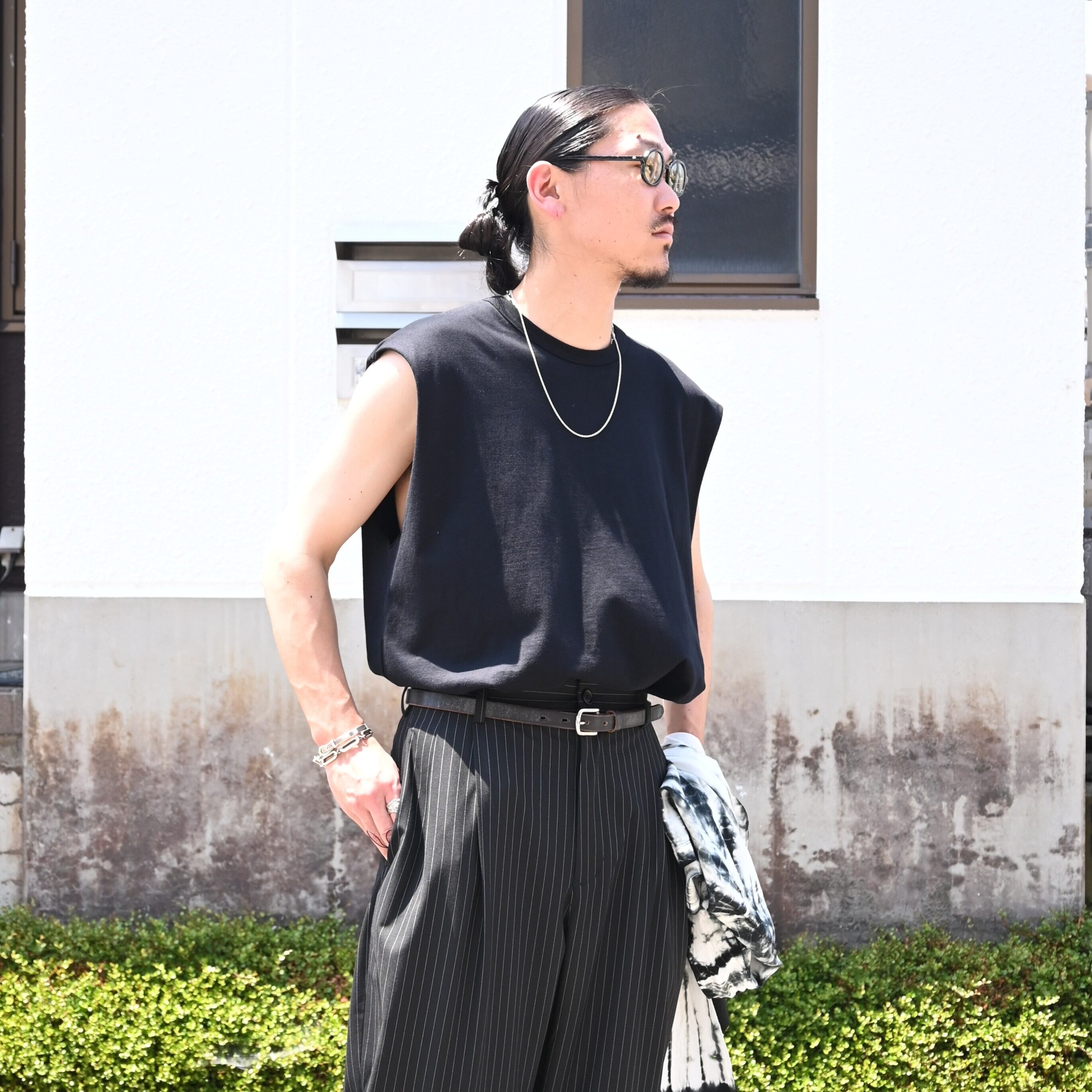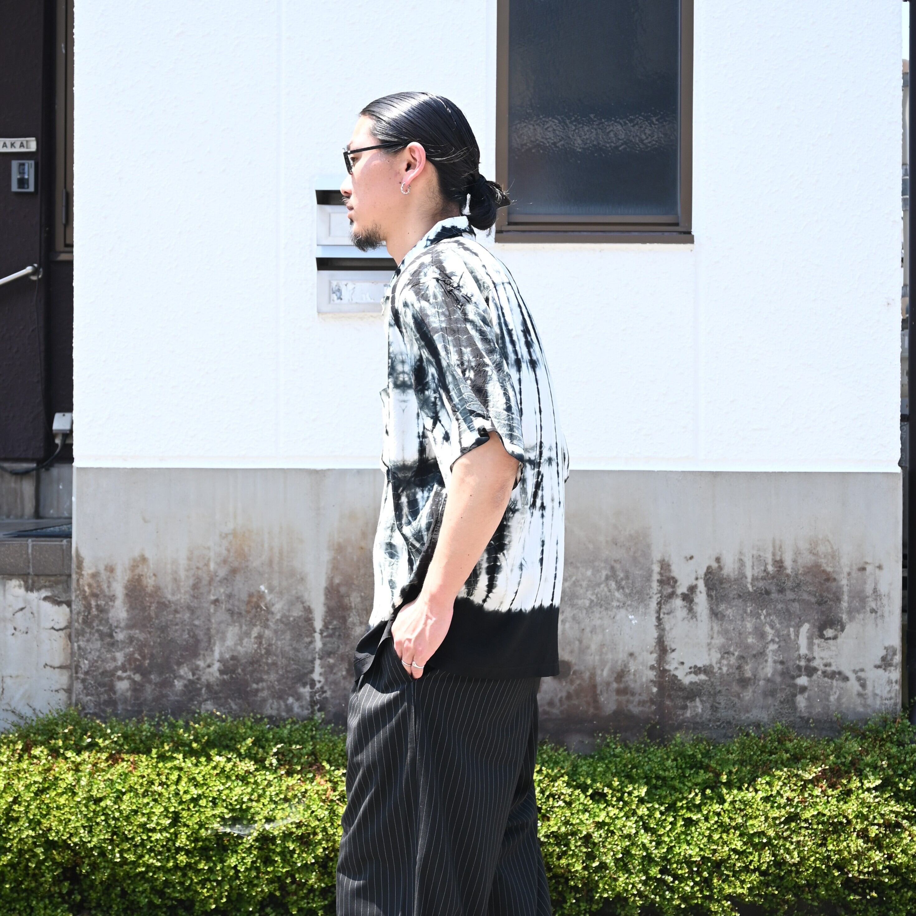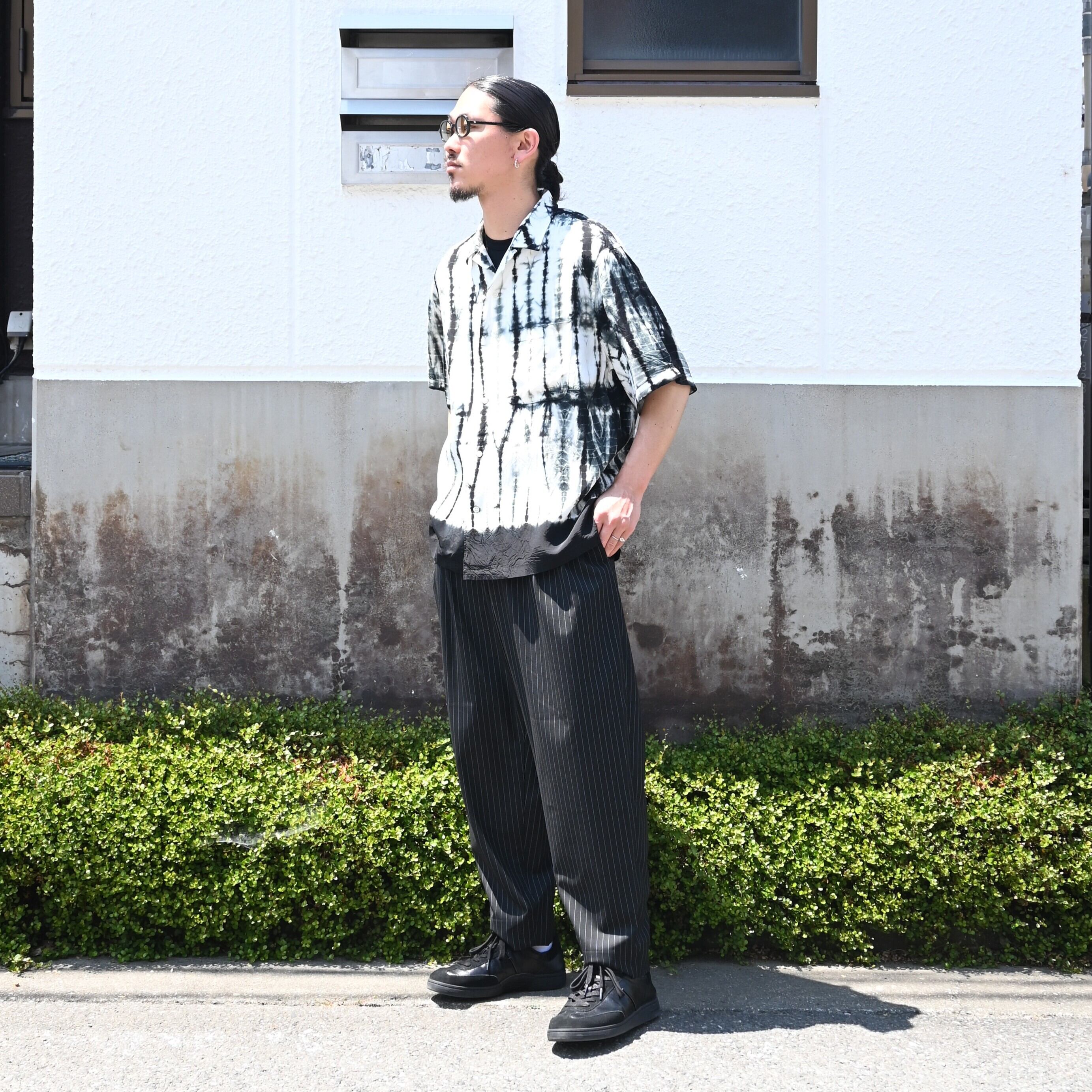 KUON(クオン) Arimatsu Shibori Camp Collar Shirtをメイン着用。インナーにBoro Patched Sleeveless Topを合わせ、25AW新作 2 Tuck Trousersを着用いたしました。