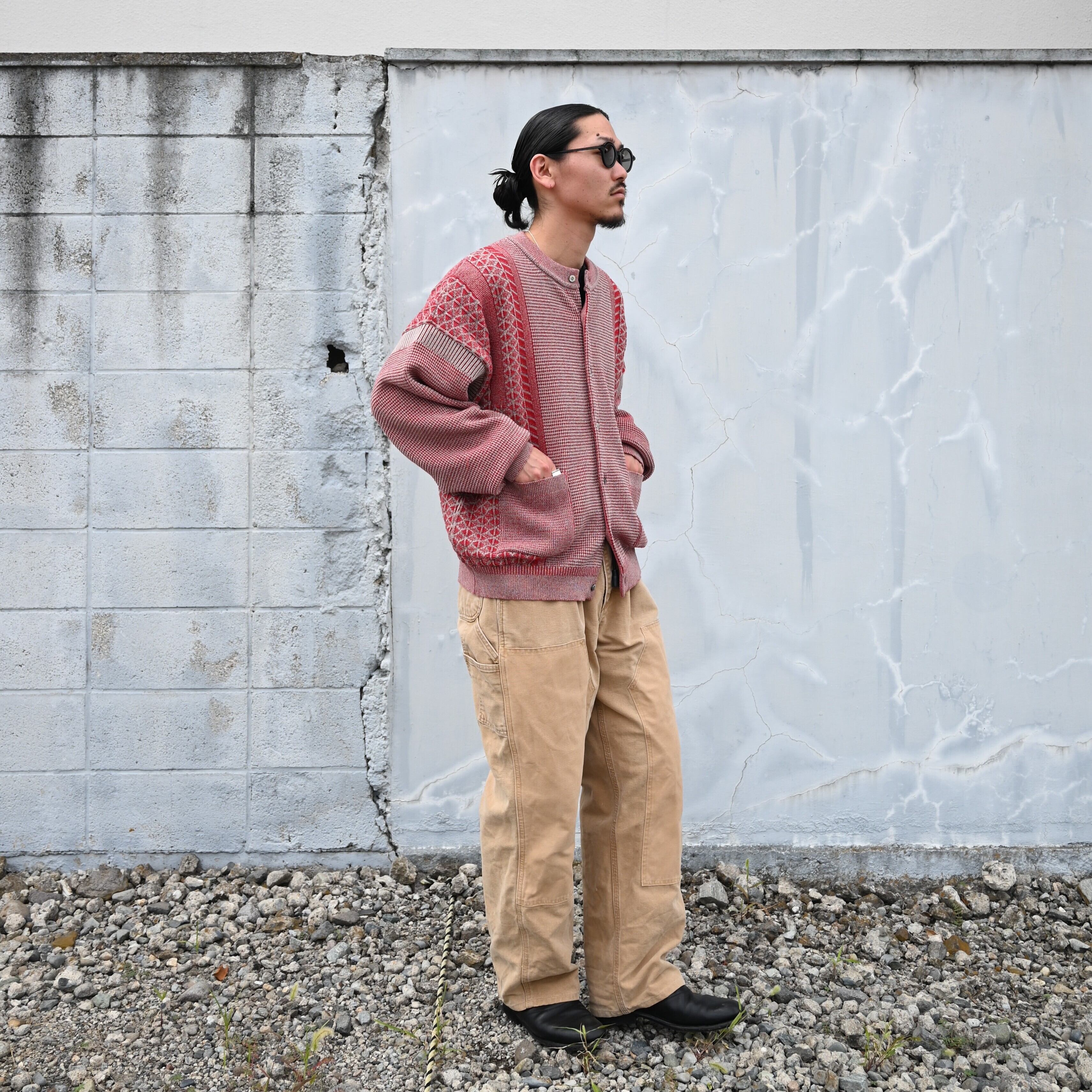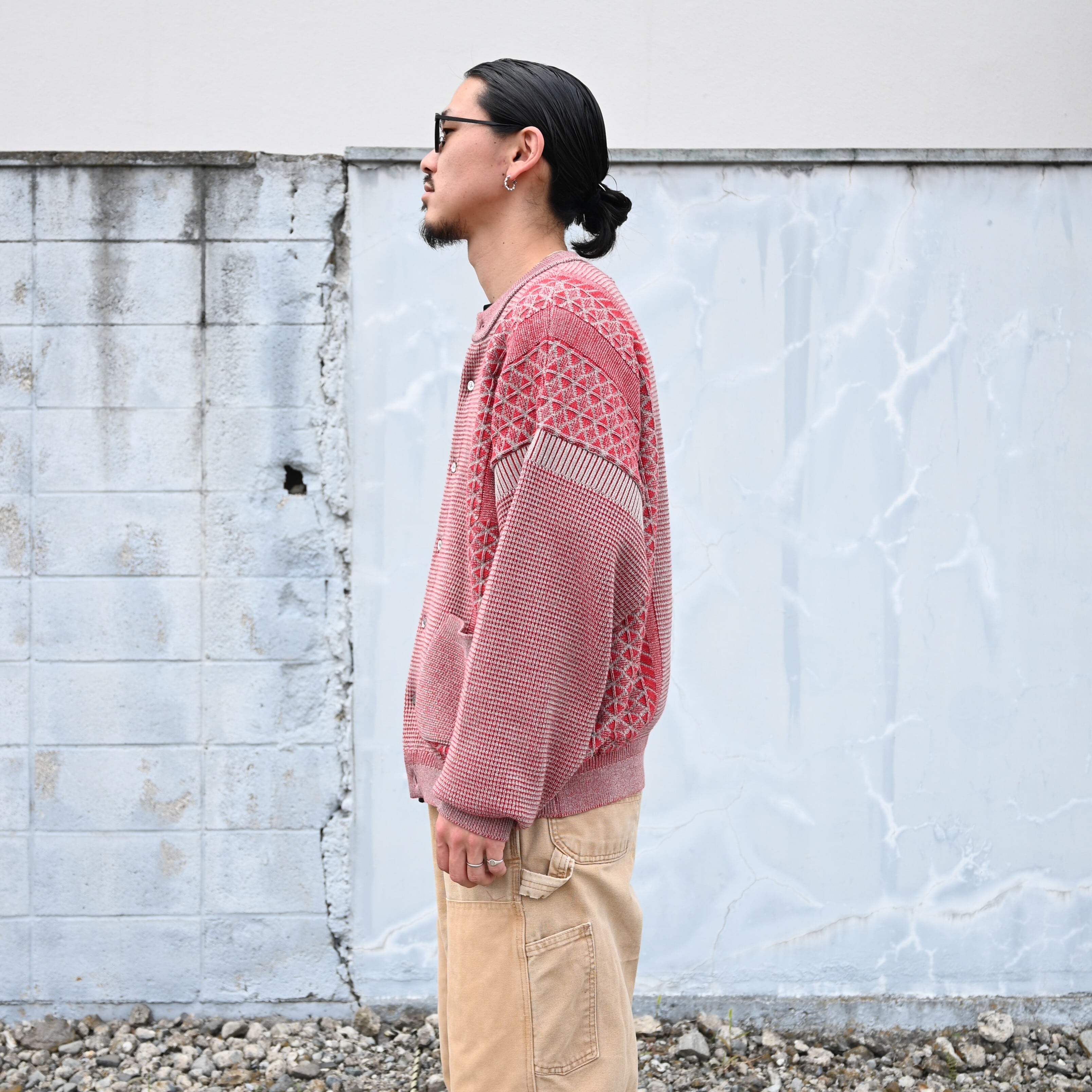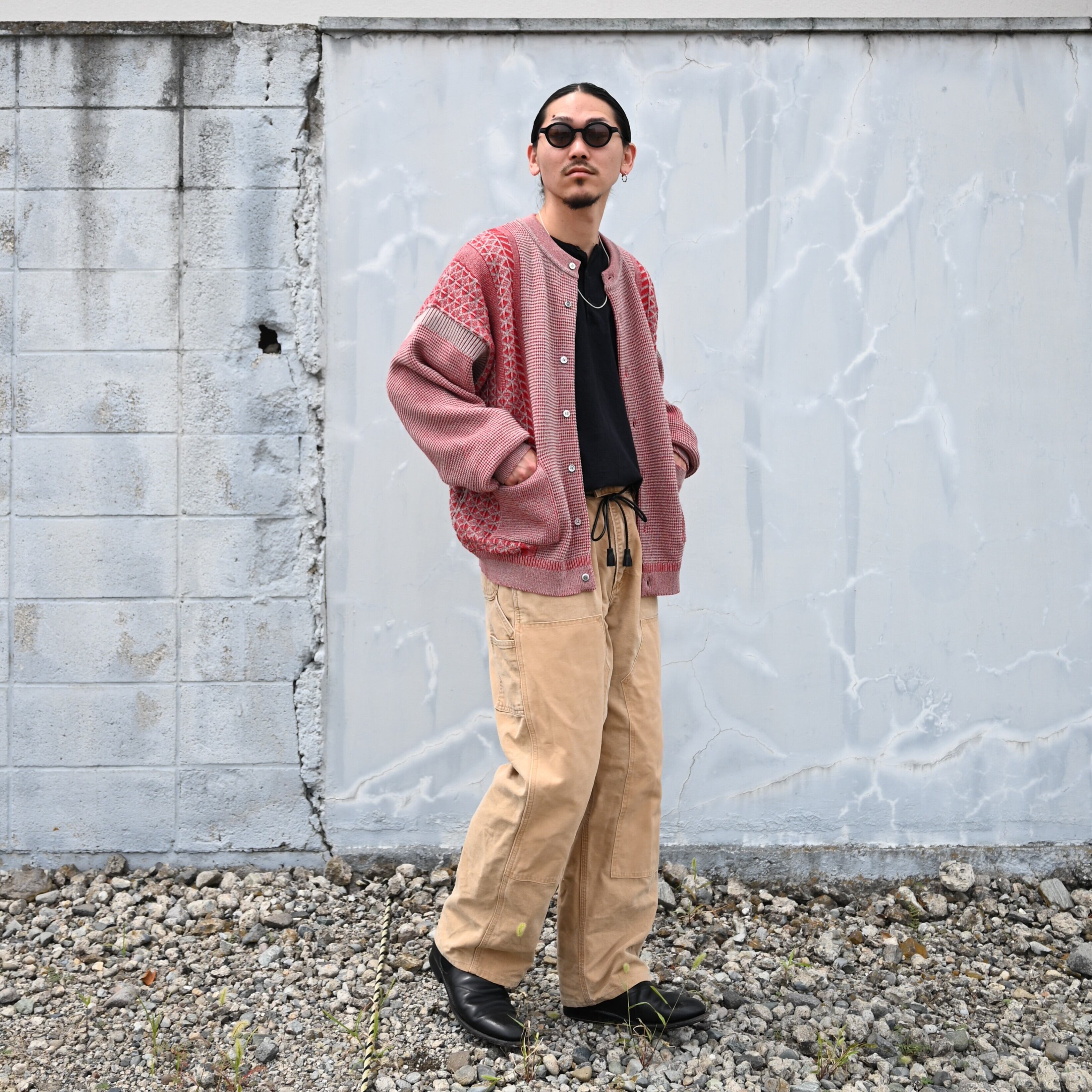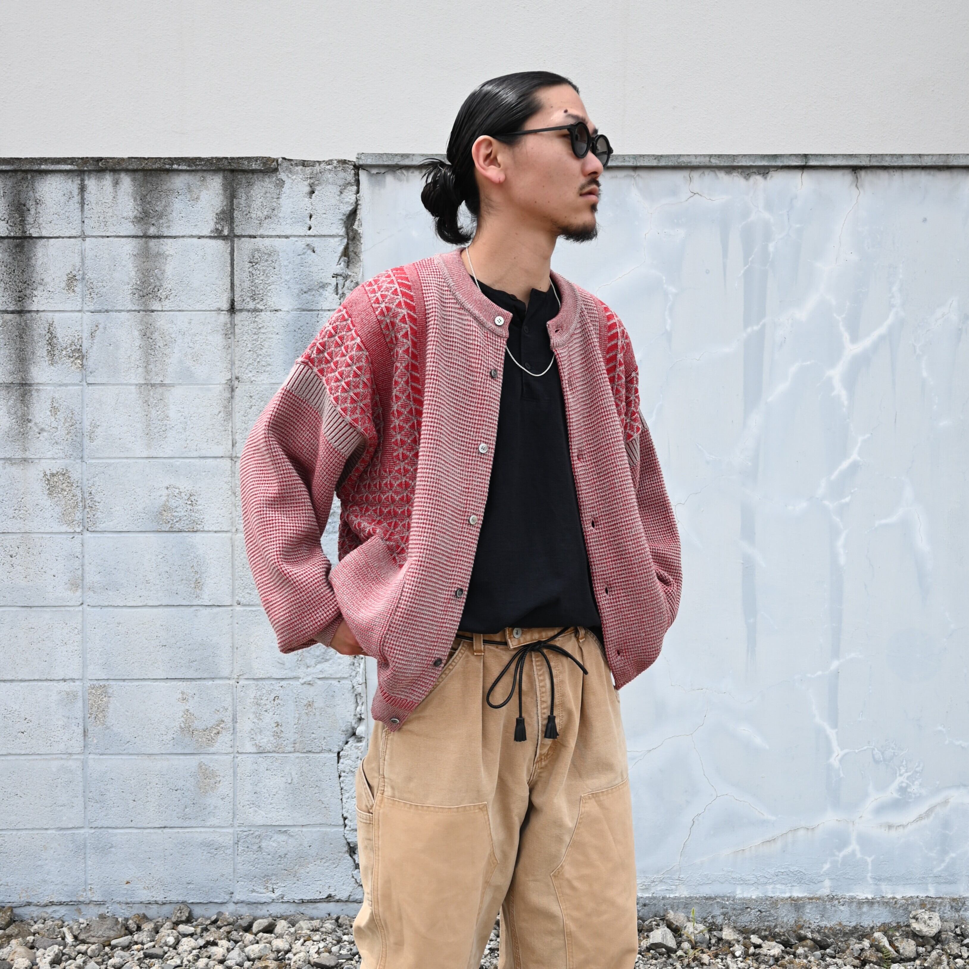 YASHIKI(ヤシキ) GANKO別注 Ginka Cardigan(Yuki Momizi)をメインにスタイリング。インナーにOLDJOE(オールドジョー)のTUBE TEE (Henry-Neck)を合わせCHANGES(チェンジーズ)の DOUBLE KNEE DUCK PANTS BEG(1)を着用いたしました。
