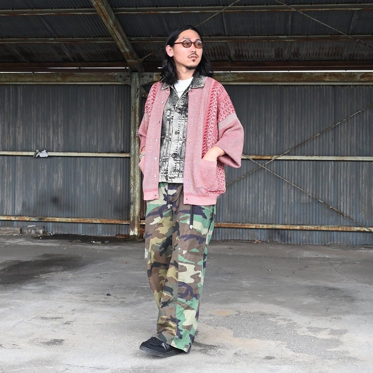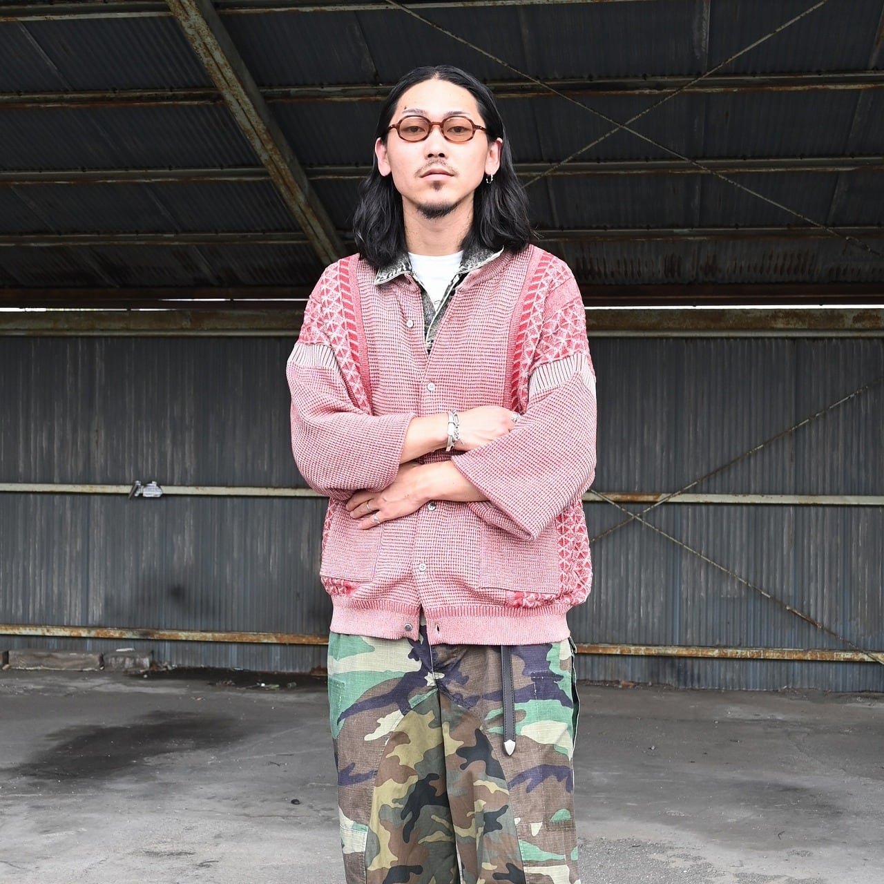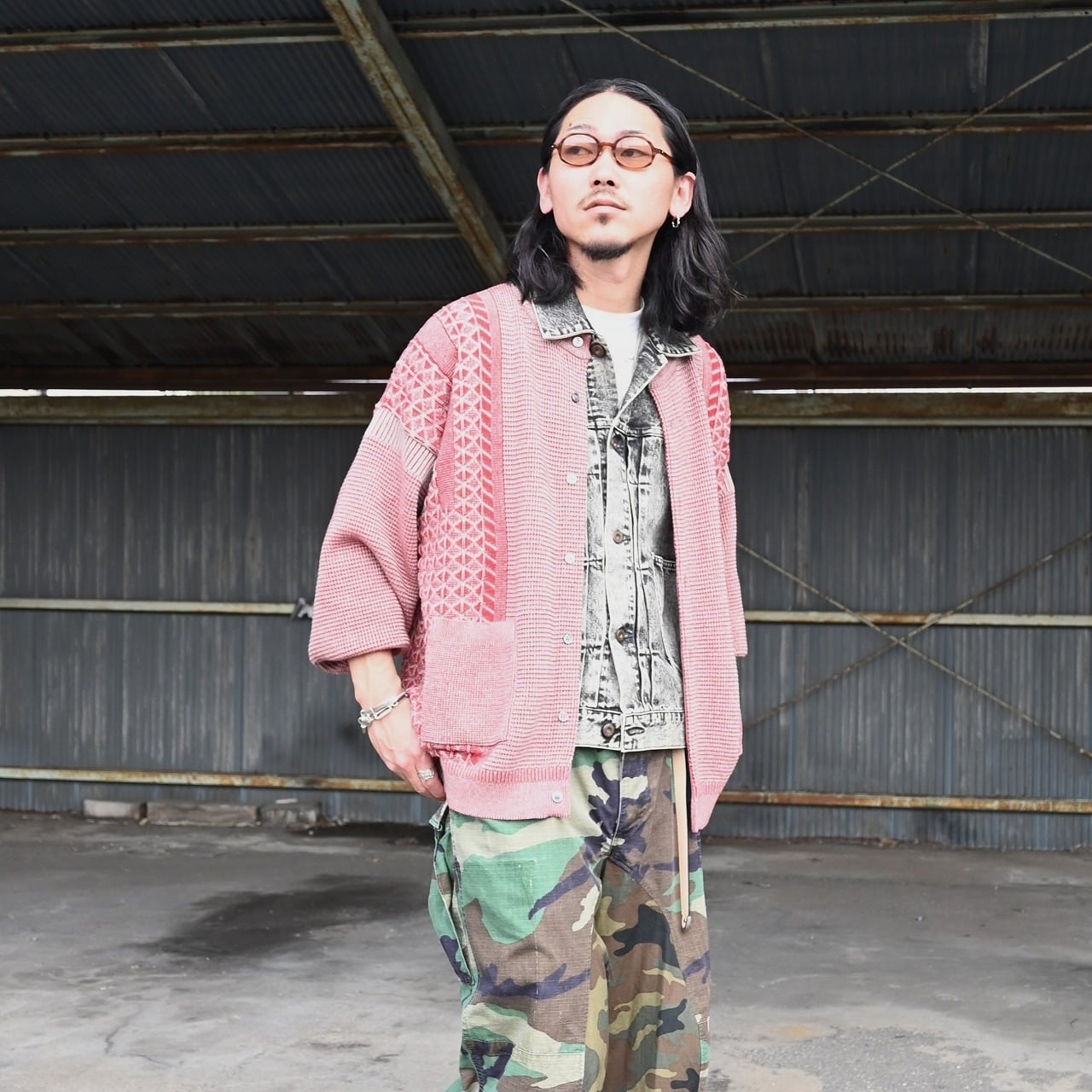 8月16日(土)13時発売となるGANKO別注 Ginka Cardigan(Yuki Momizi)をメイン着用。インナーにデニムベストを合わせ、赤が映えるようにカーゴパンツを合わせました。