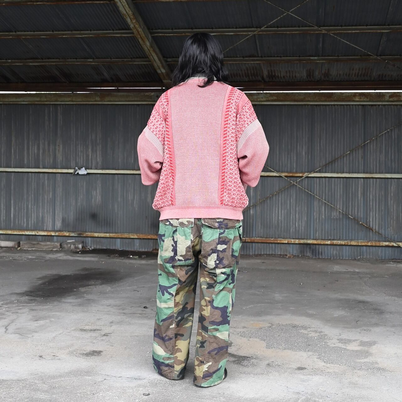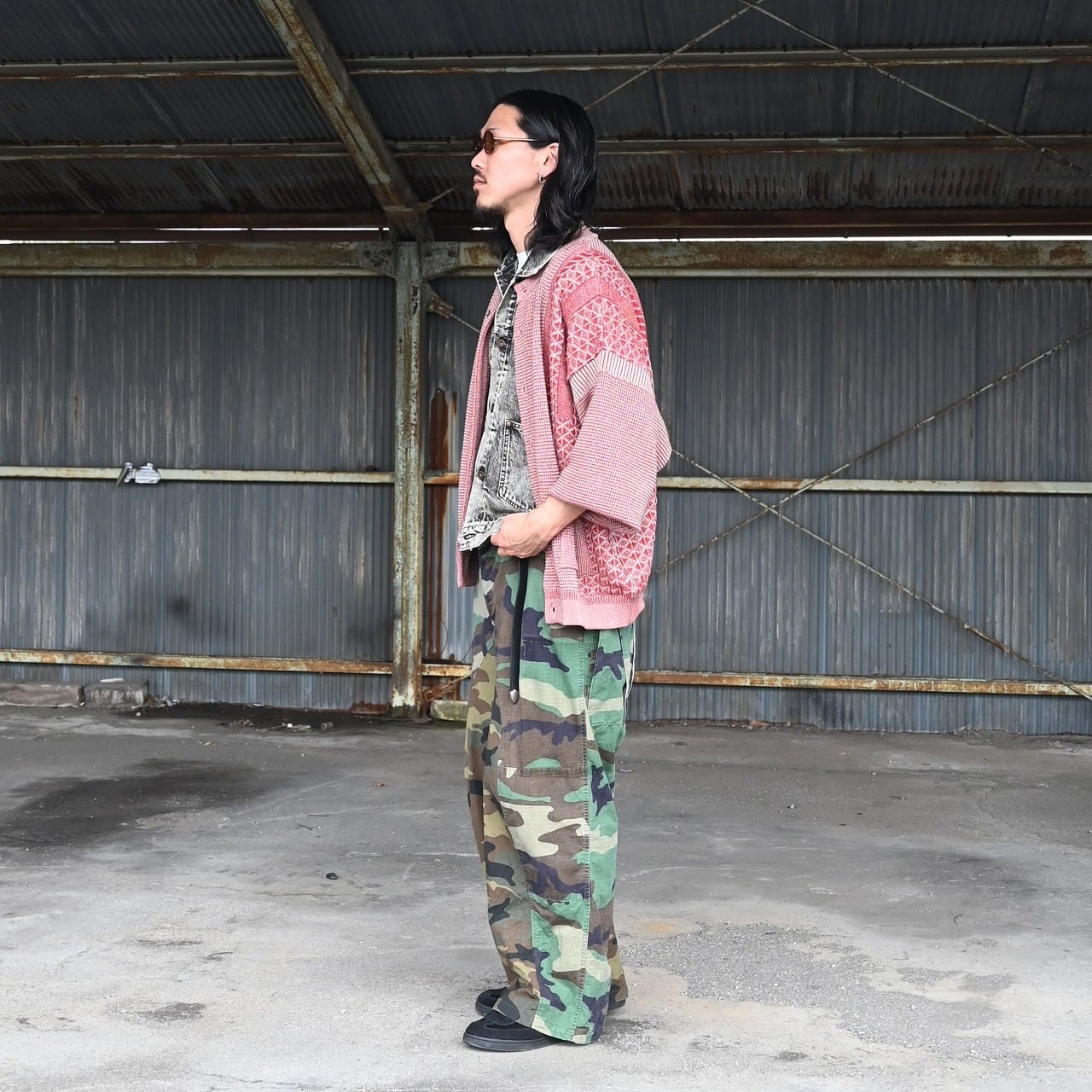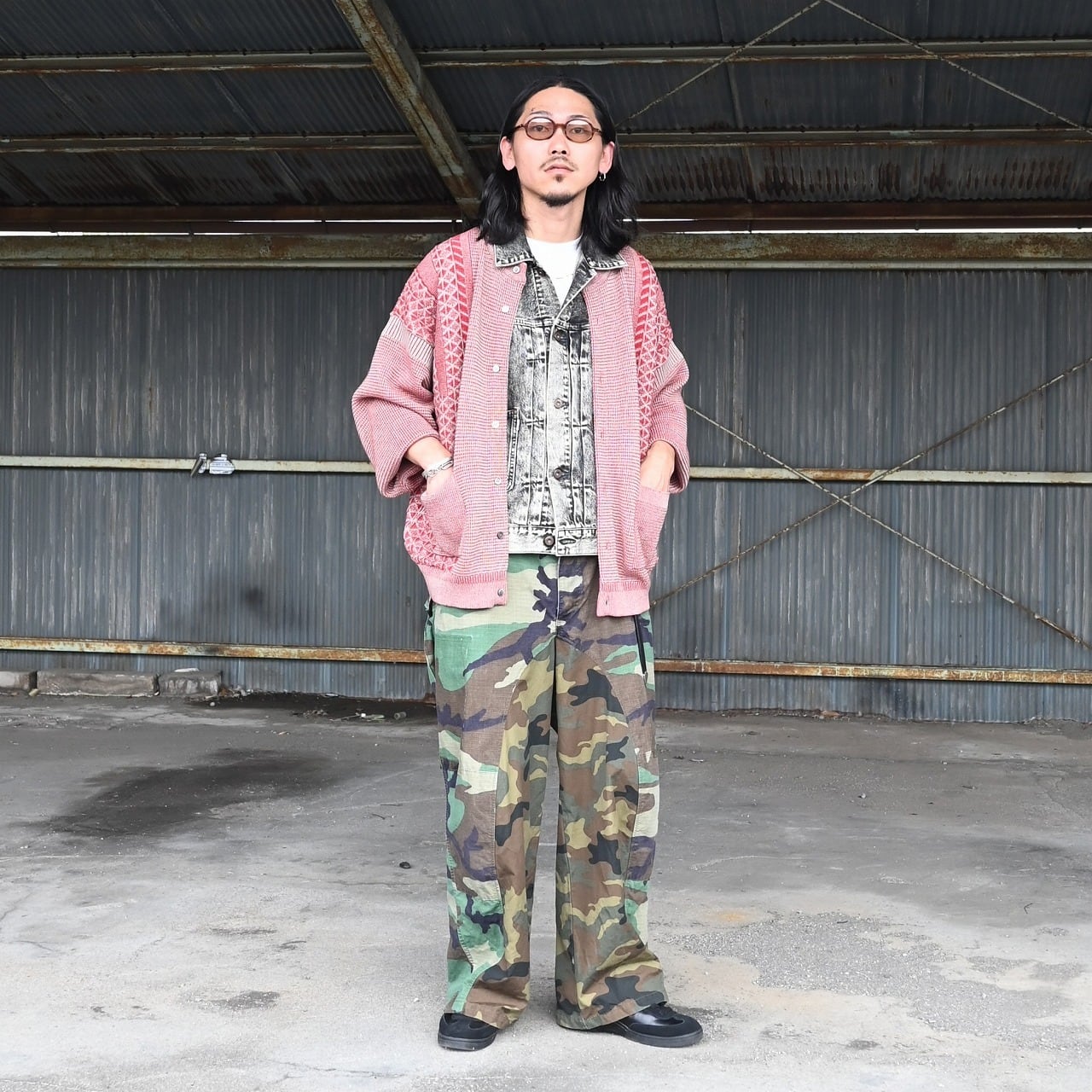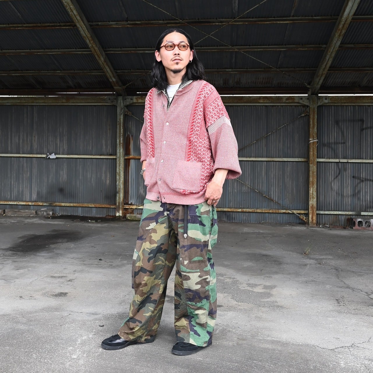 8月16日(土)13時発売となるGANKO別注 Ginka Cardigan(Yuki Momizi)をメイン着用。インナーにデニムベストを合わせ、赤が映えるようにカーゴパンツを合わせました。
