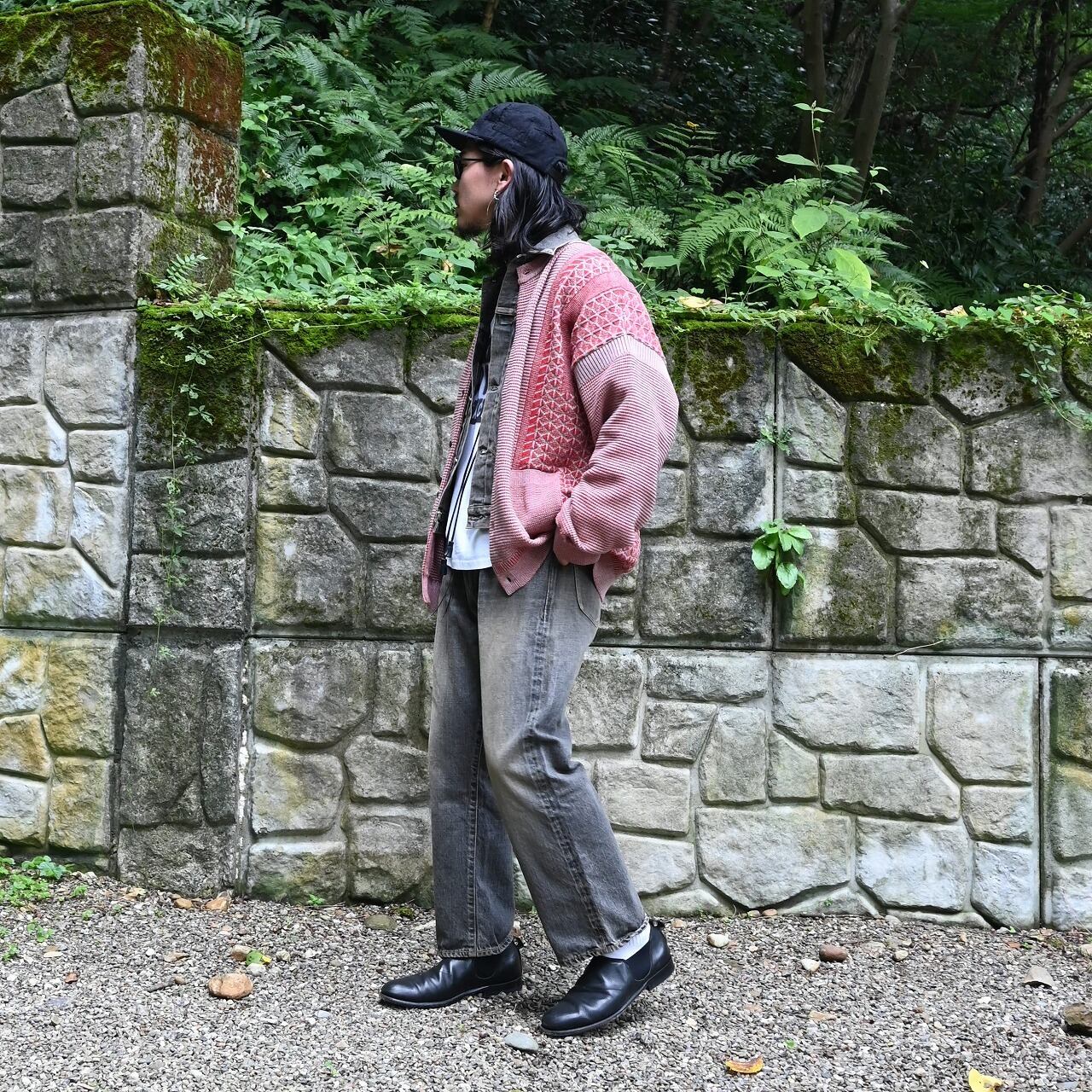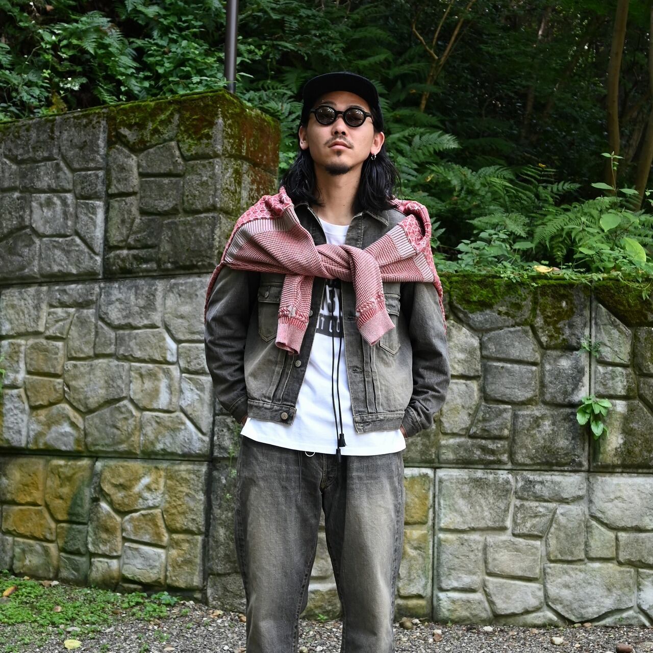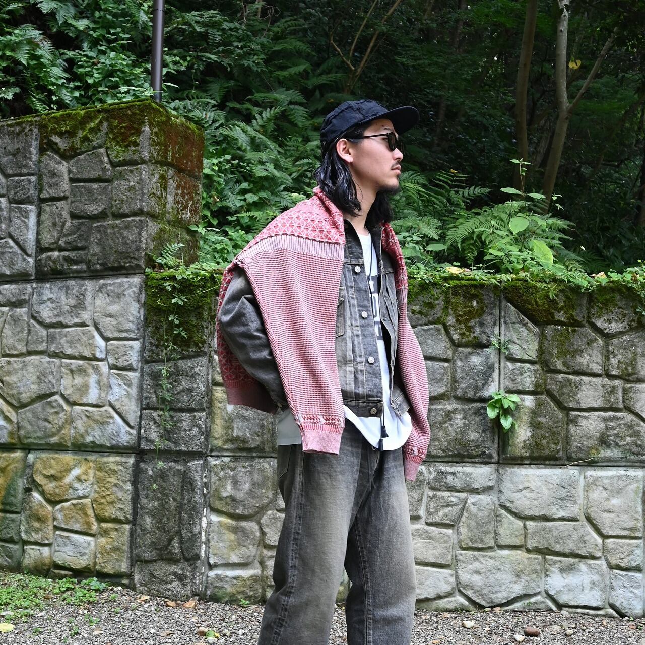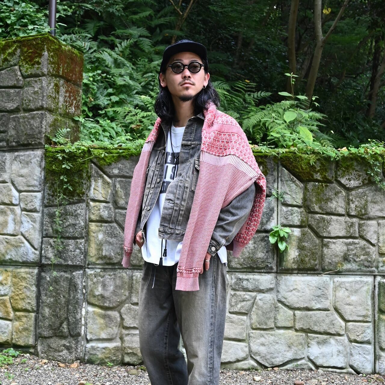 8月16日(土)13時発売となるGANKO別注 Ginka Cardigan(Yuki Momizi)をメイン着用。インテリムのデニムセットアップに上からカーディガンを合わせたカジュアルスタイル。KUONの襤褸キャップとLEH(レー)のプリントTEEを合わせてストリート感をプラス。