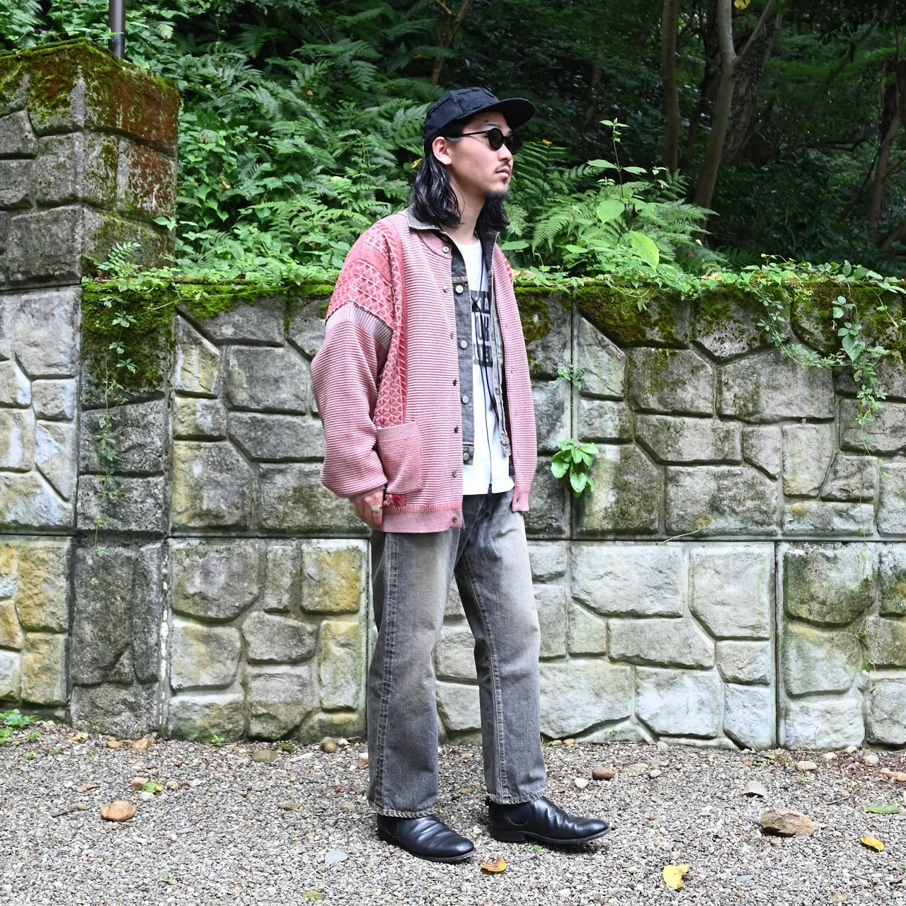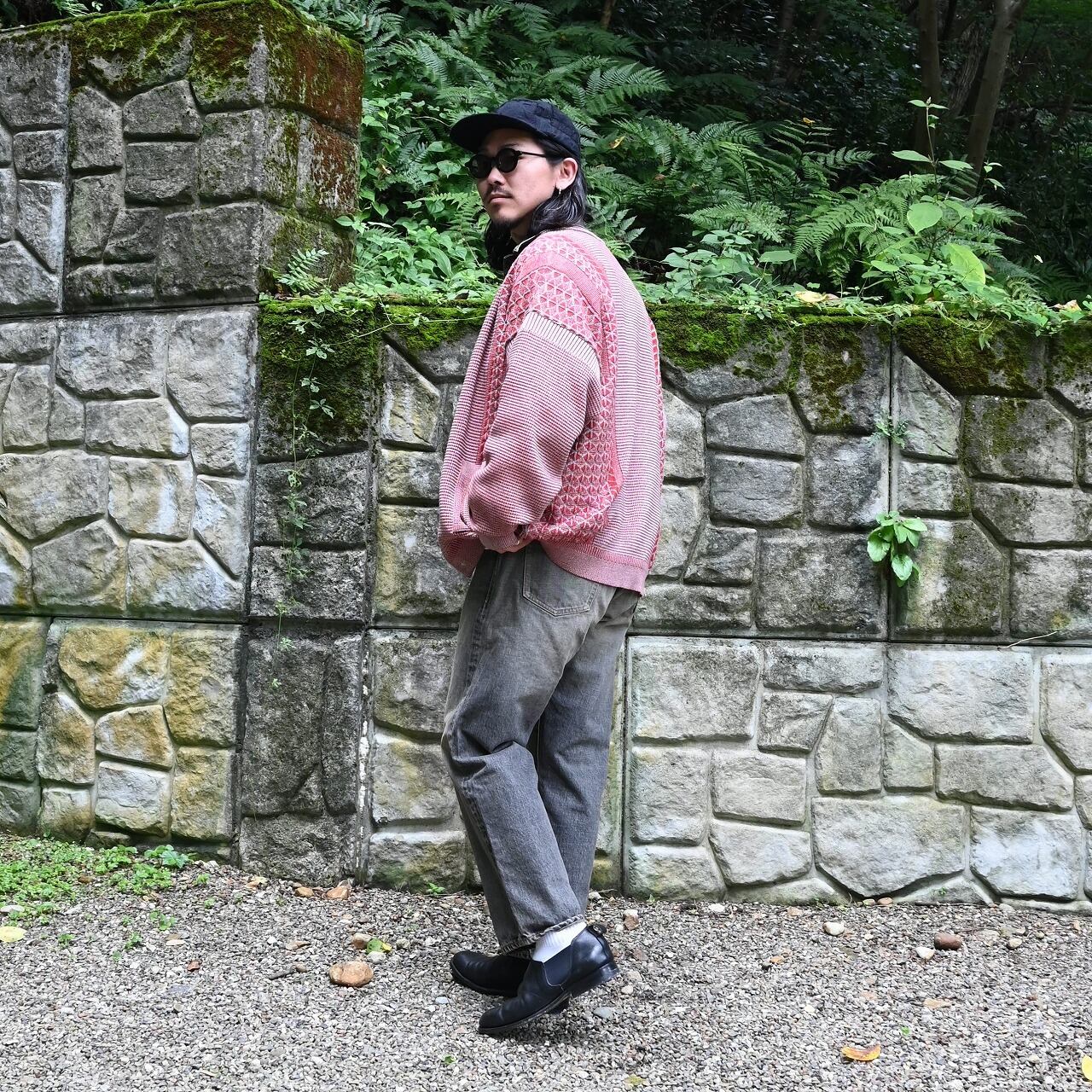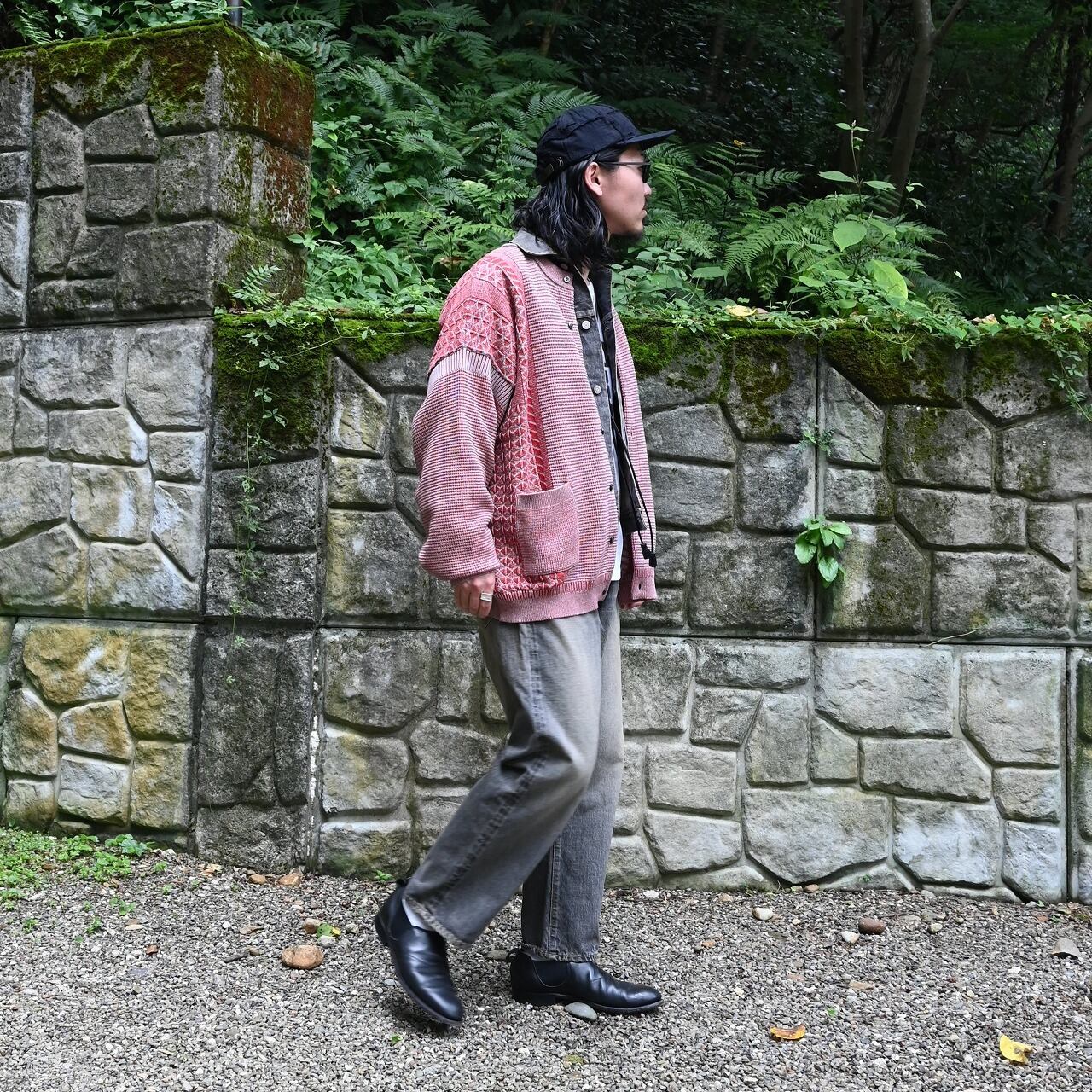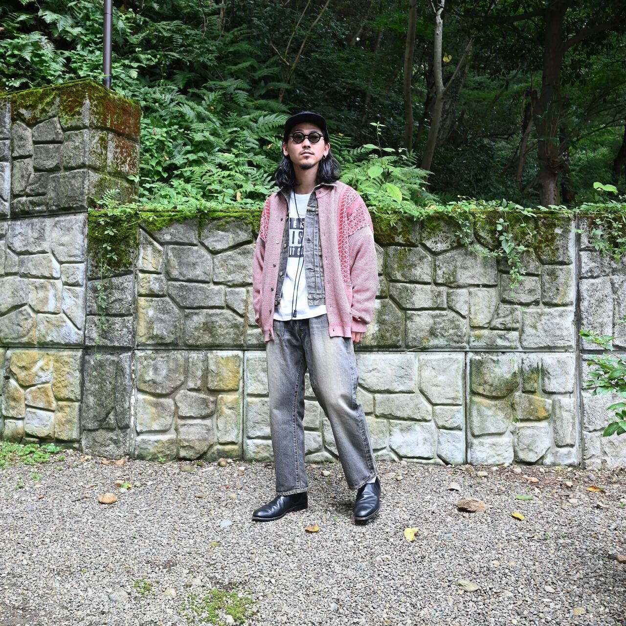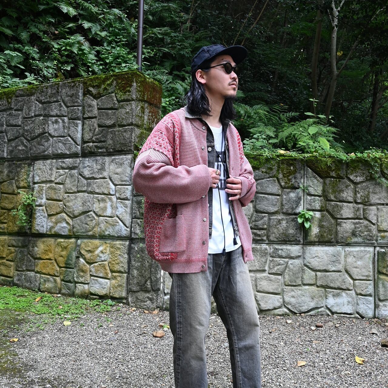 8月16日(土)13時発売となるGANKO別注 Ginka Cardigan(Yuki Momizi)をメイン着用。インテリムのデニムセットアップに上からカーディガンを合わせたカジュアルスタイル。KUONの襤褸キャップとLEH(レー)のプリントTEEを合わせてストリート感をプラス。