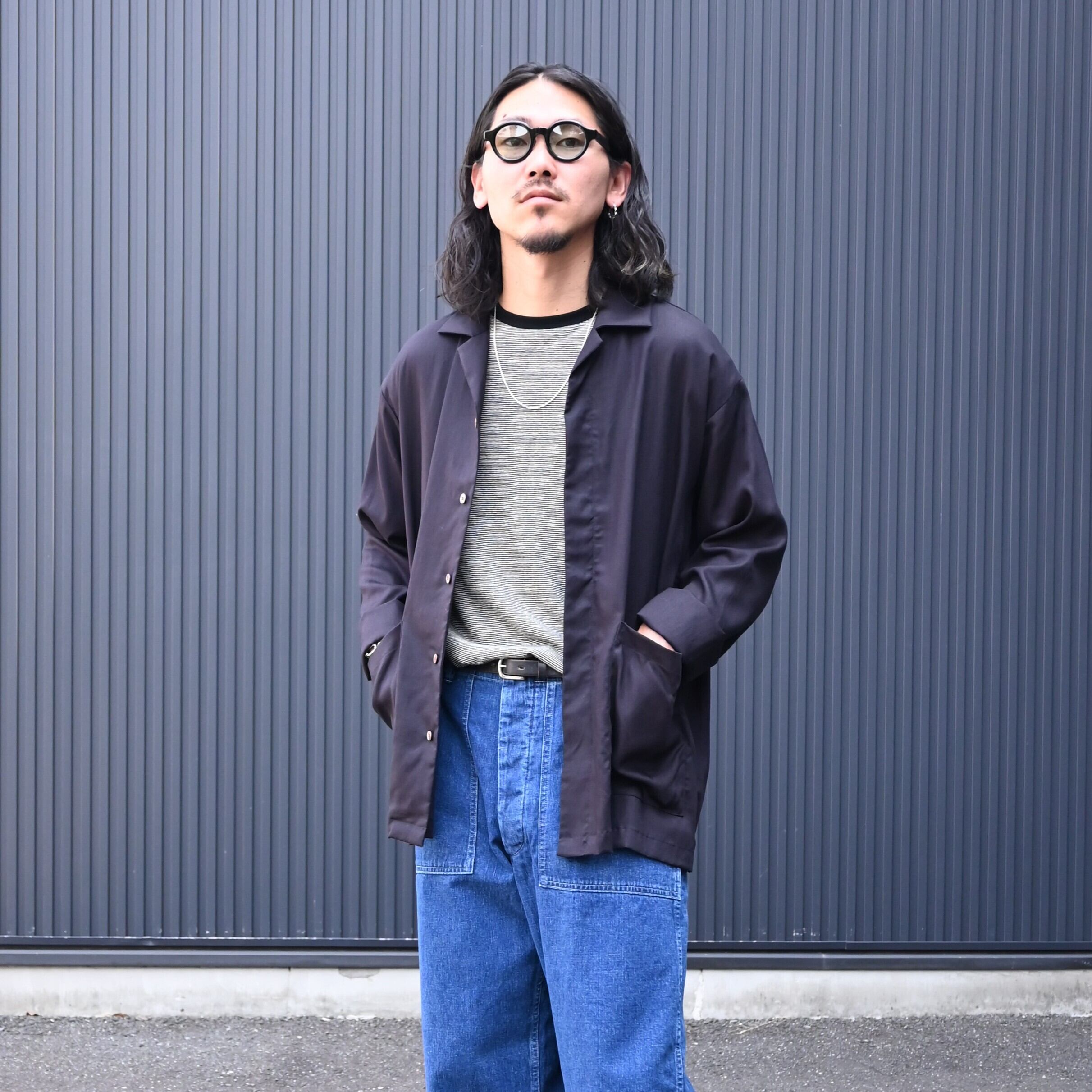 インテリムの HYPER BIG RAYON LINEN SHIRTS JACKETをメインにインナーにはCOTTON HEMP BORDER TEEを着用。