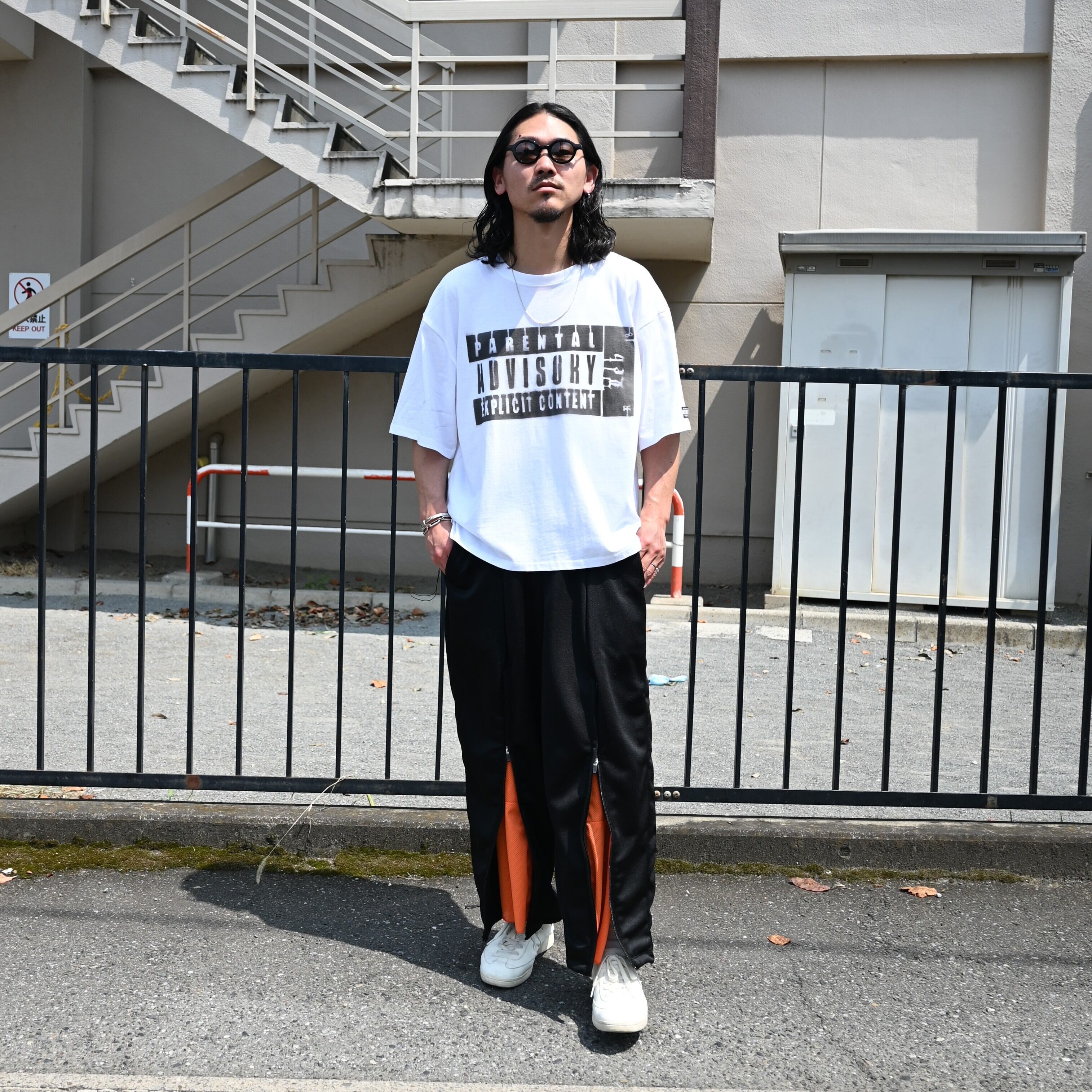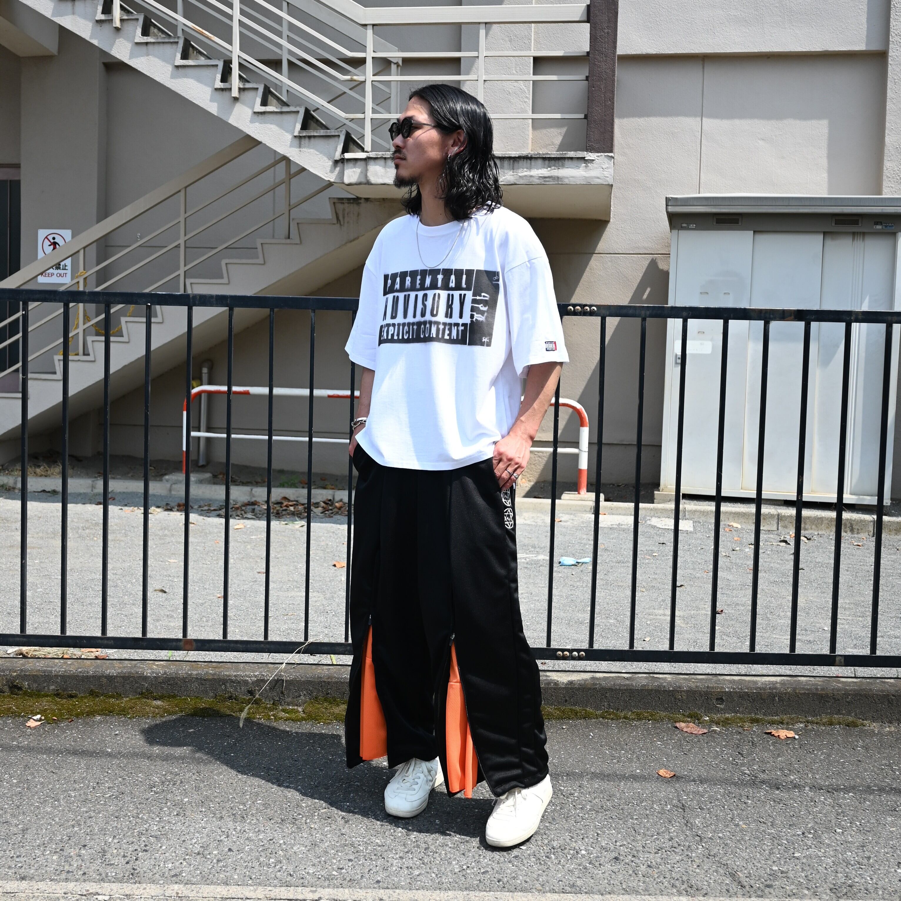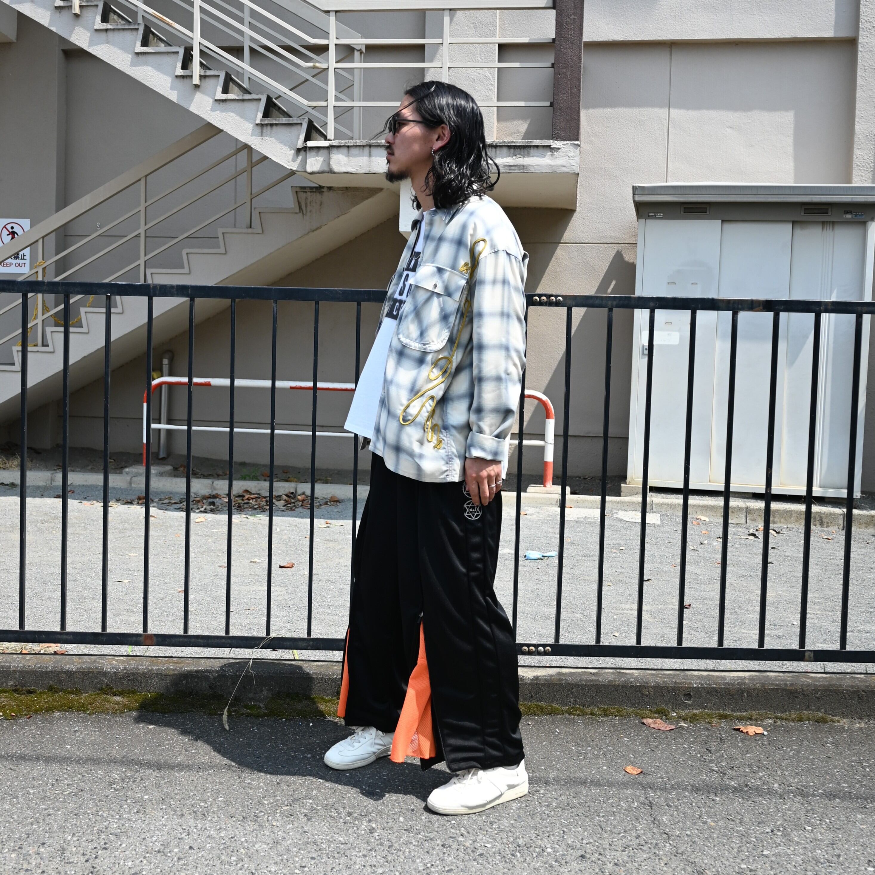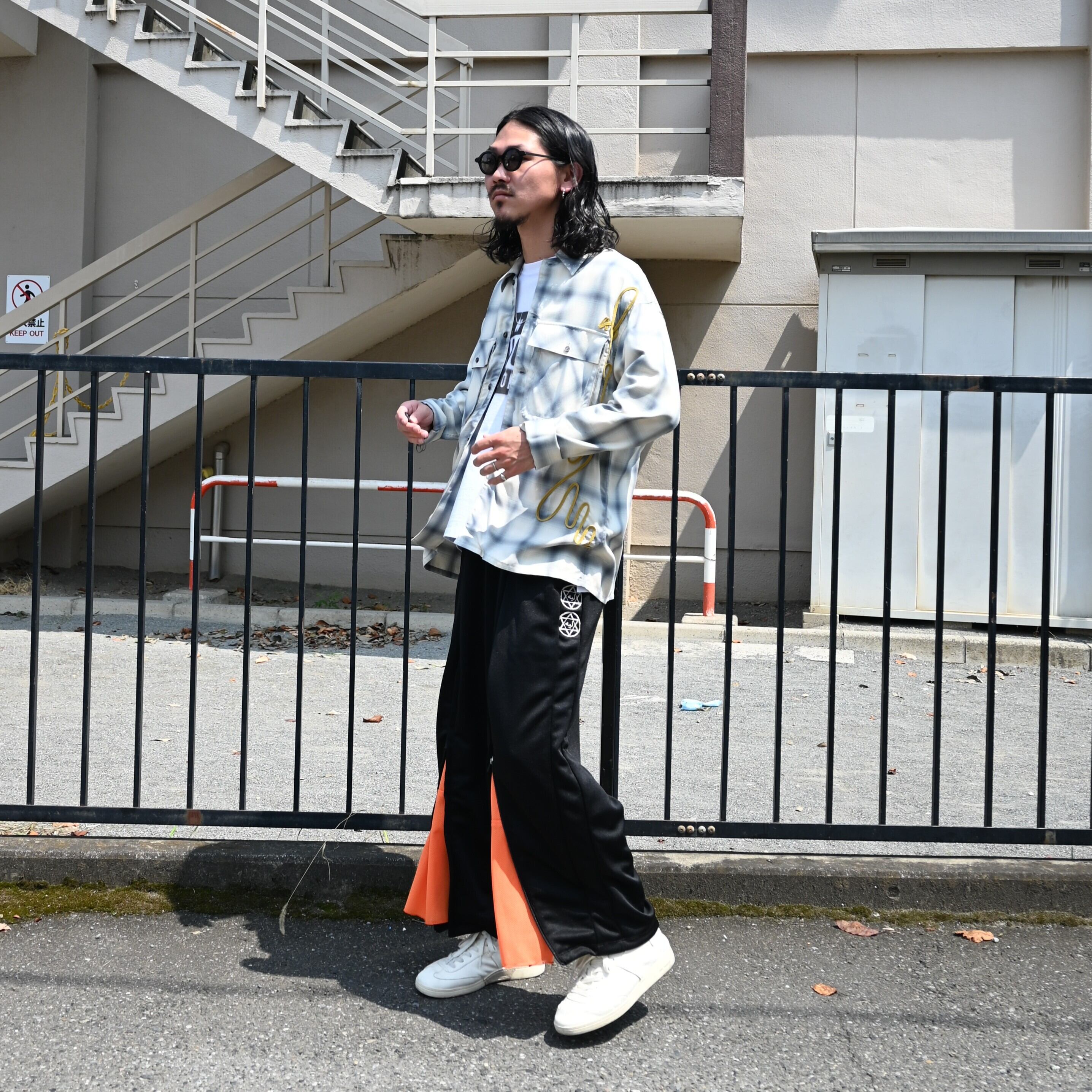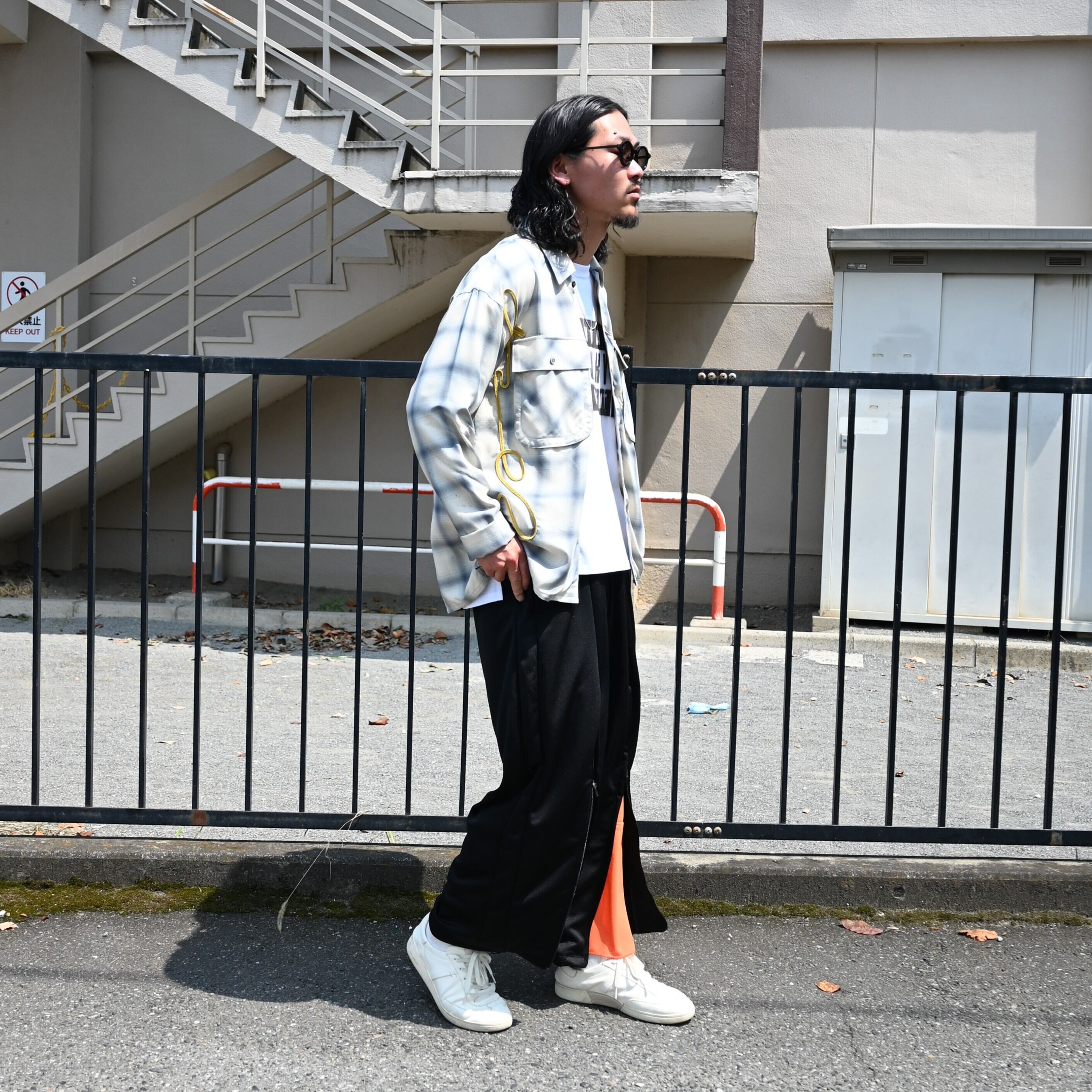 Leh(レー)25aw最新作となるZip Wide Track PantsをメインにEmbroidery Check Shirts、ADVISORY Big Size Slit T-SHをセットで合わせました。ジッパー開閉によりフレアのようなシルエットに変更可能な万能トラックパンツは内側にメッシュ生地が張られており、オレンジカラーがスタイリングの差し色に。