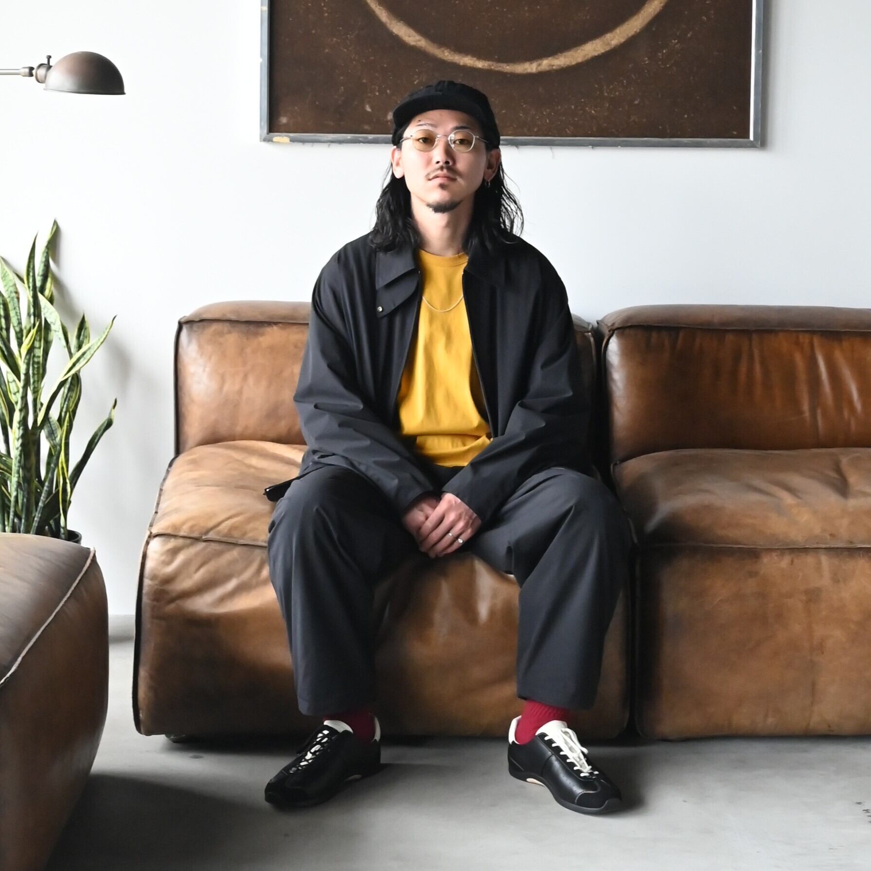 25AW新規取り扱いのploduct twelve(プロダクトトゥウェルブ)、City Active Warm JacketとCity Active Warm Pantsをセットアップ着用、インナーにKUON(クオン)Sashiko Teeマスタードカラーを合わせてスタイリングの差し色に。