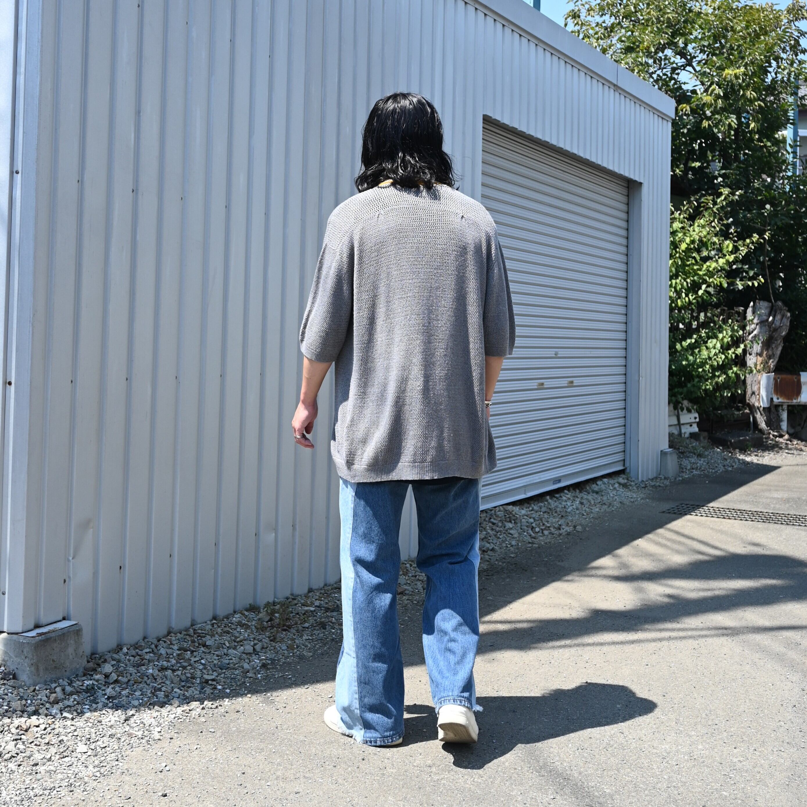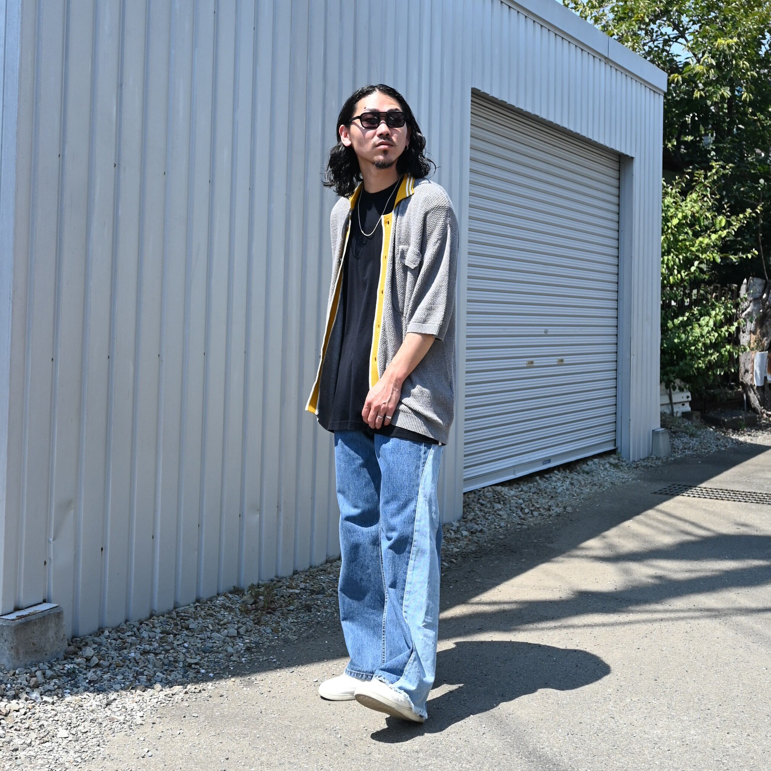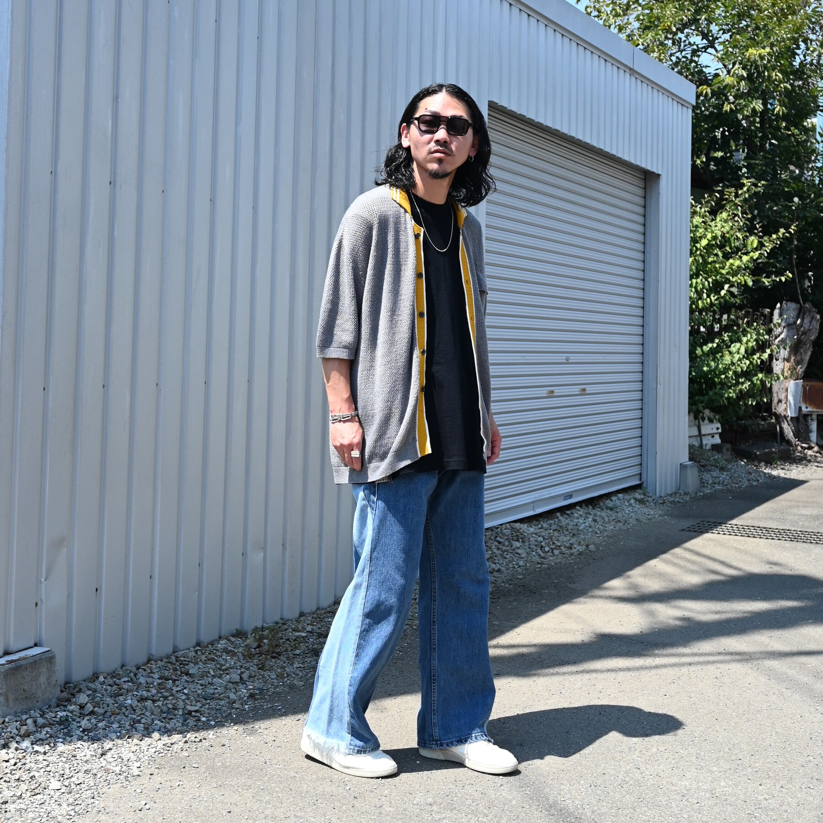SILENCE(サイレンス) Polo S/S ShirtsをメインにインナーにKUON(クオン)のノースリーブタンクトップを合わせ、CHANGES(チェンジーズ)のWIDE DENIM PANTS IND(1)を着用。カシミア混のメッシュニットは肌触りがよく、通気性も抜群なのでストレスフリーな着心地がございます。