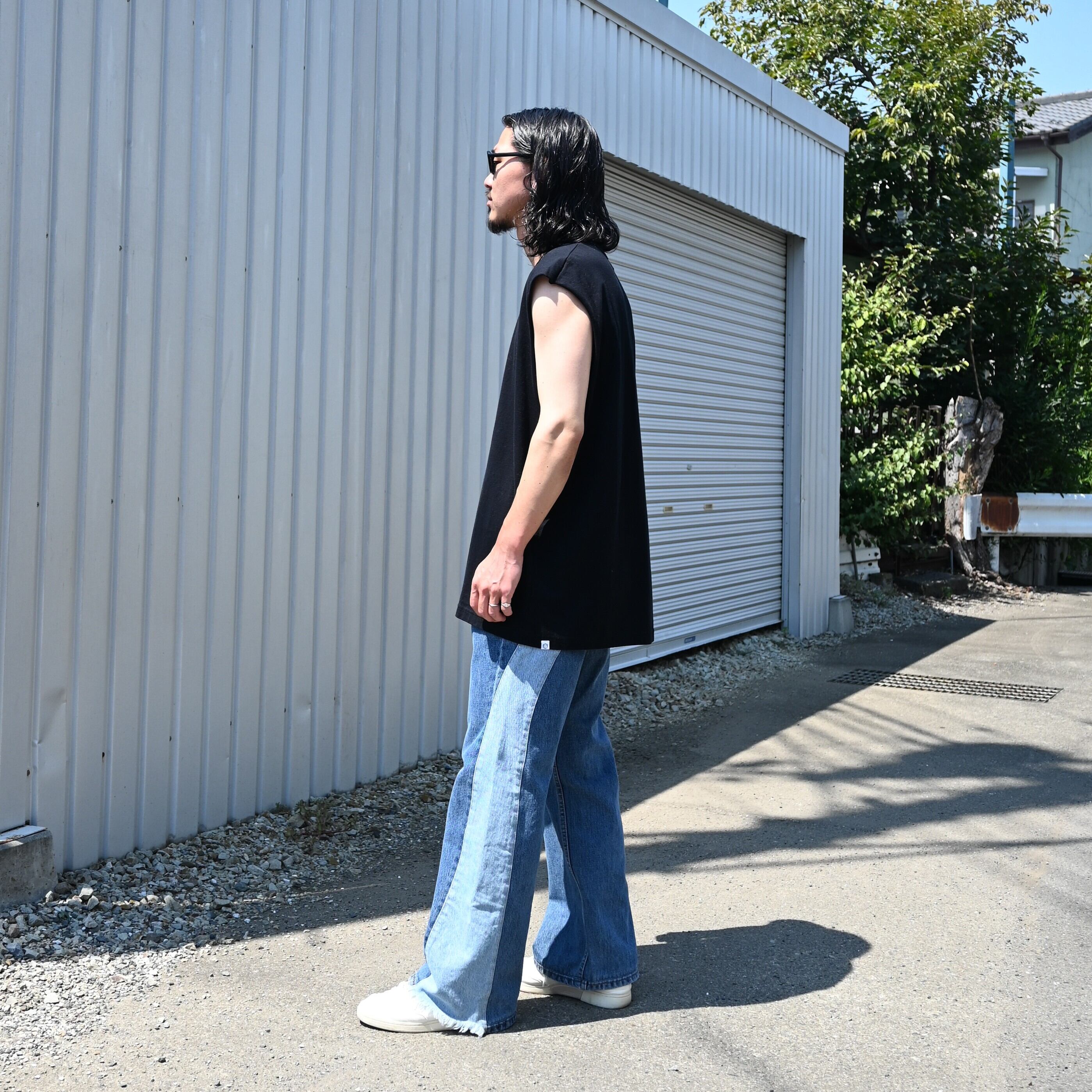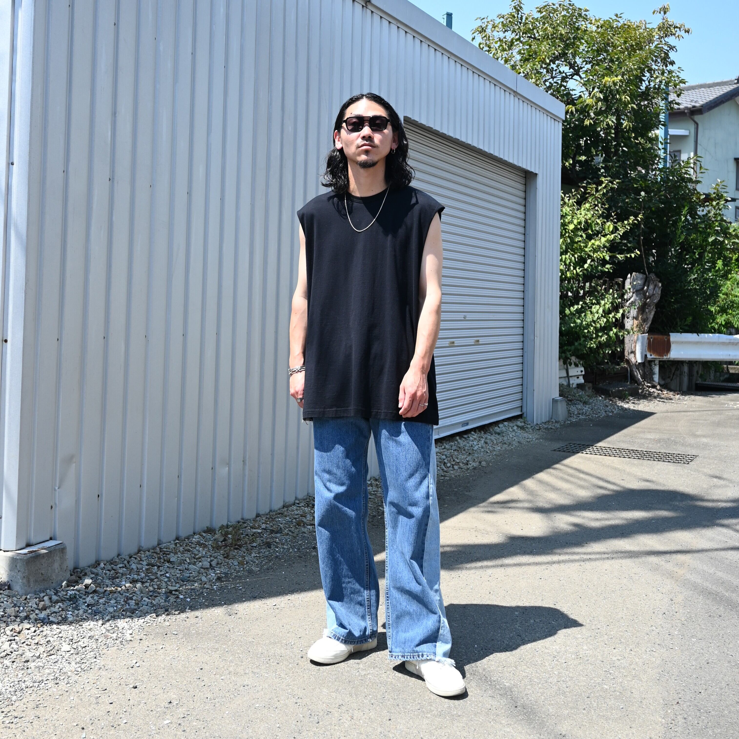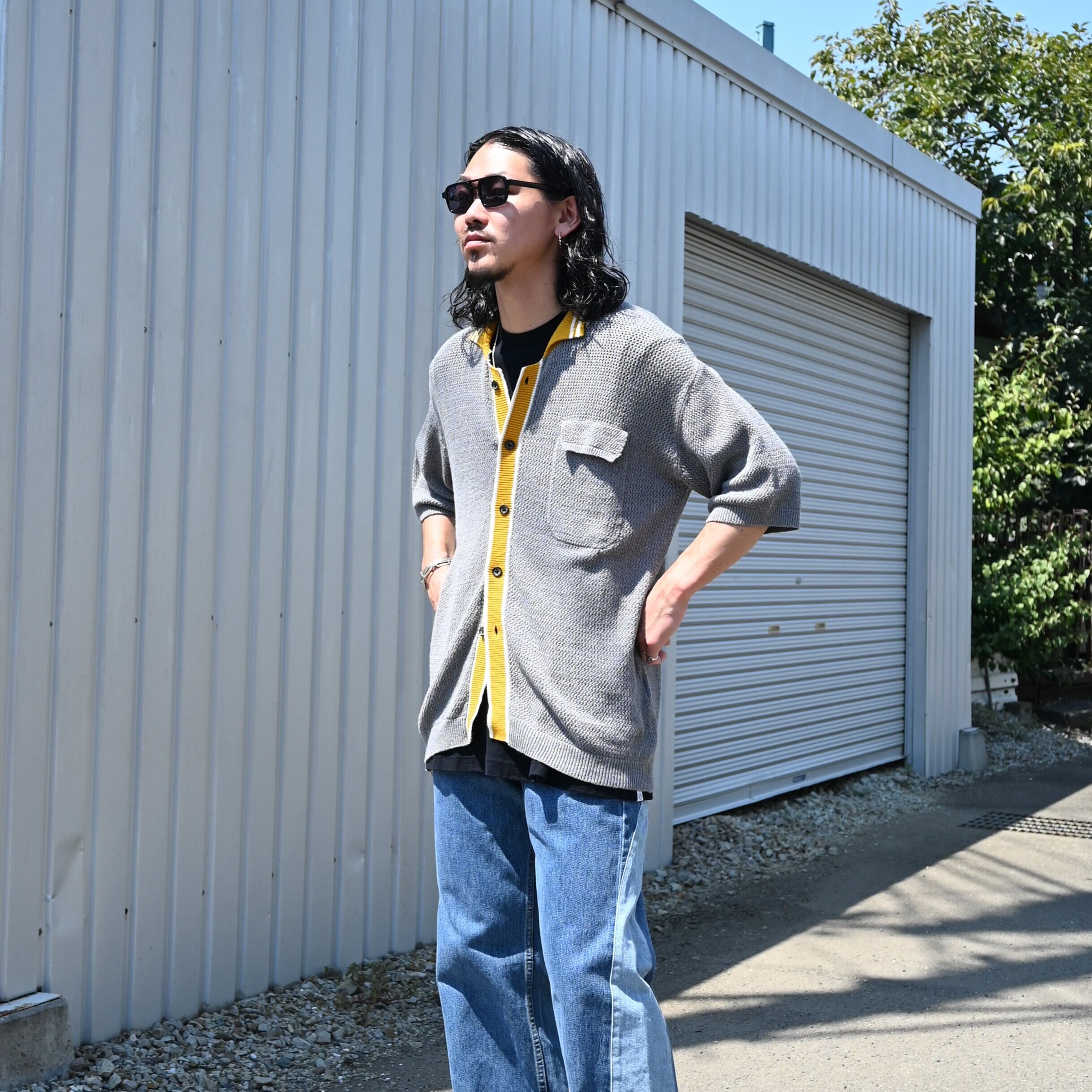 SILENCE(サイレンス) Polo S/S ShirtsをメインにインナーにKUON(クオン)のノースリーブタンクトップを合わせ、CHANGES(チェンジーズ)のWIDE DENIM PANTS IND(1)を着用。カシミア混のメッシュニットは肌触りがよく、通気性も抜群なのでストレスフリーな着心地がございます。