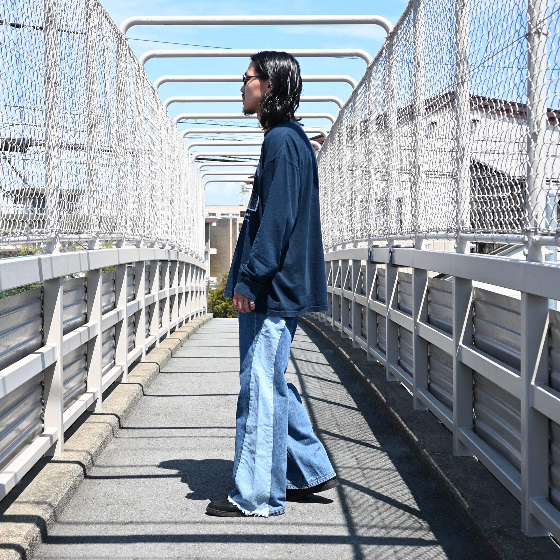 VINTAGEザ・ビートルズ ロングスリーブシャツをメイン使いしてコーディネート。UNTRACE / 173(ジップフーディー)を合わせ、CHANGES(チェンジーズ)の WIDE DENIM PANTS IND(1)を着用。アントレースのパーカーを合わせることで、ヴィンテージ感が軽減され洗練されたスタイルに。