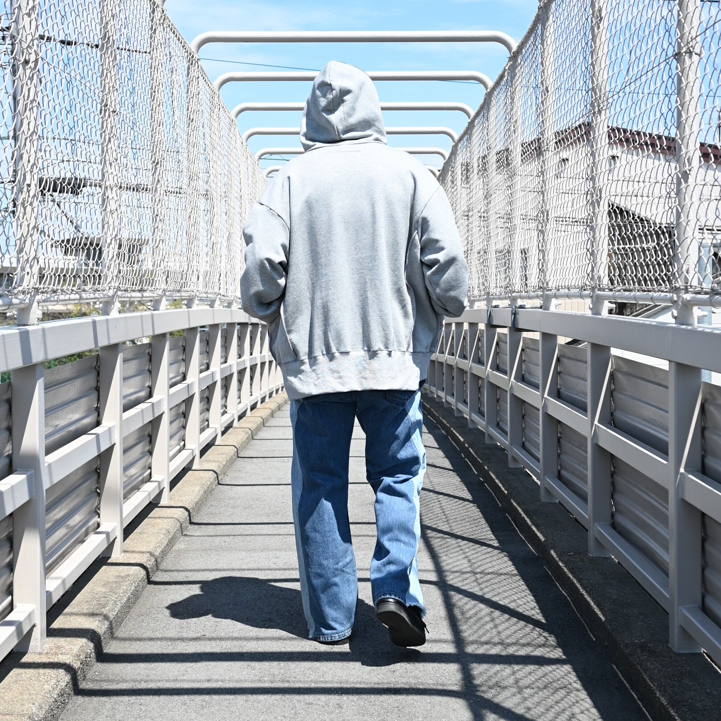 By adding the UNTRACE hoodie, the vintage feel is softened, creating a more refined look.