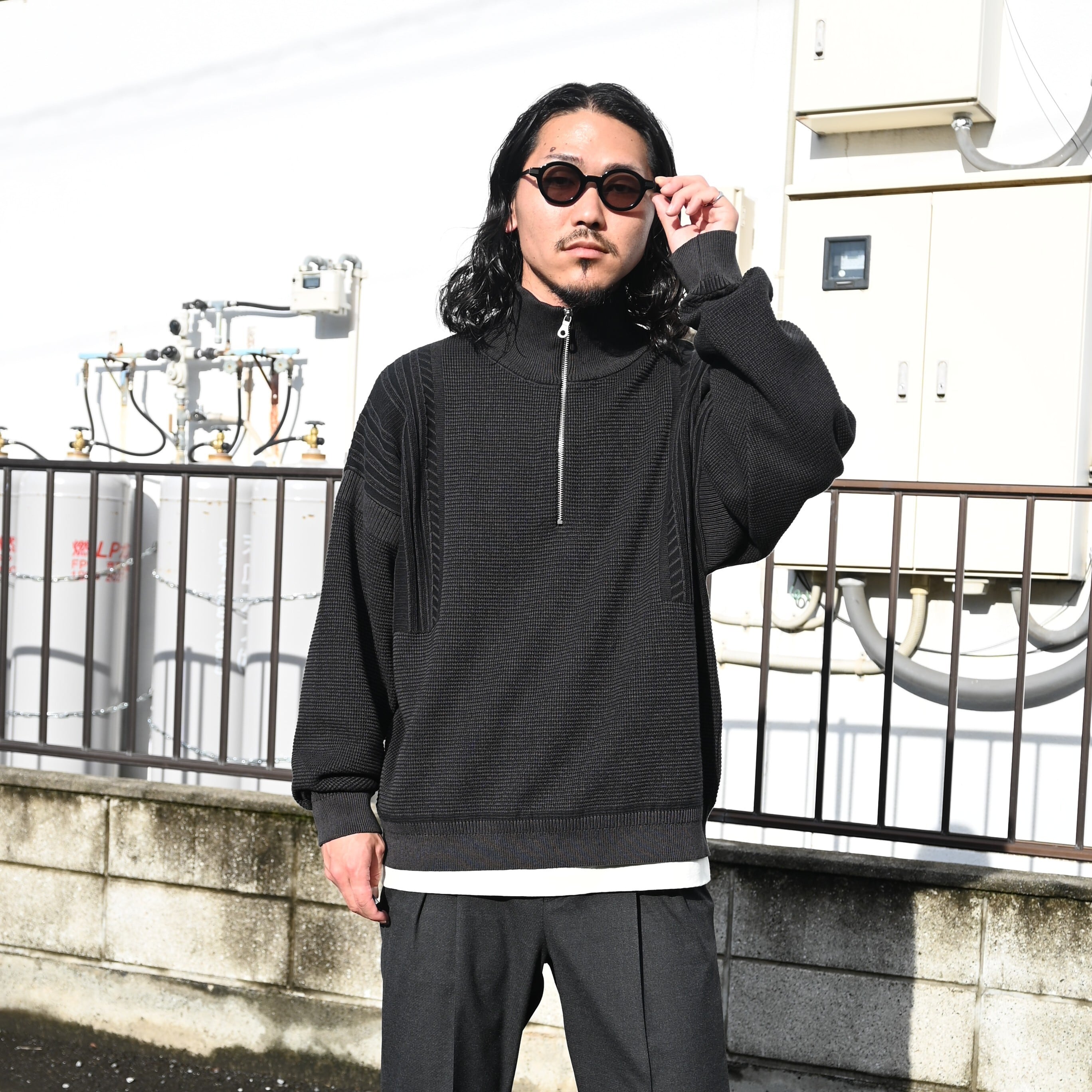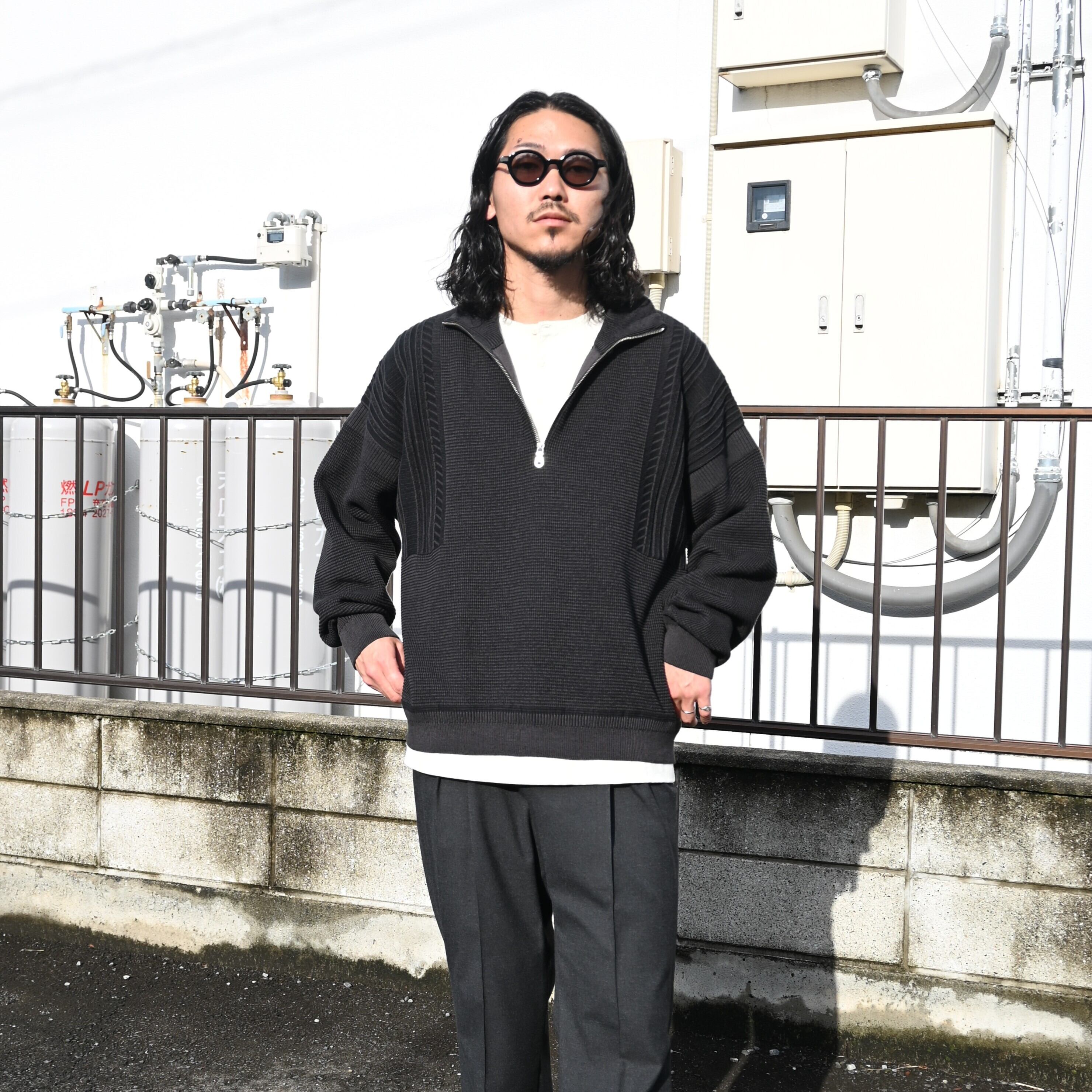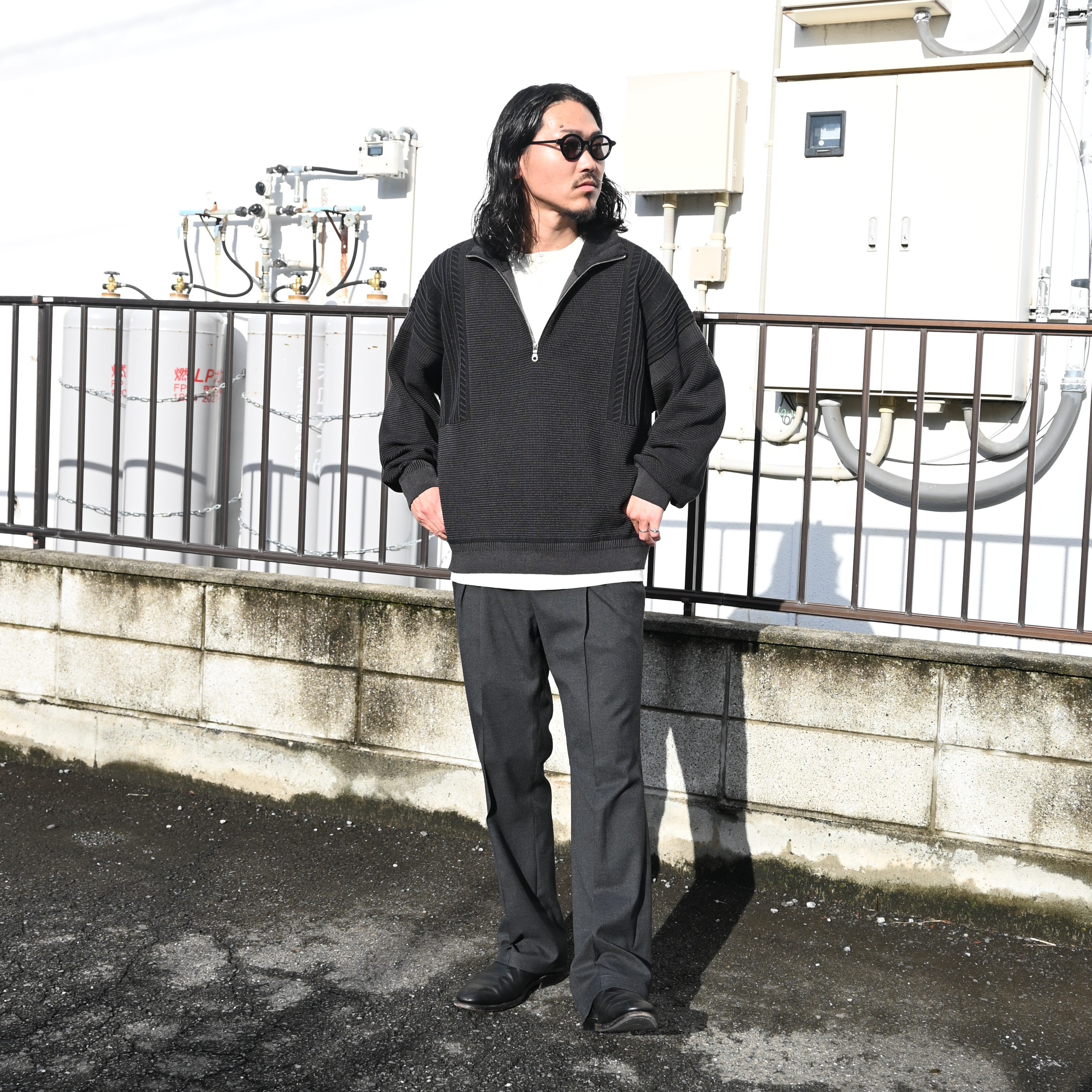YASHIKI(ヤシキ)新作バイイング事故発生のハーフジップニットブラックのスタイリング。
