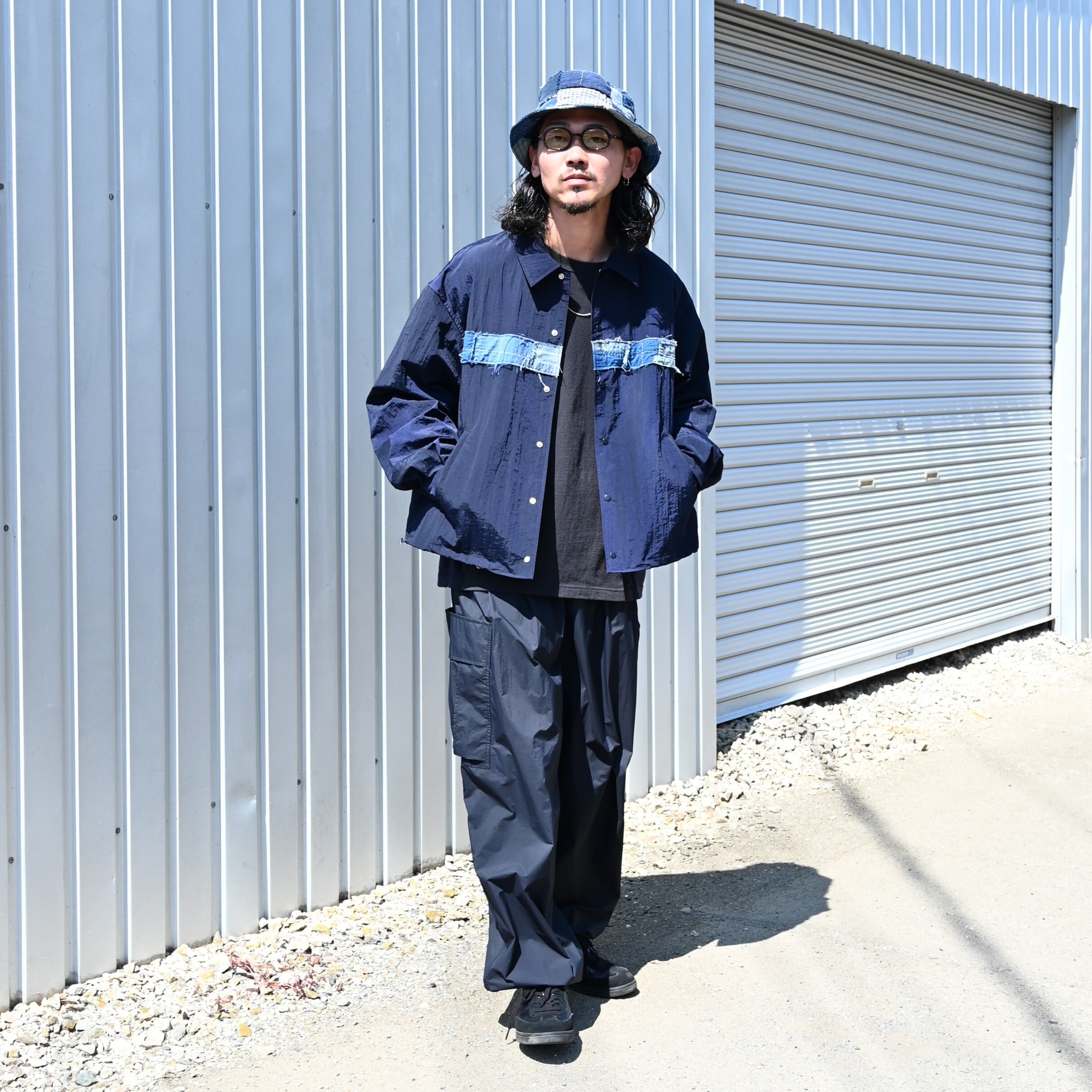 KUON(クオン)の秋口に最適な襤褸生地を使用したライトアウター。着ていないと思うほど軽量で楽です。インナーにスウェットやパーカー、ニットなどを着込めば真冬も着まわすことができます。NYLON素材にもかかわらず、裏地をアクリルコーティングとインディゴ染したことによりNYLON特有の光沢感が抑えられて、安っぽくない、他にはないコーチジャケットになっております。