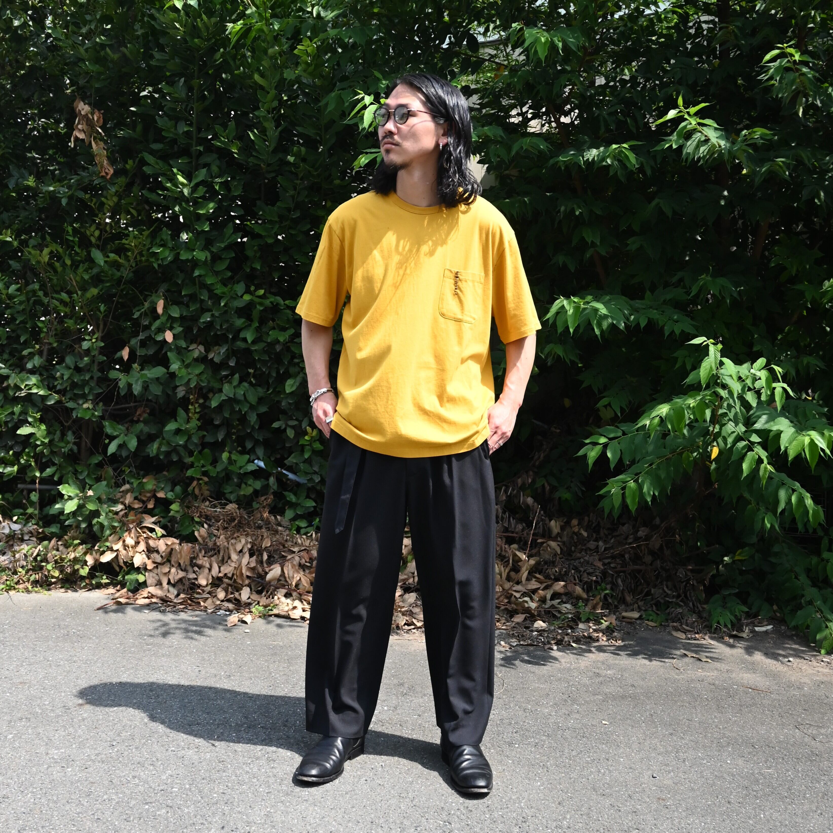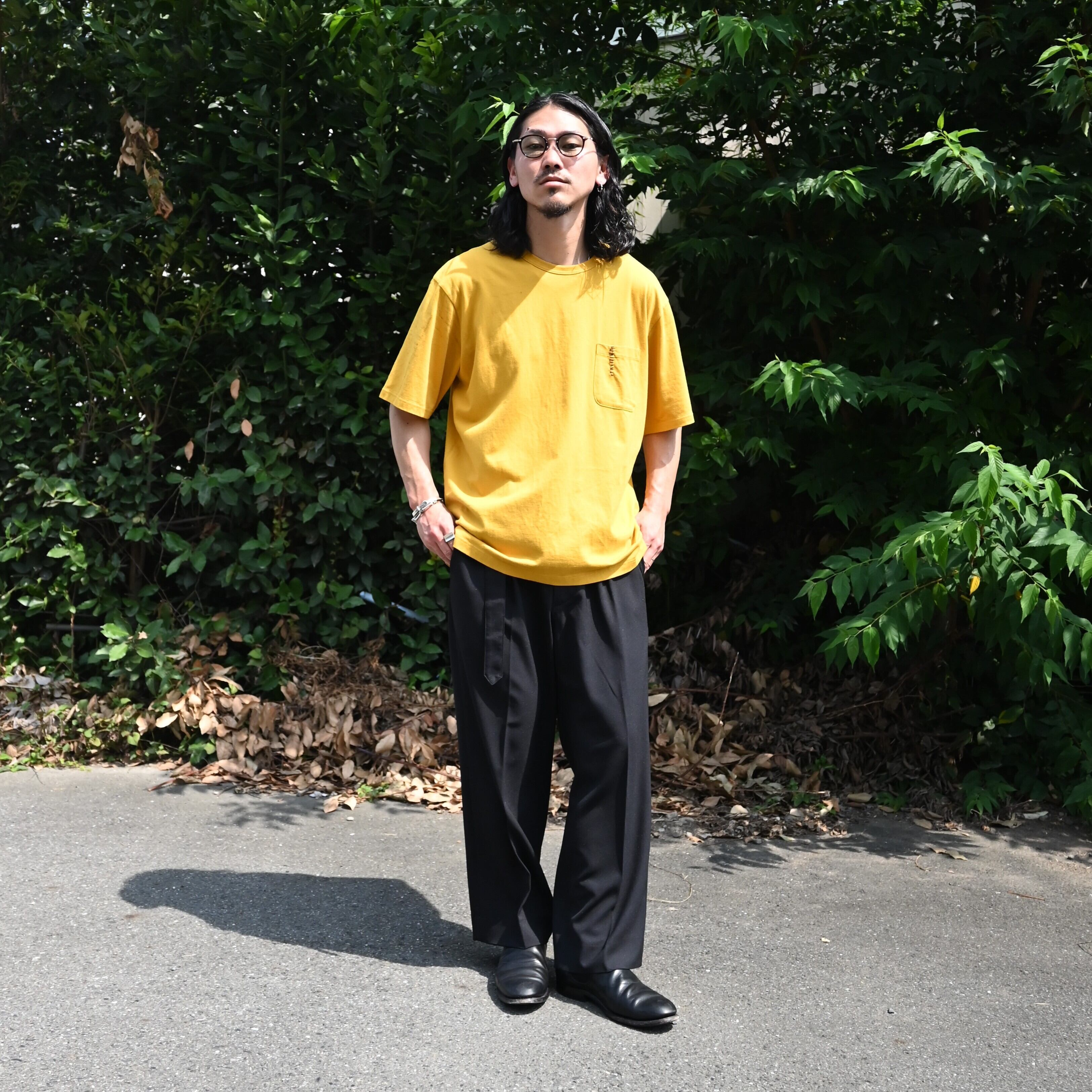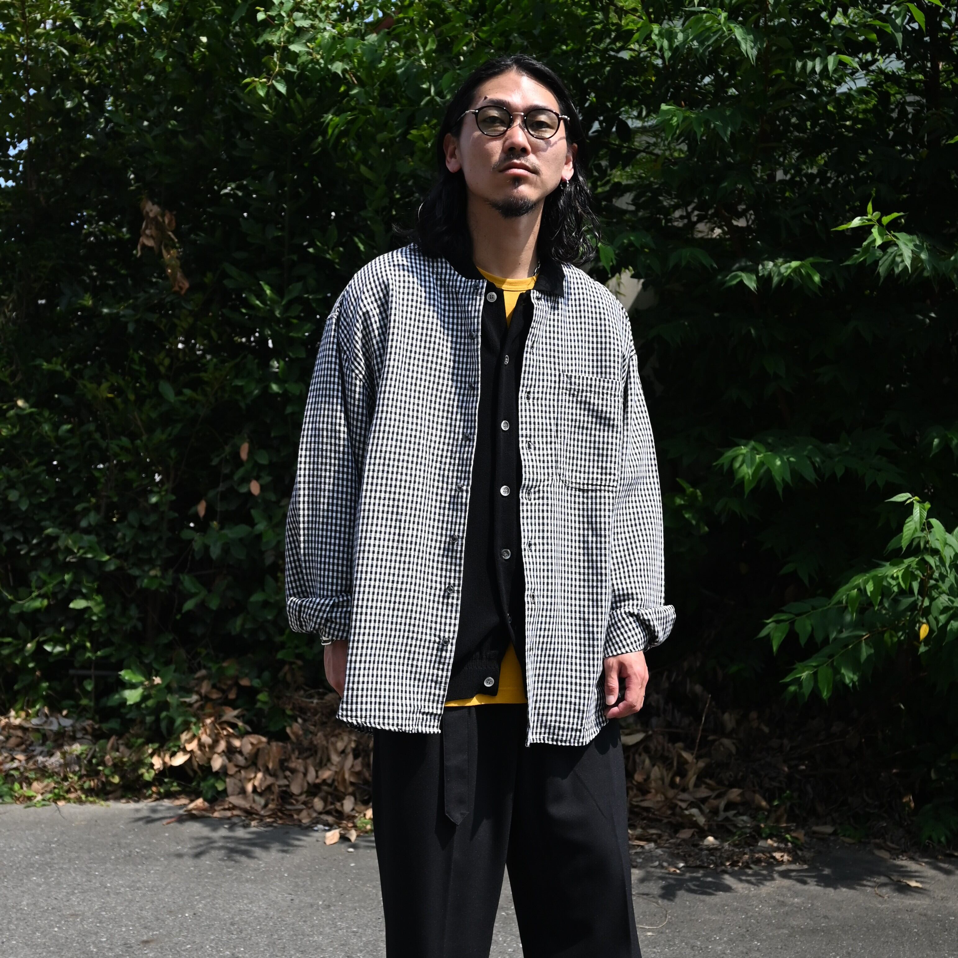 80年~90年代のグーチデッドストックシャツをメインにインナーにYASHIKI(ヤシキ)のニットベストを合わせKUON(クオン)のスラックスを着用。差し色にKUON(クオン)Sashiko Teeを合わせてファッションライクなスタイルに。