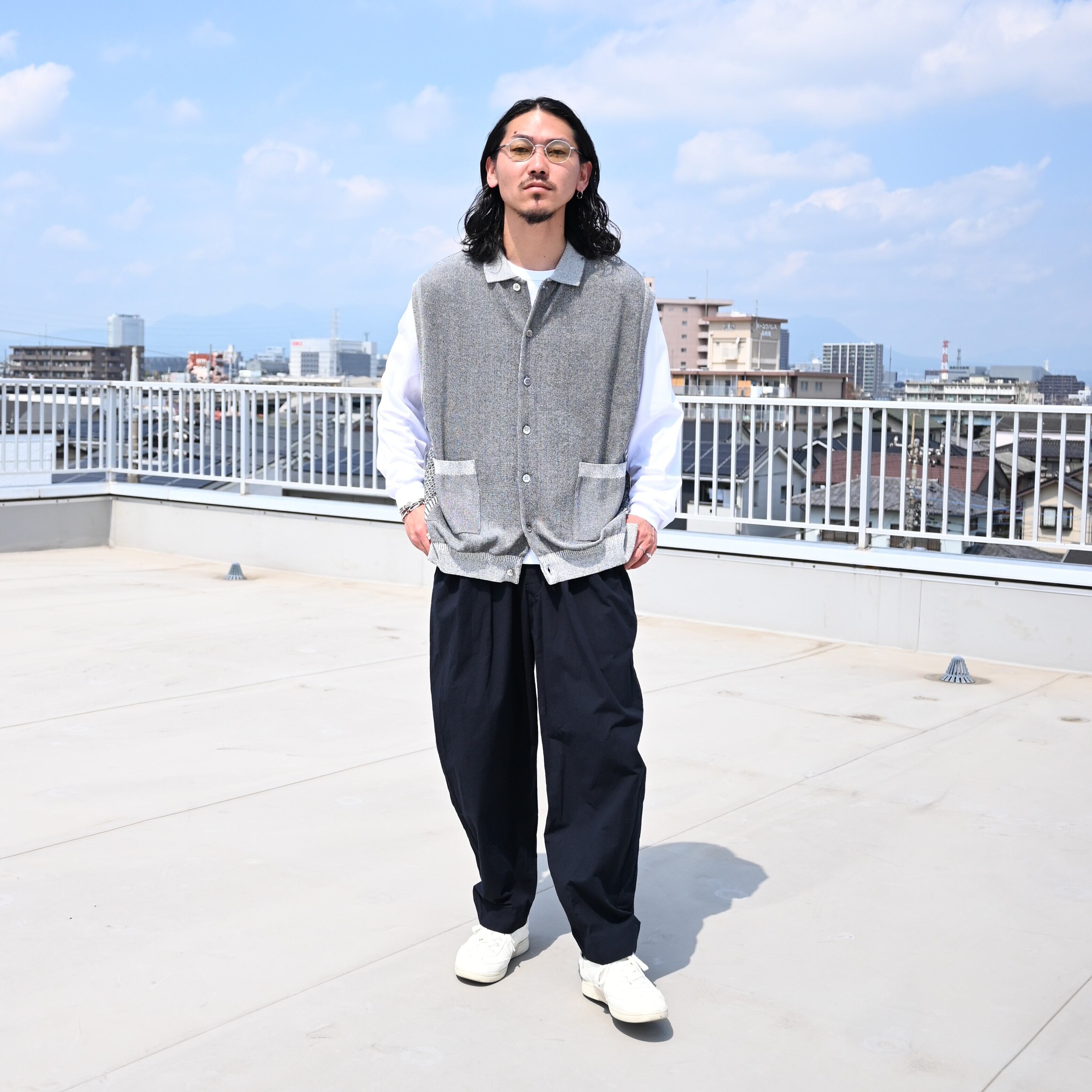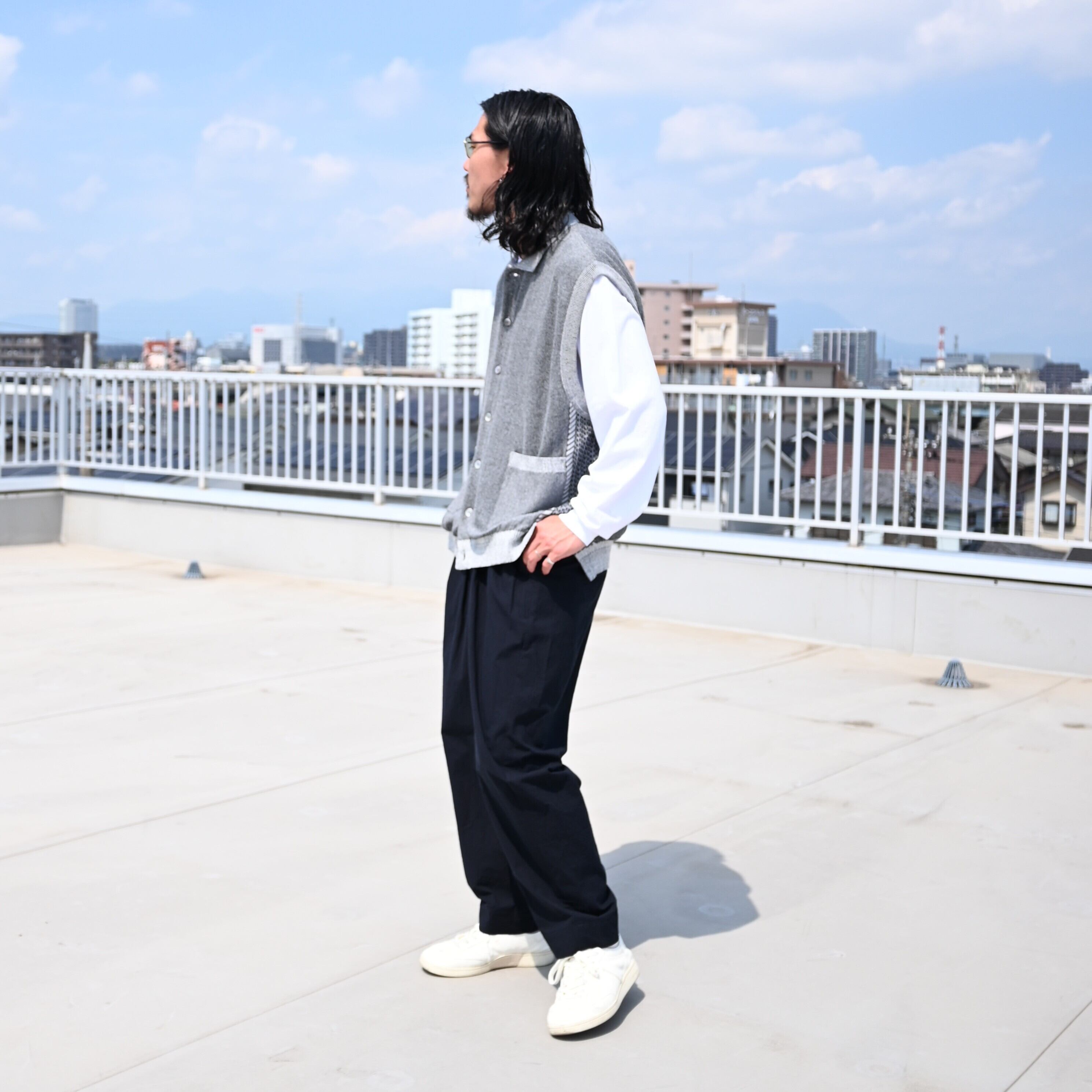 Styling with a vintage Goodhood deadstock shirt from the ’80s–’90s as the main piece, layered with a YASHIKI knit vest and paired with LEH Gurkha pants. The 100% linen Goodhood shirt and the cotton-silk Gurkha pants blend seamlessly, creating a look that is casual yet refined.