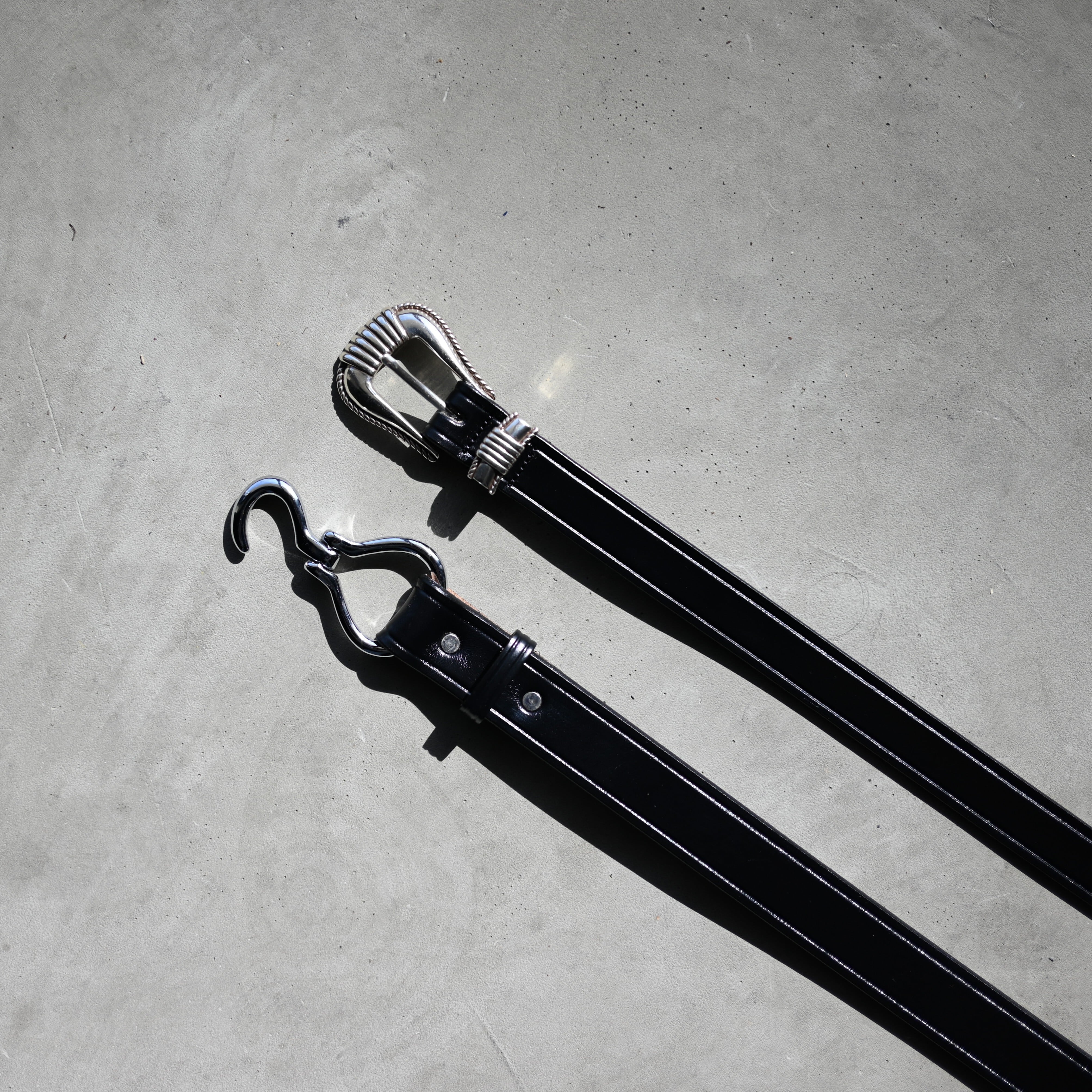 ・程よいサイズ幅のベルトにウエスタン調の真鍮バックル、剣先が付くことでラグジュアリーな印象に