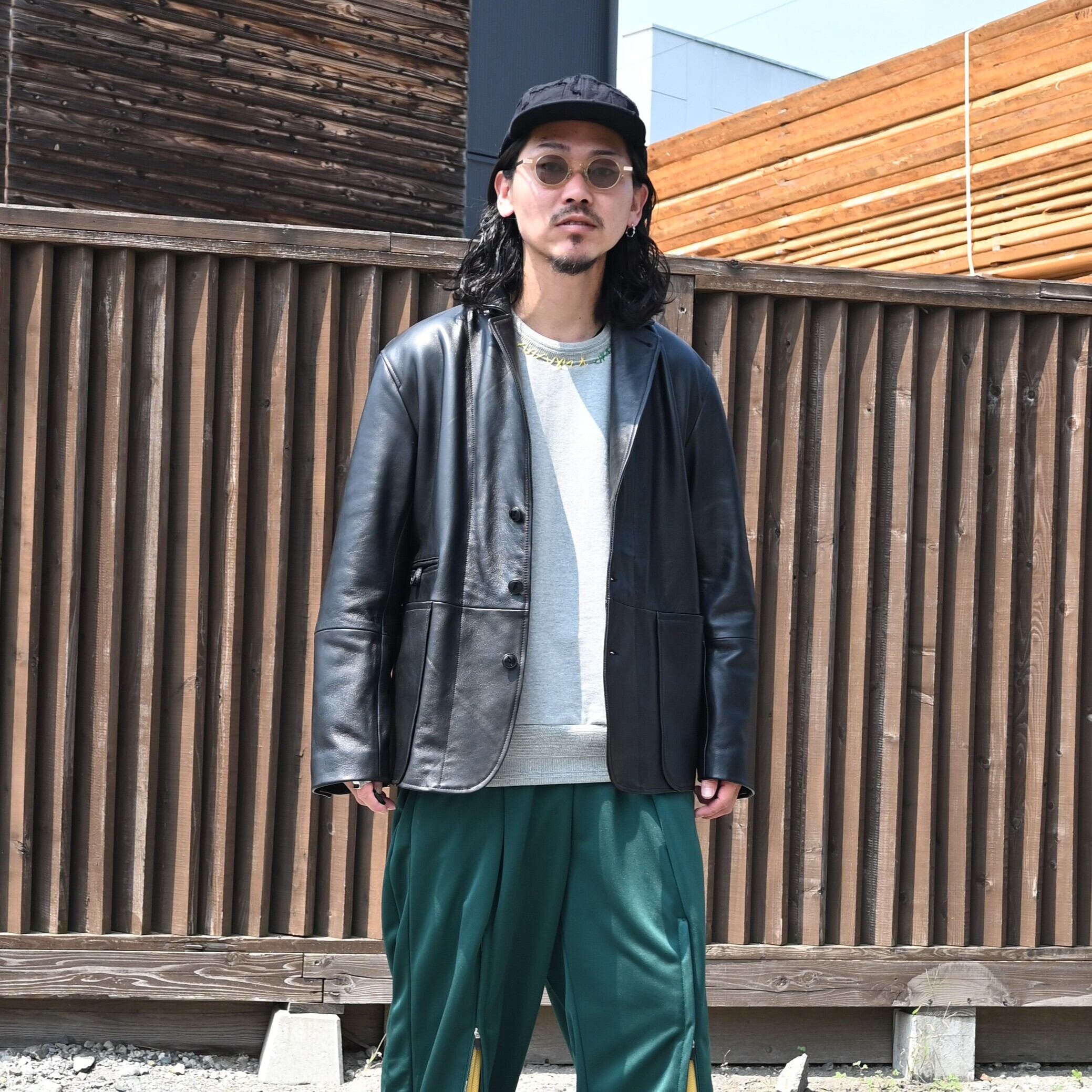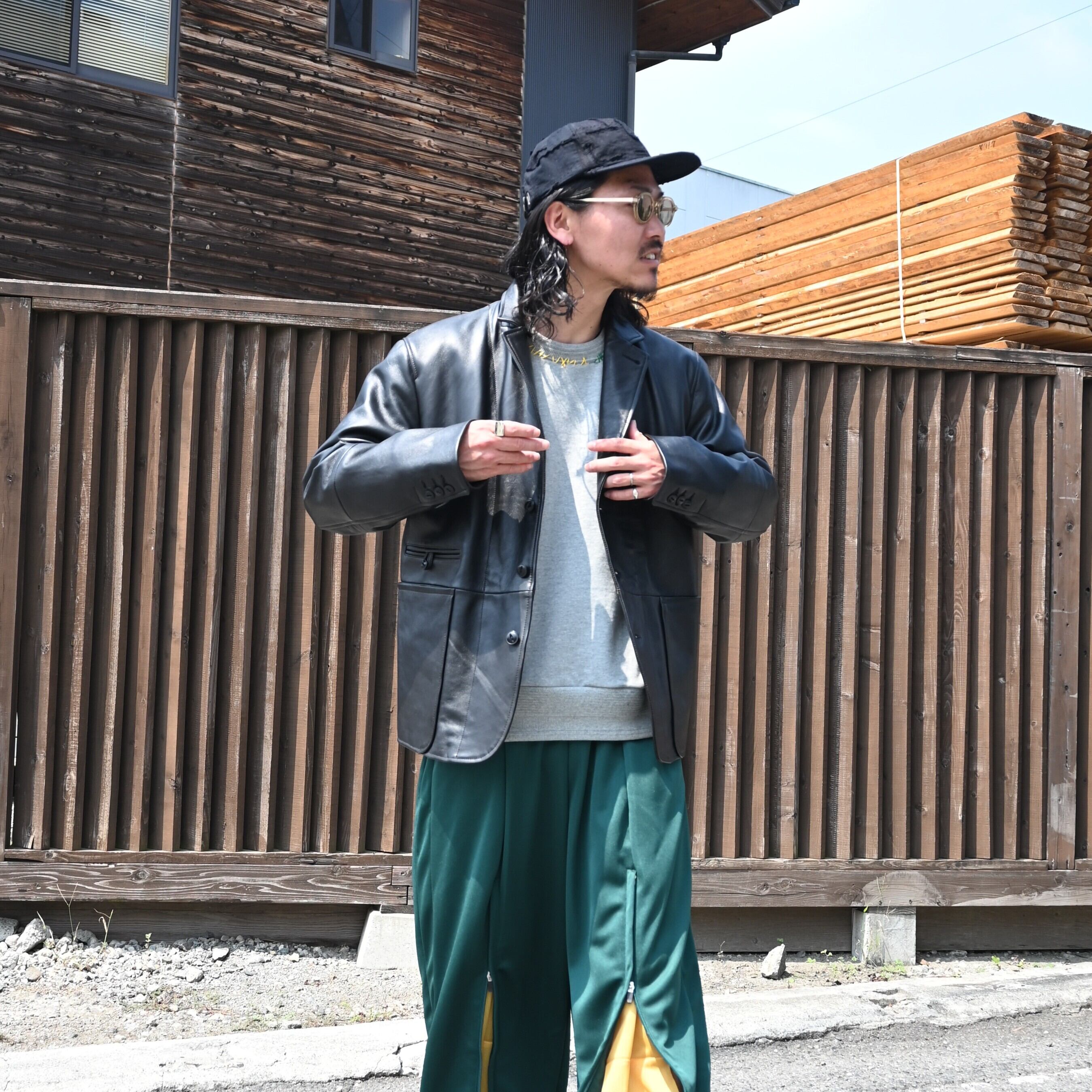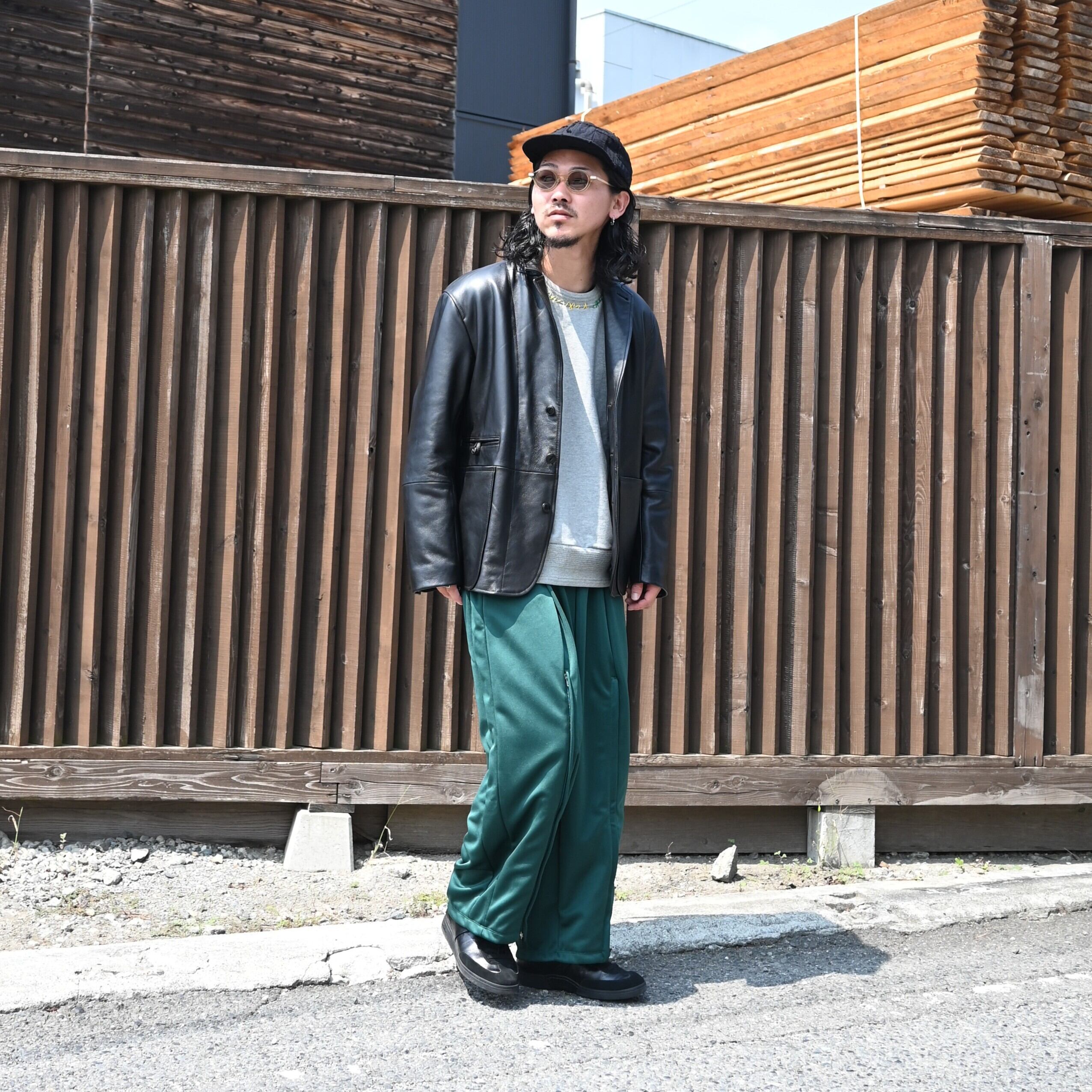 今回のコーディネートはCCU(シーシーユー)のレザージャケットをメインにハズシでLEH(レー)のトラックパンツを合わせています。